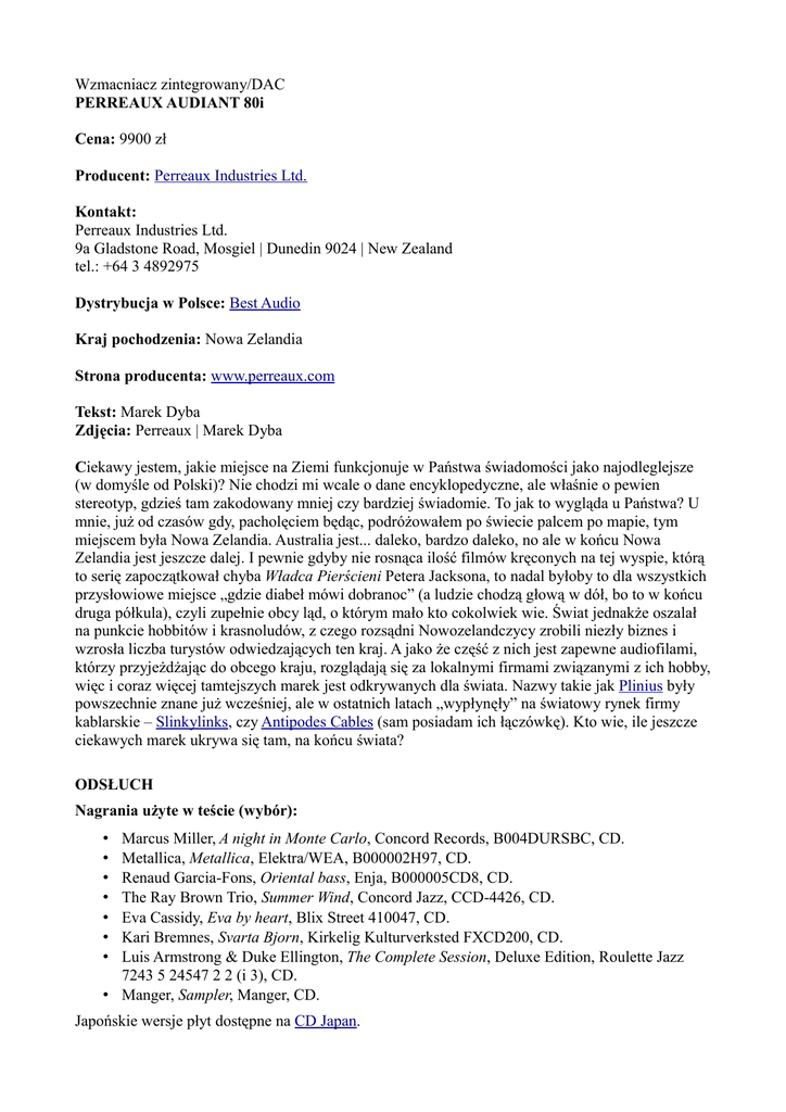 Wzmacniacz zintegrowany/DAC PERREAUX AUDIANT 80i Cena: 9900 zł Producent: Perreaux Industries Ltd. Kontakt: Perreaux Industries Ltd. 9a Gladstone Road, Mosgiel | Dunedin 9024 | New Zealand tel.: +64 3 4892975 Dystrybucja w Polsce: Best Audio Kraj pochodzenia: Nowa Zelandia Strona producenta: www.perreaux.com Tekst: Marek Dyba Zdjęcia: Perreaux | Marek Dyba Ciekawy jestem, jakie miejsce na Ziemi funkcjonuje w Państwa świadomości jako najodleglejsze (w domyśle od Polski)? Nie chodzi mi wcale o dane encyklopedyczne, ale właśnie o pewien stereotyp, gdzieś tam zakodowany mniej czy bardziej świadomie. To jak to wygląda u Państwa? U mnie, już od czasów gdy, pacholęciem będąc, podróżowałem po świecie palcem po mapie, tym miejscem była Nowa Zelandia. Australia jest... daleko, bardzo daleko, no ale w końcu Nowa Zelandia jest jeszcze dalej. I pewnie gdyby nie rosnąca ilość filmów kręconych na tej wyspie, którą to serię zapoczątkował chyba Władca Pierścieni Petera Jacksona, to nadal byłoby to dla wszystkich przysłowiowe miejsce „gdzie diabeł mówi dobranoc” (a ludzie chodzą głową w dół, bo to w końcu druga półkula), czyli zupełnie obcy ląd, o którym mało kto cokolwiek wie. Świat jednakże oszalał na punkcie hobbitów i krasnoludów, z czego rozsądni Nowozelandczycy zrobili niezły biznes i wzrosła liczba turystów odwiedzających ten kraj. A jako że część z nich jest zapewne audiofilami, którzy przyjeżdżając do obcego kraju, rozglądają się za lokalnymi firmami związanymi z ich hobby, więc i coraz więcej tamtejszych marek jest odkrywanych dla świata. Nazwy takie jak Plinius były powszechnie znane już wcześniej, ale w ostatnich latach „wypłynęły” na światowy rynek firmy kablarskie – Slinkylinks, czy Antipodes Cables (sam posiadam ich łączówkę). Kto wie, ile jeszcze ciekawych marek ukrywa się tam, na końcu świata? ODSŁUCH Nagrania użyte w teście (wybór): Marcus Miller, A night in Monte Carlo, Concord Records, B004DURSBC, CD. Metallica, Metallica, Elektra/WEA, B000002H97, CD. Renaud Garcia-Fons, Oriental bass, Enja, B000005CD8, CD. The Ray Brown Trio, Summer Wind, Concord Jazz, CCD-4426, CD. Eva Cassidy, Eva by heart, Blix Street 410047, CD. Kari Bremnes, Svarta Bjorn, Kirkelig Kulturverksted FXCD200, CD. Luis Armstrong & Duke Ellington, The Complete Session, Deluxe Edition, Roulette Jazz 7243 5 24547 2 2 (i 3), CD. • Manger, Sampler, Manger, CD. • • • • • • • Japońskie wersje płyt dostępne na CD Japan. Firma, której wzmacniacz przyszło mi testować – Perreaux – należy do tych znanych od dłuższego czasu (istnieje od 1974 roku!), acz do tej pory nie zyskała w Polsce większej popularności. O ile wiem, zaistniała już kiedyś na naszym rynku, a potem zniknęła. Teraz wraca i bardzo dobrze – nowe pokolenia audiofilów będą mogły się przekonać, że hobbici też potrafią zrobić dobrze grające urządzenia (no offence Kiwis!). W moje ręce trafił przedstawiciel serii Audiant (na tą chwilę jedyny) – wzmacniacz zintegrowany oznaczony symbolem 80i. Nowozelandzki producent pozostaje wierny MOSFET-om, które wiele lat temu wybrał zamiast popularnych wówczas lamp. Określenie „wzmacniacz” w tym wypadku, podobnie jak i w odniesieniu do coraz większej ilości urządzeń tego typu produkowanych obecnie, nie jest do końca adekwatne. I owszem, jest to integra, ale z wbudowanym przetwornikiem cyfrowo-analogowym i przedwzmacniaczem gramofonowym. Angielskie określenie all-in-one (wszystko w jednym) byłoby chyba właściwsze – na dobrą sprawę wystarczy komputer (ewentualnie gramofon) i kolumny by mieć kompletny system. Dzięki sporej ilości wejść i wyjść można z Audiantem zintegrować również system kina domowego, podłączyć do niego DVD/BD/tuner TV SAT, czy co tam kto posiada i dzięki wbudowanemu DAC-owi poprawić dźwięk tego typu urządzeń. Audiant 80i to nowoczesne urządzenie i tak też wygląda. Stosunkowo niewielką obudowę wykonano z aluminium, częściowo (górna pokrywa i część frontu) barwionego na kolor srebrny, a częściowo (boki i tył) na kolor czarny. Dolna połowa frontu to dla odmiany najprawdopodobniej akryl, czy inny plastik, pod którym ukrywają się podświetlone dotykowe klawisze/sensory do obsługi urządzenia (oczywiście do dyspozycji jest również pilot zdalnego sterowania). No i jest jeszcze spora, ładnie komponująca się z frontem, umieszczona pośrodku, gałka regulacji głośności (srebrna gwoli ścisłości) oraz wytłoczone na górnej pokrywie logo firmy. Tył urządzenia nie jest może aż tak imponujący, jako że użyto dość prostych zacisków głośnikowych (z plastikowymi nakrętkami), oraz gniazd RCA (pozłacanych, ale umieszczonych dość blisko siebie, co sprawiło, że musiałem odmówić sobie podłączenia nowozelandzkiego interkonektu, wyposażonego w świetne, ale i duże wtyki Xhadow), acz z drugiej strony ilość wejść/wyjść jest imponująca. Jako, że obecnie nie posiadam gramofonu (tzn. jestem gdzieś pomiędzy Michellem Gyro SE a... kolejnym, bo nie wyobrażam sobie swojego systemu bez dobrej szlifierki winylu) nie mogłem sprawdzić, jak się spisuje zintegrowany phonostage. Ale już z DAC-a korzystałem, choć ten miał bardzo trudne zadanie (przynajmniej jeśli chodzi o wejście USB), bo zacząłem go słuchać zaraz po oddaniu magicznego pudełeczka z Norwegii – HD2 firmy Hegel. To niepozorne urządzenie, mimo że kosztuje śmieszne pieniądze, potrafi całkowicie oczarować, zauroczyć – po prostu nie chce przestać się go słuchać (co wcale nie musi oznaczać, że to, obiektywnie rzecz biorąc, najlepszy DAC USB na świecie – pewnie nie, ale... zresztą posłuchajcie Państwo sami – wystarczy pożyczyć od polskiego dystrybutora, firmy Moje Audio). Wróćmy jednak do bohatera tego tekstu – Audianta 80i. Choć ostatnio próbowałem się trzymać w miarę jednolitego zestawu