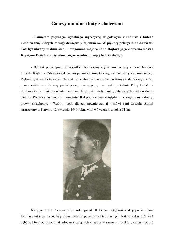 Galowy mundur i buty z cholewami - Pamiętam pięknego, wysokiego mężczyznę w galowym mundurze i butach z cholewami, których ostrogi dźwięczały tajemniczo. W pięknej pelerynie aż do ziemi. Tak był ubrany w dniu ślubu - wspomina majora Jana Rajtara jego cioteczna siostra Krystyna Pustelak. - Był ukochanym wnukiem mojej babci - dodaje. - Był tak przystojny, że wszystkie dziewczyny się w nim kochały - mówi bratowa Urszula Rajtar. - Odziedziczył po swojej matce smagłą cerę, ciemne oczy i czarne włosy. Pięknie grał na fortepianie. Należał do wybranych uczniów profesora Łabuńskiego, który przepowiadał mu karierę pianistyczną, uważając go za wybitny talent. Kuzynka Zofia Sulikowska do dziś opowiada, co przed laty grał młody Janek, gdy przychodził do domu dziadka Rajtara i tam robił im koncerty. Był pod każdym względem nadzwyczajny - dobry, prawy, szlachetny. - Wzór i ideał, dlatego pewnie zginął - mówi pani Urszula. Został zastrzelony w Katyniu 12 kwietnia 1940 roku. Miał wówczas niespełna 31 lat. Na jego cześć 2 czerwca br. roku przed III Liceum Ogólnokształcącym im. Jana Kochanowskiego na os. Wysokim zostanie posadzony Dąb Pamięci. Jest to jeden z 21 473 dębów, które od dwóch lat młodzież całej Polski sadzi w ramach projektu „Katyń - ocalić od zapomnienia”. Jeden „Dąb Pamięci” - to jedno nazwisko oficera z listy katyńskiej. Ideą tego projektu jest nie tylko upamiętnienie pomordowanych, ale również poznanie ich losów. Major Jan Kanty Rajtar pochodził z Krakowa, gdzie po potopie szwedzkim we wsi królewskiej Krowodrzy osadzono jego przodków. Dowódcę rajtarów mianowano wójtem i ta funkcja od tamtego okresu przechodziła z pokolenia na pokolenie, aż do czasów dziadka Feliksa Rajtara, który nosił tytuł naczelnika. Jan urodził się 19 września 1909 roku. Gdy miał 6 lat, osierociła go mama. Zaopiekowali się nim wówczas dziadkowie ze strony matki. Ojciec Ludwik - wicedyrektor banku i oficer - walczył wówczas na frontach I wojny światowej. Od 1917 roku przebywał w niewoli sowieckiej w Woroneżu. W archiwach rodzinnych zachowały się listy pisane do niego przez syna w 1917 roku. Pierwszy z listopada: Tatusiu drogi! Jestem zdrowy i uczę się do 2 klasy, gram na fortepianie, w parku ślizgam się na, łyżwach, rachuję do tysiąca. Niech Tatuś o Janusiu pamięta, bo Januś bardzo kocha Tatusia i jest grzeczny. Pa Tatusiu, Bozia niech da Ci zdrowie i przyjeżdżaj prędko! . Drugi z listów wysłał na Boże Narodzenie: Kochany Tatusiu! Tak mi się przykrzy za Tatusiem! Nie mogę się doczekać przyjazdu Tatusia. Czytam ładne powiastki o Krasnoludkach. Kocham Tatusia. Życzę Wesołych Świąt. Całuję rączki. Janek. Listy te świadczą o łączącej ich silnej więzi. Z żoną Krystyną na zabawie tanecznej w roku 1938. Jan po maturze odbył roczną zasadniczą służbę wojskową w artylerii we Włodzimierzu Wołyńskim. W 1929 oku rozpoczął studia na Wydziale Prawa Uniwersytetu Jagiellońskiego. W trakcie studiów uczestniczył w szkoleniach wojskowych. W 1933 roku, kiedy otrzymał dyplom uniwersytecki, miał już stopień podporucznika. Po aplikacji pracował w sądach wojskowych Grudziądza, a potem Warszawy, gdzie w 1936 roku został mianowany kapitanem audytorem. To w Warszawie zastał go wybuch II wojny światowej. Był już wtedy od dwóch lat żonaty, miał kilkumiesięczną córeczkę. Latem 1939 roku żona z małą Danusią wyjechały na wieś koło Tomaszowa Mazowieckiego. 5 września 1939 roku przyszło ostrzeżenie, że Niemcy zbombardują wieś. Wszyscy mieszkańcy uciekli do pobliskiego lasku, a Niemcy ostrzelali właśnie tylko lasek. Było wiele ofiar tego nalotu. Krystyna, żona Jana, z małą Danusią w wózku, jej matka i 19-letni brat także uciekli do lasku i podczas nalotu rzucili się na ziemię. W ostatniej chwili żona majora wyciągnęła z wózka córeczkę Danusię i przykryła ją swoim ciałem. To uratowało życie dziecku, gdyż wózek był cały przestrzelony. Na oczach Krystyny zginął brat. Trzy dni później zmarła matka, a ona sama została ciężko ranna. Zawieziono ją do szpitala w Tomaszowie Mazowieckim, a dziecko zostało z opiekunką na wsi. Kilka dni później ogłoszono mobilizację. Janowi jakimś cudem udało się przyjechać do szpitala, żeby pożegnać się z żoną, która zapytała, czy jest szansa walki z wrogiem na miejscu. Odpowiedział, że jest mobilizacja, a dla oficera „najważniejszy jest Bóg, Honor i Ojczyzna”. To było ich ostatnie spotkanie. Z żoną na nartach, rok 1938. 24 września 1939 roku wyjechał wraz z innymi pracownikami Sądu Wojskowego w stronę wschodnich granic Polski. Został ewakuowany w kierunku Brześcia i dostał się do niewoli sowieckiej. 27 listopada 1939 roku wysłał z Kozielska jedyny list do swojego wuja z prośbą, by zaopiekował się jego bliskimi. - Najgorsza jest niepewność - pisał w tym liście. Kilka. miesięcy później już nie żył. Jego śmierć była szokiem dla rodziny. Żona Krystyna nigdy już nie wyszła za mąż. Była niezwykle elegancką i piękną kobietą. Miała 27 lat, gdy zabito Jana, i do końca życia pozostała wierna jego pamięci. - Nigdy nie oglądała filmów o wojnie i nie czytała książek wojennych - wspomina jej córka Danuta. - To było bardzo kochające się małżeństwo podkreśla Urszula Rajtar. Ojciec Jana, który podczas okupacji walczył w wojsku Andersa, gdy wrócił do Polski i dowiedział się o zbrodni katyńskiej, do śmierci nie pogodził się ze stratą syna. Krystyna była jego ukochaną synową: a Danusia ukochaną wnuczką. Z żoną na Rynku Głównym w Krakowie. 2 czerwca br. na uroczystości posadzenia Dębu Pamięci do Nowej Huty przyjedzie z Warszawy córka Jana Rajtara Danuta Milej wraz z dwójką swoich dzieci, ich rodzinami i wnuczkiem, który nosi imię pradziadka. Swój przyjazd zapowiedzieli też jego kuzynki i kuzyni. Niektórzy 