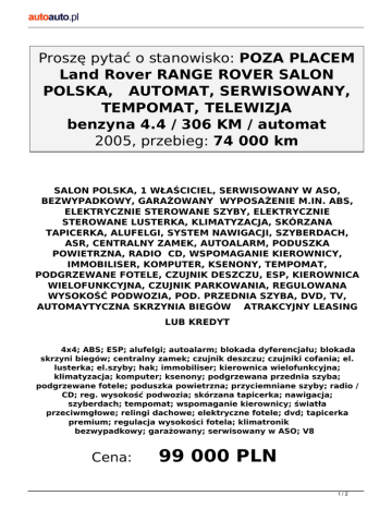 Proszę pytać o stanowisko: POZA PLACEM Land Rover RANGE ROVER SALON POLSKA, AUTOMAT, SERWISOWANY, TEMPOMAT, TELEWIZJA benzyna 4.4 / 306 KM / automat 2005, przebieg: 74 000 km SALON POLSKA, 1 WŁAŚCICIEL, SERWISOWANY W ASO, BEZWYPADKOWY, GARAŻOWANY WYPOSAŻENIE M.IN. ABS, ELEKTRYCZNIE STEROWANE SZYBY, ELEKTRYCZNIE STEROWANE LUSTERKA, KLIMATYZACJA, SKÓRZANA TAPICERKA, ALUFELGI, SYSTEM NAWIGACJI, SZYBERDACH, ASR, CENTRALNY ZAMEK, AUTOALARM, PODUSZKA POWIETRZNA, RADIO CD, WSPOMAGANIE KIEROWNICY, IMMOBILISER, KOMPUTER, KSENONY, TEMPOMAT, PODGRZEWANE FOTELE, CZUJNIK DESZCZU, ESP, KIEROWNICA WIELOFUNKCYJNA, CZUJNIK PARKOWANIA, REGULOWANA WYSOKOŚĆ PODWOZIA, POD. PRZEDNIA SZYBA, DVD, TV, AUTOMAYTYCZNA SKRZYNIA BIEGÓW ATRAKCYJNY LEASING LUB KREDYT 4x4; ABS; ESP; alufelgi; autoalarm; blokada dyferencjału; blokada skrzyni biegów; centralny zamek; czujnik deszczu; czujniki cofania; el. lusterka; el.szyby; hak; immobiliser; kierownica wielofunkcyjna; klimatyzacja; komputer; ksenony; podgrzewana przednia szyba; podgrzewane fotele; poduszka powietrzna; przyciemniane szyby; radio / CD; reg. wysokość podwozia; skórzana tapicerka; nawigacja; szyberdach; tempomat; wspomaganie kierownicy; światła przeciwmgłowe; relingi dachowe; elektryczne fotele; dvd; tapicerka premium; regulacja wysokości fotela; klimatronik bezwypadkowy; garażowany; serwisowany w ASO; V8 Cena: 99 000 PLN 1/2 brutto Opiekun: Robert Mikol +48 501110091 Jana Pawła II 69, Punkt A 2/2