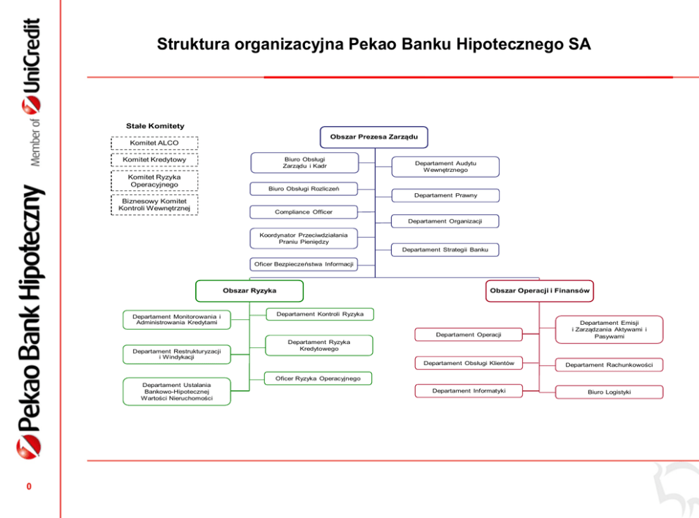 Struktura organizacyjna Pekao Banku Hipotecznego SA Stałe Komitety Obszar Prezesa Zarządu Komitet ALCO Biuro Obsługi Zarządu i Kadr Komitet Kredytowy Komitet Ryzyka Operacyjnego Departament Audytu W ewnętrznego Biuro Obsługi Rozliczeń Departament Prawny Biznesowy Komitet Kontroli Wewnętrznej Compliance Officer Departament Organizacji Koordynator Przeciwdziałania Praniu Pieniędzy Departament Strategii Banku Oficer Bezpieczeństwa Informacji Obszar Operacji i Finansów Obszar Ryzyka Departament Monitorowania i Administrowania Kredytami Departament Restrukturyzacji i W indykacji Departament Kontroli Ryzyka Departament Operacji Departament Emisji i Zarządzania Aktywami i Pasywami Departament Obsługi Klientów Departament Rachunkowości Departament Informatyki Biuro Logistyki Departament Ryzyka Kredytowego Oficer Ryzyka Operacyjnego Departament Ustalania Bankowo-Hipotecznej W artości Nieruchomości 0 Struktura organizacyjna Pekao Banku Hipotecznego SA Organizacja Struktura organizacyjna Pekao Banku Hipotecznego SA Organizacja §1 W strukturze organizacyjnej Banku wyodrębnia się następujące Obszary: Obszar Prezesa Zarządu, Obszar Ryzyka, Obszar Operacji i Finansów. Obszary składają się z wyodrębnionych organizacyjnie i kadrowo podstawowych komórek organizacyjnych – Departamentów i Biur. Departament/Biuro podlega organizacyjnie i dyscyplinarnie bezpośredniemu nadzorowi jednemu z Członków Zarządu Banku. Podporządkowanie poszczególnych Departamentów/Biur Członkom Zarządu Banku określa Struktura Organizacyjna Banku stanowiąca załącznik do niniejszej Regulacji. W Banku działają stałe Komitety: Komitet Kredytowy, Komitet ALCO, Komitet Ryzyka Operacyjnego, Biznesowy Komitet Kontroli Wewnętrznej. W Banku działa Powiernik i Zastępca Powiernika. Zakres odpowiedzialności §2 1. Do zakresu zadań i odpowiedzialności Obszaru Prezesa Zarządu należy w szczególności: 1) Strategia Banku; 2) Polityka personalna i polityka wynagrodzeń; 3) Audyt wewnętrzny; 4) Obsługa prawna Banku; 5) Zarządzanie procesami; 6) Polityka ryzyka braku zgodności; 7) Przeciwdziałanie praniu pieniędzy i finansowaniu terroryzmu; 8) Ochrona danych osobowych; 9) Obsługa rozliczeń pieniężnych. 2. Do zakresu zadań i odpowiedzialności Obszaru Ryzyka należy w szczególności: 1) Analiza i ocena ryzyka; 2) Wycena nieruchomości; 3) Decyzje kredytowe; 4) Monitoring; 5) Weryfikacja warunków i akceptacja wypłaty kredytu/transzy kredytu; 6) Restrukturyzacja i windykacja; 7) Kontrola ryzyka. 1 Struktura organizacyjna Pekao Banku Hipotecznego SA Organizacja 3. Do zakresu zadań i odpowiedzialności Obszaru Operacji i Finansów należy w szczególności: 1) Zarządzanie ryzykiem rynkowym i ryzykiem płynności; 2) Zawieranie transakcji skarbowych; 3) Polityka kapitałowa; 4) Emisje obligacji zabezpieczonych i niezabezpieczonych; 5) Zarządzanie rejestrem zabezpieczenia listów zastawnych; 6) Obsługa klientów Banku; 7) Administrowanie kredytami oraz ewidencja księgowa kredytów; 8) Polityka informacyjna, 9) Księgowość, rachunkowość, sprawozdawczość i planowanie; 10) Logistyka; 11) Bezpieczeństwo Banku; 12) Działalność informatyczna. §3 1. 2. Zakres i tryb działania Komitetów określone są przez Zarząd Banku. Zakres i tryb działania Powierników określają odrębne przepisy. Zmiana struktury organizacyjnej §4 Zmiana struktury organizacyjnej Banku wymaga zatwierdzania przez Radę Nadzorczą Banku. 2 Organizational chart of Pekao Bank Hipoteczny SA Standing Committees Division of Chairman of the Board ALCO Committee Credit Committee Operational Risk Committee Board & HR Support Office Internal Audit Department Settlement Service Office Legal Department Internal Control Business Committee Compliance Officer Organization Department Anti-money laundering Coordinator Department of Bank’s Strategy Data Security Officer Operations and Financing Division Risk Division Credit Monitoring & Administration Department Risk Control Department Operations Department ALM & Issue Department Credit Risk Department Restructuring & Vindication Department Customer Service Department Accounting Department Operational Risk Officer Property & Mortgage Valuation Department 3 IT Department Logistics Office Organisational structure of Pekao Bank Hipoteczny SA Organisation §1 1. The Bank's organisational structure comprises the following Areas: 2) Chief Executive Officer's area, 3) Risk area, 4) Operations and Financing area. 2. The areas include standalone (in terms of organisation and staff) basic organisational units called Departments and Offices. 3. The Departments/Offices are directly supervised, in terms of structure and work discipline, by one of the members of the Bank Management Board. 4. The subordination of the particular Departments/Offices to the particular Management Board members is shown in the Bank's Organisational Chart attached to this Regulation 5. The Bank has the following Standing Committees: the Credit Committee, the ALCO Committee, the Operation Risk Committee, and the Internal Control Business Committee. 6. The Bank also has a Trustee and a Deputy Trustee. Scope of responsibilities §2 1. The duties and responsibilities of the CEO's Area include, in particular: 1) Bank’s strategy, 2) Personnel and remuneration policy, 3) Internal audit, 4) Bank legal services, 5) Process management, 6) Compliance risk policy, 7) Prevention of money laundering and financing terrorism, 8) Personal data protection, 9) Financial settlements service. 2.The duties and responsibilities of the Risk Area include, in particular: 1) Risk analysis and assessment, 2) Real estate valuation, 3) Credit decisions, 4) Monitoring, 5) Verification of terms and approvals of credit/credit tranche payouts, 6) Debt rescheduling and collection, 7) Risk controlling. 4 Organisational structure of Pekao Bank Hipoteczny SA Organisation 3. The duties and responsibilities of the Operations and Financing Area 
