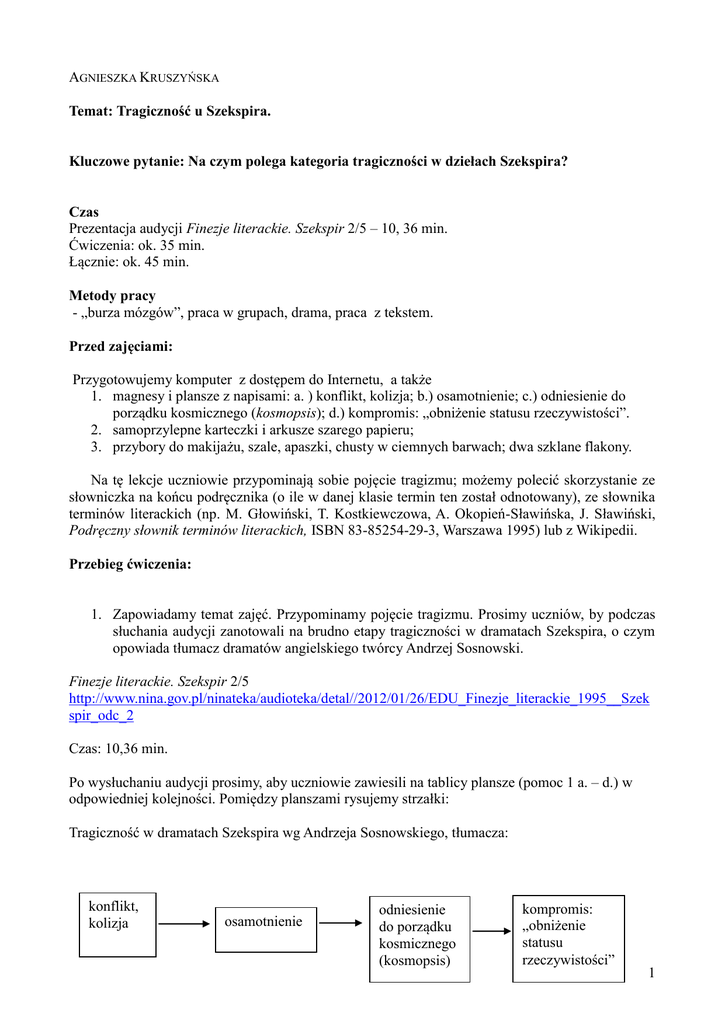 AGNIESZKA KRUSZYŃSKA Temat: Tragiczność u Szekspira. Kluczowe pytanie: Na czym polega kategoria tragiczności w dziełach Szekspira? Czas Prezentacja audycji Finezje literackie. Szekspir 2/5 – 10, 36 min. Ćwiczenia: ok. 35 min. Łącznie: ok. 45 min. Metody pracy - „burza mózgów”, praca w grupach, drama, praca z tekstem. Przed zajęciami: Przygotowujemy komputer z dostępem do Internetu, a także 1. magnesy i plansze z napisami: a. ) konflikt, kolizja; b.) osamotnienie; c.) odniesienie do porządku kosmicznego (kosmopsis); d.) kompromis: „obniżenie statusu rzeczywistości”. 2. samoprzylepne karteczki i arkusze szarego papieru; 3. przybory do makijażu, szale, apaszki, chusty w ciemnych barwach; dwa szklane flakony. Na tę lekcje uczniowie przypominają sobie pojęcie tragizmu; możemy polecić skorzystanie ze słowniczka na końcu podręcznika (o ile w danej klasie termin ten został odnotowany), ze słownika terminów literackich (np. M. Głowiński, T. Kostkiewczowa, A. Okopień-Sławińska, J. Sławiński, Podręczny słownik terminów literackich, ISBN 83-85254-29-3, Warszawa 1995) lub z Wikipedii. Przebieg ćwiczenia: 1. Zapowiadamy temat zajęć. Przypominamy pojęcie tragizmu. Prosimy uczniów, by podczas słuchania audycji zanotowali na brudno etapy tragiczności w dramatach Szekspira, o czym opowiada tłumacz dramatów angielskiego twórcy Andrzej Sosnowski. Finezje literackie. Szekspir 2/5 http://www.nina.gov.pl/ninateka/audioteka/detal//2012/01/26/EDU_Finezje_literackie_1995__Szek spir_odc_2 Czas: 10,36 min. Po wysłuchaniu audycji prosimy, aby uczniowie zawiesili na tablicy plansze (pomoc 1 a. – d.) w odpowiedniej kolejności. Pomiędzy planszami rysujemy strzałki: Tragiczność w dramatach Szekspira wg Andrzeja Sosnowskiego, tłumacza: konflikt, kolizja osamotnienie odniesienie do porządku kosmicznego (kosmopsis) kompromis: „obniżenie statusu rzeczywistości” 1 Ze względu na to, że objaśnienie podane w audycji jest dość trudne dla uczniów szkoły ponadgimanzjalnej, możemy przybliżyć młodzieży rozumienie pojęcia tragiczności wg A. Sosnowskiego na znanym im przykładzie Romea i Julii. Propozycja objaśnienia: Bohaterowie znajdują się w sytuacji konfliktu między lojalnością wobec rodu, wartościami rodzinnymi i uczuciami do rodziców a wzajemną miłością. Ta miłość, nieakceptowana przez otoczenie i ukrywana, powoduje osamotnienie bohaterów. Wielka miłość wobec równie wielkiej nienawiści rodów Kapuletów i Montekich w jakiś sposób odnosi się do wszechświata: zakochani dostrzegają, jak kosmosem rządzą ludzkie namiętności i zmieniają one życie innych; wobec niemożności bycia z ukochaną osobą życie przestaje mieć wartość. „Obniżony status rzeczywistości” to przekonanie, z jakim zostaje odbiorca sztuki: rzeczywistość nie jest przyjazna zakochanym, nie pomaga miłości. Czas ćwiczenia: 5 min. 2. Jak rozumiemy pojęcie tragiczność? W kilkuosobowych grupach uczniowie zapisują na samoprzylepnych karteczkach słowa i sformułowania kojarzące się im z tragicznością. Przyklejają karteczki na szarych arkuszach tak, by terminy nie powtarzały się. Przedstawienie przemyśleń młodzieży, zawieszenie arkuszy w klasie. Czas ćwiczenia: 5 min. 2. Jak wyrażać tragiczność i jak wywołać uczucia w widzu? – praca w grupach. W tym ćwiczeniu, wykonywanym także w grupach, ważne jest, aby uczniowie mogli zdecydować, czym chcą się zająć. Prosimy, aby zgłosiły się osoby zainteresowane inscenizowaniem scen z Romea i Julii oraz ci, którzy uważają, że w losie nieszczęśliwie zakochanych nie ma nic tragicznego (albo też nie są zbytnio przejęci historią bohaterów dramatu). Osoby zainteresowane inscenizacją tworzą dwie kilkuosobowe grupy i otrzymują: Gr I – materiał pomocniczy nr 1 gr I , materiał pomocniczy nr 2, przybory do makijażu, jeden flakon, szale. Gr II - materiał pomocniczy nr 1 gr II , materiał pomocniczy nr 2, przybory do makijażu, jeden flakon, szale. Zadaniem młodzieży jest dobranie pojęć z materiału nr 2 do wypowiedzi Romea (gr. I) i do monologu Julii (gr. II). Dwa z opisów podane są błędnie; młodzież powinna je wykluczyć: „niemożność wyboru między dwoma ukochanymi” oraz „potrzeba zemsty i nakaz przebaczenia”. Następnie wg wskazówek w ramkach młodzież przygotowuje inscenizację w taki sposób, by przekonać widownię o tragiczności losu kochanków i poruszyć emocje. Każda grupa wybiera swego Romea i swą Julię. Grupy malują i ubierają swoich aktorów, by spotęgować efekt. Młodzież dyskutuje w grupach, jak ich aktor/ aktorka powinien/ powinna czytać swoją kwestię, jak wyrażać emocje, jak przekazać odczucie tragiczności. W tym czasie pozostała część klasy, także w kilkuosobowych grupach, otrzymuje materiał pomocniczy 1 dla gr. I i II i przygotowuje list do Romea/ do Julii, w którym stara się przekonać postać z dramatu, że nie stało się nic aż tak strasznego. Podczas pracy w grupach staramy się inspirować uczniów, zwracać ich uwagę np. na to, że jeśli do monologu Julii dobrali ramkę z napisem Potrzeba bycia z ludźmi i konieczność pozostania 2 w samotności, powinni przygotować inscenizację tak, by było widać, jak Julia targana jest pragnieniem wypłakania się przy niani, a jednocześnie – przymusem osamotnienia. Młodzieży piszącej listy do bohaterów proponujemy, by starali się pisać z punktu widzenia ludźmi, jakimi są: nowoczesnych nastolatków, którzy umieją radzić sobie w życiu. Zwieńczeniem ćwiczenia jest inscenizacja – odczytanie roli przed publicznością i wypowiedzi widzów, czy/ dlaczego tak/ dlaczego nie zostali przekonani co do tragiczności sytuacji bohaterów. Czas ćwiczenia: 25 min. 4. Praca domowa: Tragiczność sytuacji nieprzygotowanego ucznia na klasówce lub na maturze – monolog ucznia. Zachęcamy do wyrażania uczuć i opisywania stanów patetycznymi sfor