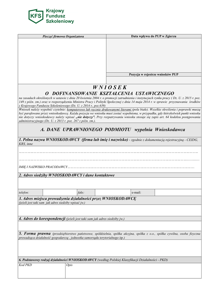 Data wpływu do PUP w Zgierzu Pieczęć firmowa Organizatora Pozycja w rejestrze wniosków PUP WNIOSEK O DOFINANSOWANIE KSZTAŁCENIA USTAWICZNEGO na zasadach określonych w ustawie z dnia 20 kwietnia 2004 r. o promocji zatrudnienia i instytucjach rynku pracy ( Dz. U. z 2015 r. poz. 149 z późn. zm.) oraz w rozporządzeniu Ministra Pracy i Polityki Społecznej z dnia 14 maja 2014 r. w sprawie przyznawania środków z Krajowego Funduszu Szkoleniowego (Dz. U. z 2014 r., poz.639) Wniosek należy wypełnić czytelnie: komputerowo lub ręcznie drukowanymi literami (pola białe). Wszelkie skreślenia i poprawki muszą być parafowane przez wnioskodawcę. Każda pozycja we wniosku musi zostać wypełniona, w przypadku, gdy którykolwiek punkt wniosku nie dotyczy wnioskodawcy należy wpisać „nie dotyczy”. Przy rozpatrywaniu wniosku stosuje się zapis art. 64 kodeksu postępowania administracyjnego (Dz. U. z 2013 r. poz. 267 z późn. zm.). A. DANE UPRAWNIONEGO PODMIOTU wypełnia Wnioskodawca 1. Pełna nazwa WNIOSKODAWCY (firma lub imię i nazwisko) - zgodnie z dokumentacją rejestracyjną - CEIDG, KRS, inne ………………………………………………………………………………………………………………………………………………………………… ………………………………………………………………………………………………………………………………………………………................ IMIĘ I NAZWISKO PRACODAWCY…………………………………………………………………………………………………………………. 2. Adres siedziby WNIOSKODAWCY i dane kontaktowe telefon: faks: e-mail: 3. Adres miejsca prowadzenia działalności przez WNIOSKODAWCĘ (jeżeli jest taki sam jak adres siedziby wpisać jw.) 4. Adres do korespondencji (jeżeli jest taki sam jak adres siedziby jw.) 5. Forma prawna (przedsiębiorstwo państwowe, spółdzielnia, spółka akcyjna, spółka z o.o., spółka cywilna, osoba fizyczna prowadząca działalność gospodarczą , jednostka samorządu terytorialnego itp.) 6. Podstawowy rodzaj działalności WNIOSKODAWCY (według Polskiej Klasyfikacji Działalności - PKD) Kod PKD Opis 7. Data rozpoczęcia działalności 8. NIP 9. REGON 8. Nr KRS (jeżeli został nadany)* 9. Nr identyfikacyjny gospodarstwa rolnego nadany przez Agencję Restrukturyzacji i Modernizacji Rolnictwa** 10. Powierzchnia gospodarstwa rolnego** (w hektarach przeliczeniowych) * dotyczy spółek prawa handlowego, spółdzielni, stowarzyszeń, fundacji, zakładów opieki zdrowotnej ** dotyczy osób prowadzących działalność w zakresie produkcji roślinnej lub zwierzęcej 11. Imię i nazwisko oraz stanowisko służbowe osoby upoważnionej do reprezentowania Wnioskodawcy (tj. do podpisania umowy zgodnie z dokumentacją rejestracyjną – CEIDG, KRS, inne) ………………………………………………………………………………………………………………………………………………………………….. ………………………………………………………………………………………………………………………………………………………….…….. 12. Liczba pracowników zatrudnionych u WNIOSKODAWCY na dzień złożenia wniosku 13. Dane osoby wyznaczonej do kontaktu z PUP (imię i nazwisko, stanowisko, telefon) IMIĘ, NAZWISKO …………………………………………………………………………………………………………………………………………… STANOWISKO ……………………………………………………………………………………………………………………………………………. TEL.KONTAKTOWY……………………………………………………………e-mail………………………………………………………………….. B. WYSOKOŚĆ I HARMONOGRAM WSPARCIA: (Działania do sfinansowania z udziałem KFS, o których mowa w art. 69 a ust. 2 pkt. 1 ustawy o promocji zatrudnienia i instytucjach rynku pracy) Tytuł ………………..………………………………………………………………………………………..……………… np. Kształcenie ustawiczne dla pracowników Nazwa Firmy………………………………………………………………………………………………………………. Okres realizacji……………………………………………………………………………………………………..……… Całkowita wartość planowanych działań kształcenia ustawicznego: ………………………………………….…zł (słownie:………………………………………………………………………………………………………………….…) w tym: - kwota wnioskowana z KFS: …………………….…zł (słownie…………………………………………….……....) - kwota wkładu własnego: ……………………….zł (słownie……………………………..………..…………...…..) C. INFORMACJE O UCZESTNIKACH KSZTAŁCENIA USTAWICZNEGO Wyszczególnienie Liczba pracodawców Liczba pracowników razem kobiety Według rodzajów wsparcia Objęci wsparciem ogółem Kursy Studia podyplomowe Egzaminy Badania lekarskie i/lub psychologiczne Według grup wiekowych Ubezpieczenie NNW 15-24 lata X X X 25-34 lata 35-44 lata X X X X X X 45 lat i więcej Uzasadnienie wniosku (krótki opis obecnych lub przyszłych potrzeb pracodawcy w obszarze kształcenia ustawicznego i niezbędnych środków na sfinansowanie tych działań) ……………………………………………………………………………………………………………………………… …..…………………………………………………………………………………………………………………………. ……………