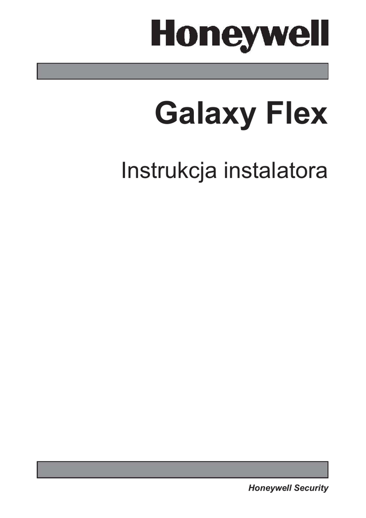 Galaxy Flex Instrukcja instalatora Honeywell Security Galaxy Flex – Instrukcja instalatora Spis treści Wstęp.......................................................................................7 Architektura systemu ....................................................................................... 8 Płyta centrali Galaxy Flex............................................................................... 10 Rozdział 1: Procedura instalacji .............................................11 Planowanie.................................................................................................... 11 Instalacja centrali i klawiatury ......................................................................... 11 Instalacja zasilacza........................................................................................ 12 Podłączenie akumulatora i zasilania ............................................................... 14 Przygotowanie do programowania.................................................................. 14 Instalacja urządzeń peryferyjnych................................................................... 15 Przypisywanie czujek do linii .......................................................................... 16 Adresowanie linii dozorowych ..........................................................................................16 Konfiguracja linii dozorowych ...........................................................................................17 Podłączanie czujek ...........................................................................................................17 Dodatkowe informacje dot. konfiguracji linii.....................................................................17 Linie dozorowe typu KLUCZ.............................................................................................18 Linie dozorowe typu PRZYCISK ......................................................................................19 Podłączanie wyjść ......................................................................................... 19 Sygnalizacja sabotaŜu ................................................................................... 20 Wykrywanie bezprzewodowych czujek ........................................................... 20 Dodatkowe opcje programowania................................................................... 20 UŜytkownicy i szablony dostępu ......................................................................................22 Usługi dodatkowe .......................................................................................... 23 Połaczenie z komputerem za pomocą portu USB ...........................................................23 Połączenie ze zdalnym komputerem serwisowym ..........................................................23 Rozdział 2: Uruchomienie i testowanie ..................................25 Wyświetlanie informacji o liniach .................................................................... 25 Test chodzony ............................................................................................... 25 Test wyjść ..................................................................................................... 25 3 Galaxy Flex – Instrukcja instalatora Diagnostyka (opcjonalnie) .............................................................................. 25 Pełny test ...................................................................................................... 26 Programowanie kodów................................................................................... 26 InstruktaŜ uŜytkowników systemu................................................................... 26 Rozdział 3: Struktura menu....................................................27 Dostęp do menu ............................................................................................ 27 Szybkie menu....................................................................................................................27 Pełne menu .......................................................................................................................28 Nawigacja po menu ....................................................................................... 28 Kody zaprogramowane fabrycznie.................................................................. 29 Automatyczne wyłączenie menu .................................................................... 29 Tryb inŜyniera................................................................................................ 29 Dostęp wielu uŜytkowników............................................................................ 30 Rozdział 4: Programowanie systemu .....................................31 Opcje załączania ........................................................................................... 31 Załączanie przy pomocy kodu PIN...................................................................................31 Przerywanie procedury załączania ..................................................................................32 Wyłączenie systemu za pomocą kodu PIN......................................................................32 Wyłączenie systemu przez inŜyniera ...............................................................................32 Opcje załączania przy pomocy linii typu Klucz ................................................................32 Opcje załączania przy pomocy karty/breloka ..................................................................33 Kasowanie alarmów i reset systemu po alarmie .............................................................34 Zapis zdarzeń do rejestru .................................................................................................35 Anulowanie awarii i stanów sabotaŜu ..............................................................................35 Zał