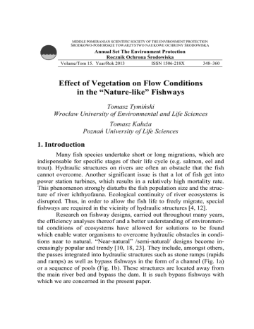 MIDDLE POMERANIAN SCIENTIFIC SOCIETY OF THE ENVIRONMENT PROTECTION ŚRODKOWO-POMORSKIE TOWARZYSTWO NAUKOWE OCHRONY ŚRODOWISKA Annual Set The Environment Protection Rocznik Ochrona Środowiska Volume/Tom 15. Year/Rok 2013 ISSN 1506-218X 348–360 Effect of Vegetation on Flow Conditions in the “Nature-like” Fishways Tomasz Tymiński Wrocław University of Environmental and Life Sciences Tomasz Kałuża Poznań University of Life Sciences 1. Introduction Many fish species undertake short or long migrations, which are indispensable for specific stages of their life cycle (e.g. salmon, eel and trout). Hydraulic structures on rivers are often an obstacle that the fish cannot overcome. Another significant issue is that a lot of fish get into power station turbines, which results in a relatively high mortality rate. This phenomenon strongly disturbs the fish population size and the structure of river ichthyofauna. Ecological continuity of river ecosystems is disrupted. Thus, in order to allow the fish life to freely migrate, special fishways are required in the vicinity of hydraulic structures [4, 12]. Research on fishway designs, carried out throughout many years, the efficiency analyses thereof and a better understanding of environmental conditions of ecosystems have allowed for solutions to be found which enable water organisms to overcome hydraulic obstacles in conditions near to natural. “Near-natural” /semi-natural/ designs become increasingly popular and trendy [10, 18, 23]. They include, amongst others, the passes integrated into hydraulic structures such as stone ramps (rapids and ramps) as well as bypass fishways in the form of a channel (Fig. 1a) or a sequence of pools (Fig. 1b). These structures are located away from the main river bed and bypass the dam. It is such bypass fishways with which we are concerned in the present paper. Effect of Vegetation on Flow Conditions in the “Nature-like” Fishways 349 Fig. 1. Types of bypass fishways according to DVWK [5] Rys. 1. Rodzaje przepławek obejściowych wg DVWK [5] 2. Semi-natural Bypass Fishways Bypass fishways (bypass channels) resemble mountain streams and creeks. Natural materials such as wood, vegetation, gravel, stones and rocks are used for their construction. They are designed in a unique and individual way for each hydraulic structure. The primary design goals are to provide for all the ichthyofauna needs without hindering the correct operation of the dam and to integrate the fishway, as much as possible, into the surroundings (Fig. 2). Irregular and varied shape of a fishway makes it resemble a natural watercourse. This is why a bypass should run by a winding channel, using the existing old river bed sections, water-mill channels and ponds. Water bodies integrated into bypass channels are important flow velocity limiters and provide resting places for the migrating fish [13, 18, 23]. These aspects are particularly significant when big level differences occur (of up to 10 m). Another solution which provides the required resting zones for fish is a bypass channel with alternating sections of big and small gradients. Usually, the bypass bed gradient ranges from 1:20 to 1:75 (exceptionally 1:100) [11]. 350 Tomasz Tymiński, Tomasz Kałuża Fig. 2. Semi-natural bypass fishway in the old river bed of the Rhone [7] Rys. 2. Bliska naturze przepławka obejściowa w starym korycie rzeki Rhone [7] In bypass fishways of particular importance are the elements of biomechanical build-up. In hydraulic context, the role of vegetated zones and rocks is to appropriately slow down and diversify the water flow velocities and to provide a distribution of turbulence in the fishway which would be appropriate for the migrating fish. 3. Ichthyofauna Requirements and Guidelines for Fishway Design In the literature of the subject very little information is available on the geometric and more importantly motoric properties of individual fish species. Such information might include any data on the maximum surmountable height, the ability to jump, the admissible time a fish can swim against the current with maximum expenditure of energy or the recommended and maximum values of water velocity in the stream. It does pose a certain problem for the designers, as at the stage of hydraulic dimensioning of fishways some starting assumptions are required. With not enough of detailed data, many simplifications and generalizations must be made. Consequently, in our country’s practice, the design guidelines drawn up by a German interdisciplinary expert team [1–6, 13,16– Effect of Vegetation on Flow Conditions in the “Nature-like” Fishways 351 17] are commonly used. A summary of its key assumptions is given below (Tabs. 1–2). Table 1. Permissible water flow velocities in fishways [1–6, 13, 15–17] Tabela 1. Dopuszczalne prędkości przepływu wody w przepławkach [1–6, 13, 15–17] Type of fish Big-size fishes like salmonids (salmon, trout) Medium-size fishes like cyprinids (chub, barbel) Small fishes and juveniles Velocities at the inlet of the upper water Velocities at the fishway mouth flow velocities v < 2 m/s v < 1.5 m/s v < 1 m/s v < 1.2 m/s v < 1.9 m/s Table. 2. Fishway design guidelines [1–6, 13, 15–17] Tabela 2. Wytyczne do projektowania przepławek [1–6, 13, 15–17] Parameter Specific discharge Bottom slope Width of fishway Length of chamber Difference in water levels between chambers Flow depth Mean velocity Diameter of used stones Width of slots Size q > 0.1 m2/s 1:75–1:20 b > 0.8 m L > 4.0 m h = 0.05–0.15 m t = 0.2–1.5 m v = 0.4–0.6 m/s d = 0.4–0.7 m s = 0.1–0.5 m Turbulence in a fishway is often estimated by means of the so called parameter of unitary energy of water E. This value can be calculated from: E g H Q , [W/m3] At where: H – difference in water levels between chambers [m], Q – water flow rate in the fishway [m3/s], A – chamber (pool) surface area [m2], t – filling of the chamber (pool); dept