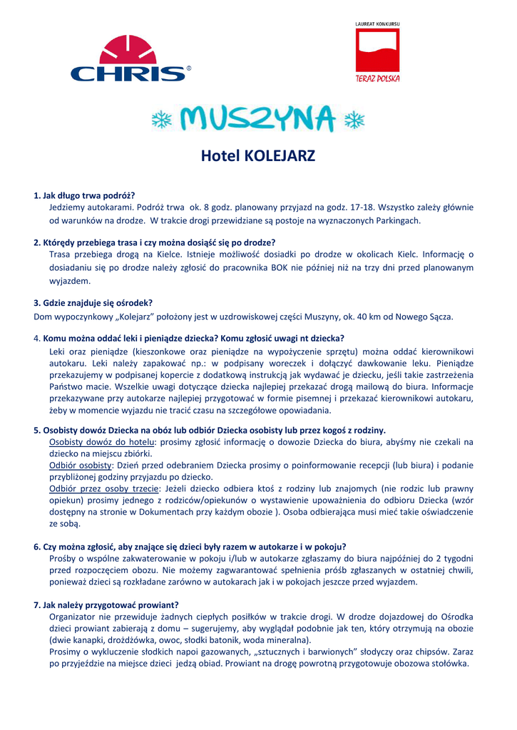 Hotel KOLEJARZ 1. Jak długo trwa podróż? Jedziemy autokarami. Podróż trwa ok. 8 godz. planowany przyjazd na godz. 17-18. Wszystko zależy głównie od warunków na drodze. W trakcie drogi przewidziane są postoje na wyznaczonych Parkingach. 2. Którędy przebiega trasa i czy można dosiąść się po drodze? Trasa przebiega drogą na Kielce. Istnieje możliwość dosiadki po drodze w okolicach Kielc. Informację o dosiadaniu się po drodze należy zgłosić do pracownika BOK nie później niż na trzy dni przed planowanym wyjazdem. 3. Gdzie znajduje się ośrodek? Dom wypoczynkowy „Kolejarz” położony jest w uzdrowiskowej części Muszyny, ok. 40 km od Nowego Sącza. 4. Komu można oddać leki i pieniądze dziecka? Komu zgłosić uwagi nt dziecka? Leki oraz pieniądze (kieszonkowe oraz pieniądze na wypożyczenie sprzętu) można oddać kierownikowi autokaru. Leki należy zapakować np.: w podpisany woreczek i dołączyć dawkowanie leku. Pieniądze przekazujemy w podpisanej kopercie z dodatkową instrukcją jak wydawać je dziecku, jeśli takie zastrzeżenia Państwo macie. Wszelkie uwagi dotyczące dziecka najlepiej przekazać drogą mailową do biura. Informacje przekazywane przy autokarze najlepiej przygotować w formie pisemnej i przekazać kierownikowi autokaru, żeby w momencie wyjazdu nie tracić czasu na szczegółowe opowiadania. 5. Osobisty dowóz Dziecka na obóz lub odbiór Dziecka osobisty lub przez kogoś z rodziny. Osobisty dowóz do hotelu: prosimy zgłosić informację o dowozie Dziecka do biura, abyśmy nie czekali na dziecko na miejscu zbiórki. Odbiór osobisty: Dzień przed odebraniem Dziecka prosimy o poinformowanie recepcji (lub biura) i podanie przybliżonej godziny przyjazdu po dziecko. Odbiór przez osoby trzecie: Jeżeli dziecko odbiera ktoś z rodziny lub znajomych (nie rodzic lub prawny opiekun) prosimy jednego z rodziców/opiekunów o wystawienie upoważnienia do odbioru Dziecka (wzór dostępny na stronie w Dokumentach przy każdym obozie ). Osoba odbierająca musi mieć takie oświadczenie ze sobą. 6. Czy można zgłosić, aby znające się dzieci były razem w autokarze i w pokoju? Prośby o wspólne zakwaterowanie w pokoju i/lub w autokarze zgłaszamy do biura najpóźniej do 2 tygodni przed rozpoczęciem obozu. Nie możemy zagwarantować spełnienia próśb zgłaszanych w ostatniej chwili, ponieważ dzieci są rozkładane zarówno w autokarach jak i w pokojach jeszcze przed wyjazdem. 7. Jak należy przygotować prowiant? Organizator nie przewiduje żadnych ciepłych posiłków w trakcie drogi. W drodze dojazdowej do Ośrodka dzieci prowiant zabierają z domu – sugerujemy, aby wyglądał podobnie jak ten, który otrzymują na obozie (dwie kanapki, drożdżówka, owoc, słodki batonik, woda mineralna). Prosimy o wykluczenie słodkich napoi gazowanych, „sztucznych i barwionych” słodyczy oraz chipsów. Zaraz po przyjeździe na miejsce dzieci jedzą obiad. Prowiant na drogę powrotną przygotowuje obozowa stołówka. 8. W jaki sposób dzieci są przydzielane do pokoi i grup zajęciowych? Dzieci są przydzielane do pokoi i grup zajęciowych przez kierownika danej grupy wiekowej. Kierownik bierze pod uwagę płeć, wiek oraz w miarę możliwości sugestie rodziców. Uwagi dotyczące zakwaterowania lub grup zajęciowych należy zgłosić do pracownika biura obsługi klienta nie później niż na dwa tygodnie przed rozpoczęciem obozu. Uwagi przesłane w późniejszym terminie są zwykle trudne do uwzględnienia. 9. Na jaką pomoc mogą liczyć uczestnicy obozów? Najprościej mówiąc na każdą. Należy natomiast uczulić dziecko na to, aby informowało wychowawcę na bieżąco o swoich potrzebach. 10. Jak wygląda standardowy dzień zajęć na obozie? Pobudka, poranna toaleta, śniadanie, sprzątanie pokoi i szykowanie się na stok, wyjazd na stok, powrót, czas na prysznic i chwilę odpoczynku, obiadokolacja, zajęcia wieczorne wg grafiku, toaleta wieczorna, cisza nocna. 11. Jak wyglądają i jak długo trwają posiłki? Posiłki trwają ok. 30 minut. Śniadanie i obiadokolacja w formie szwedzkiego stołu + prowiant na stok. 12. Czy jest możliwość realizacji diety lub przestrzegania zastrzeżeń dietetycznych? Dzieci ze specjalnymi potrzebami żywieniowymi mogą uczestniczyć w programie obozu. Informacje i wskazówki dotyczące żywienia czy specjalnej diety należy przekazać pracownikowi BOK po zapisaniu dziecka na obóz. 13. Jak i kiedy można skontaktować się z dzieckiem? Najlepszą porą na kontakt z dzieckiem jest czas obiadokolacji. Jeżeli dziecko nie posiada własnego telefonu komórkowego, rodzice mogą zadzwonić na podany telefon kontaktowy. Osoba pełniąca dyżur przekaże telefon dziecku. Godziny posiłków oraz numer telefonu do recepcji zostaną umieszczone na stronie internetowej. Przypominamy że w Muszynie, zgodnie z wprowadzonymi zasadami, dzieci mają ograniczony dostęp do telefonów komórkowych ( telefony są zdeponowane w sejfie, dzieci mogą z nich korzystać w środy i w soboty). 14. Jak można skontaktować się z wychowawcą? Z wychowawcą można skontaktować się dzwoniąc do recepcji ośrodka najlepiej po powrocie ze stoku. Jeżeli wychowawca jest w danej chwili nieosiągalny można zostawić osobie dyżurnej numer telefonu. Wychowawca oddzwoni do Państwa w najbliższej wolnej chwili. 15. Czy rodzeństwo będące w różnych grupach będzie miało szansę na spotkanie w trakcie turnusu? Rodzeństwo w różnych grupach wiekowych ma szansę spotkać się podczas sjest oraz imprez ogólnocampowych (pod warunkiem, że są zakwaterowani w tym samym hotelu), jednak tego czasu nie ma zbyt wiele. 16. Co się dzieje, jeśli dziecko zachoruje? W naszym ośrodku podczas obozu znajduje się lekarz lub pomoc medyczna. W przypadku zachorowania dziecko jest prowadzone przez wychowawcę do lekarza, który wdraża odpowiednie leczenie. W skrajnych przypadkach, gdy diagnostyka wymaga specjalistycznego sprzętu dziecko