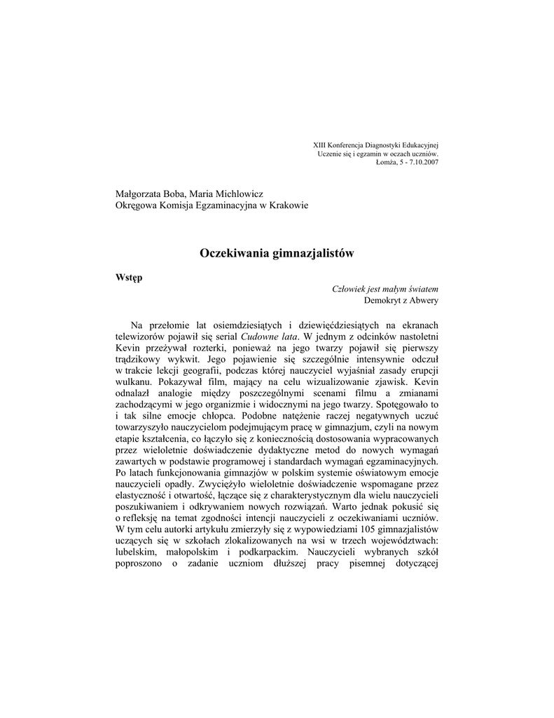 XIII Konferencja Diagnostyki Edukacyjnej Uczenie się i egzamin w oczach uczniów. Łomża, 5 - 7.10.2007 Małgorzata Boba, Maria Michlowicz Okręgowa Komisja Egzaminacyjna w Krakowie Oczekiwania gimnazjalistów Wstęp Człowiek jest małym światem Demokryt z Abwery Na przełomie lat osiemdziesiątych i dziewięćdziesiątych na ekranach telewizorów pojawił się serial Cudowne lata. W jednym z odcinków nastoletni Kevin przeżywał rozterki, ponieważ na jego twarzy pojawił się pierwszy trądzikowy wykwit. Jego pojawienie się szczególnie intensywnie odczuł w trakcie lekcji geografii, podczas której nauczyciel wyjaśniał zasady erupcji wulkanu. Pokazywał film, mający na celu wizualizowanie zjawisk. Kevin odnalazł analogie między poszczególnymi scenami filmu a zmianami zachodzącymi w jego organizmie i widocznymi na jego twarzy. Spotęgowało to i tak silne emocje chłopca. Podobne natężenie raczej negatywnych uczuć towarzyszyło nauczycielom podejmującym pracę w gimnazjum, czyli na nowym etapie kształcenia, co łączyło się z koniecznością dostosowania wypracowanych przez wieloletnie doświadczenie dydaktyczne metod do nowych wymagań zawartych w podstawie programowej i standardach wymagań egzaminacyjnych. Po latach funkcjonowania gimnazjów w polskim systemie oświatowym emocje nauczycieli opadły. Zwyciężyło wieloletnie doświadczenie wspomagane przez elastyczność i otwartość, łączące się z charakterystycznym dla wielu nauczycieli poszukiwaniem i odkrywaniem nowych rozwiązań. Warto jednak pokusić się o refleksję na temat zgodności intencji nauczycieli z oczekiwaniami uczniów. W tym celu autorki artykułu zmierzyły się z wypowiedziami 105 gimnazjalistów uczących się w szkołach zlokalizowanych na wsi w trzech województwach: lubelskim, małopolskim i podkarpackim. Nauczycieli wybranych szkół poproszono o zadanie uczniom dłuższej pracy pisemnej dotyczącej charakterystyki absolwenta gimnazjum1. Uczniowie w swoich wypowiedziach mieli zwrócić uwagę na zainteresowania nastolatków i – przede wszystkim – rolę domu rodzinnego, szkoły oraz środowiska rówieśniczego w kształtowaniu postawy młodego człowieka. Sylwetka gimnazjalisty Wspominając czasy podstawówki – pierwszej ukochanej szkoły, przypominam sobie (…) tę beztroskę każdego dnia, że wszystko jest takie proste, że każdy chce pomóc, że pani nauczycielka ma zawsze rację, a gimnazjaliści są tacy duzi i ja na pewno taka nie urosnę (…). Po trzech latach spędzonych w gimnazjum zburzyło się moje wcześniejsze przekonanie (…).2 Wymowę powyższego cytatu można rozumieć jako krytykę szkolnictwa, które niszczy w młodym człowieku ufność do świata. Ale intencje autorki były inne, o czym świadczyła dalsza część wypowiedzi. W cytacie zawarta jest również refleksja na temat konieczności zmiany własnych przekonań i wyobrażeń w związku z rozwojem i wymaganiami edukacyjnymi łączącymi się z określonym wiekiem. Zgodnie z wymogami charakterystyki jako formy wypowiedzi uczniowie zazwyczaj rozpoczynali od przedstawienia postaci. Z fragmentów prac stanowiących wstęp lub zakończenie pracy można było uzyskać informacje na temat tego, jaki jest uczeń kończący gimnazjum? Absolwent kończący trzecią klasę ma 16 lat, jest już na tyle dorosły, by móc decydować o pewnych sprawach, np. jaką szkołę wybrać, by się czuć w niej dobrze swobodnie i w miarę swoich możliwości mieć wyniki ocen i punktów dość dobre.3 1 Autorki pragną podziękować dr. Henrykowi Szaleńcowi za inspirację dotyczącą sposobu realizacji badań, których efektem jest ten artykuł. 2 Fragment pochodzi z wypowiedzi uczennicy III klasy gimnazjum z dużego miasta – powyżej 100 tys. Mieszkańców. Z uwagi na małą liczebność wypowiedzi otrzymanych z tego typu szkół autorki skupiły swoją uwagę jedynie na analizie prac uczniów z gimnazjów zlokalizowanych na wsi. 3 W przytaczanych fragmentach wypowiedzi uczniów skorygowano zapis, czyli ortografię i interpunkcję. Moim zdaniem absolwentka gimnazjum nie jest jeszcze w pełni osobą dorosłą. Potrafi samodzielnie dokonywać wyborów, ale nie zawsze, czasami potrzebuje pomocy dorosłych. Nie chce być traktowana jak dziecko, lecz kiedy ktoś ją rozłości tak właśnie się zachowuje. Absolwent gimnazjum to człowiek, który wie już, czego chce (choć nie zawsze). Wychodząc z murów szkoły, staje się całkiem innym człowiekiem. Musi w końcu wydorośleć. Stać się osobą godną zaufania. (…) stwierdzam, że życie absolwentki gimnazjum jest bardzo trudne. Musi ona bowiem udowodnić, że stała się kimś innym, lepszym, mądrzejszym. Absolwentka gimnazjum, kończąc pewien etap w swoim życiu, z pewnością zaczyna inaczej patrzeć na świat. Do pewnych spraw podchodzi z dystansem, stara się stać dobrym człowiekiem. Mówiąc ogółem, staje się doroślejsza, bardziej doświadczona. Jest w najlepszym okresie życia, gdyż właśnie przeżywa lub będzie przeżywać pierwsze miłości, zauroczenia lub fantastyczne przygody. Warto zwrócić uwagę, że w powyższych cytatach uzewnętrznia się świadomość młodego człowieka dotycząca przede wszystkim oczekiwań społeczno-kulturowych otoczenia. Uczeń kończący gimnazjum powinien być osobą, w której na pewnym poziomie zostało ukształtowane poczucie odpowiedzialności za siebie i swoje życie. Przygotowanie do kształtowania tego poczucia odpowiedzialności dotyczy zarówno sfery indywidualnej, jak i budowania relacji związanych z trwałymi uczuciami względem innych osób, czyli z przyjaźnią i miłością. Równocześnie świadomość konieczności ponoszenia odpowiedzialności łączy się z nabyciem umiejętności wartościowania i oceniania zjawisk otaczającego świata. Nie zawsze ocena młodego człowieka jest trafna. W uzyskaniu trafnej oceny oraz zachowaniu wymogów bycia osobą dojrzałą i dorosłą przeszkadzają 