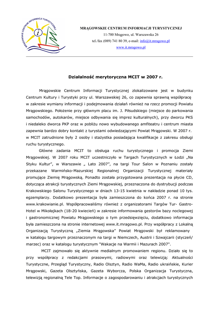 MRĄGOWSKIE CENTRUM INFORMACJI TURYSTYCZNEJ 11-700 Mrągowo, ul. Warszawska 26 tel./fax (089) 741 80 39, e-mail: [email protected] www.it.mragowo.pl Działalność merytoryczna MCIT w 2007 r. Mrągowskie Centrum Informacji Turystycznej zlokalizowane jest w budynku Centrum Kultury i Turystyki przy ul. Warszawskiej 26, co zapewnia sprawną współpracę w zakresie wymiany informacji i podejmowania działań również na rzecz promocji Powiatu Mrągowskiego. Położenie przy głównym placu im. J. Piłsudskiego (miejsce do parkowania samochodów, autokarów, miejsce odbywania się imprez kulturalnych), przy dworcu PKS i niedaleko dworca PKP oraz w pobliżu nowo wybudowanego amfiteatru i centrum miasta zapewnia bardzo dobry kontakt z turystami odwiedzającymi Powiat Mrągowski. W 2007 r. w MCIT zatrudnione były 2 osoby i stażystka posiadająca kwalifikacje z zakresu obsługi ruchu turystycznego. Główne zadania MCIT to obsługa ruchu turystycznego i promocja Ziemi Mrągowskiej. W 2007 roku MCIT uczestniczyło w Targach Turystycznych w Łodzi „Na Styku Kultur”, w Warszawie „ Lato 2007”, na targi Tour Salon w Poznaniu zostały przekazane Warmińsko-Mazurskiej Regionalnej Organizacji Turystycznej materiały promujące Ziemię Mrągowską. Ponadto została przygotowana prezentacja na płycie CD, dotycząca atrakcji turystycznych Ziemi Mrągowskiej, przeznaczona do dystrybucji podczas Krakowskiego Salonu Turystycznego w dniach 13-15 kwietnia w nakładzie ponad 10 tys. egzemplarzy. Dodatkowo prezentacja była zamieszczona do końca 2007 r. na stronie www.krakowianie.pl. Współpracowaliśmy również z organizatorami Targów Tur- GastroHotel w Mikołajkach (18-20 kwiecień) w zakresie informowania gestorów bazy noclegowej i gastronomicznej Powiatu Mrągowskiego o tym przedsięwzięciu, dodatkowo informacja była zamieszczona na stronie internetowej www.it.mragowo.pl. Przy współpracy z Lokalną Organizacją Turystyczną „Ziemia Mrągowska” Powiat Mrągowski był reklamowany w katalogu targowym przeznaczonym na targi w Niemczech, Austrii i Szwajcarii (styczeń/ marzec) oraz w katalogu turystycznym "Wakacje na Warmii i Mazurach 2007". MCIT zajmowało się aktywnie medialnym promowaniem regionu. Działo się to przy współpracy z redakcjami prasowymi, radiowymi oraz telewizją: Aktualności Turystyczne, Przegląd Turystyczny, Radio Olsztyn, Radio WaMa, Radio ukraińskie, Kurier Mrągowski, Gazeta Olsztyńska, Gazeta Wyborcza, Polska Organizacja Turystyczna, telewizją regionalną Tele Top. Informacje o zagospodarowaniu i atrakcjach turystycznych Powiatu Mrągowskiego zostały umieszczone na stronie internetowej działającej od 2005 r., którą współfinansowała Lokalna Organizacja Turystyczna „ Ziemia Mrągowska”. Witryna jest na bieżąco aktualizowana – zajmuje się tym przeszkolony pracownik MCIT. Strona zyskuje coraz większą popularność wśród turystów i mieszkańców Mrągowa. O popularności strony świadczą statystyki opracowywane przez firmę DoIT. Przez ostatni rok zanotowano 45 567 wejść na stronę (w roku 2006 - 19 284). Na stronie znajduje się przekierowanie z banera na stronę Powiatu Mrągowskiego. Na co dzień współpracujemy z jednostkami samorządowymi, innymi punktami „i” naszego regionu, internetowymi portalami o charakterze regionalnym i krajowym, a przede wszystkim Lokalną Organizacją Turystyczną „Ziemia Mrągowska” i WarmińskoMazurską Regionalną Organizacją Turystyczną oraz podmiotami gospodarczymi działającymi w turystyce. Przesyłamy dane dotyczące bazy turystycznej naszego powiatu. Informacje te ukazują się później na witrynach internetowych lub w wydawnictwach. Promujemy tu nie tylko bazę turystyczną, ale również podejmowane przedsięwzięcia ważne dla rozwoju gospodarczego. Dzięki serwisom informacyjnym, które opracowujemy, przybliżamy internautom region – pokazując nie tylko jego aspekt turystyczny, ale również społeczny i gospodarczy. Powiat Mrągowski promowaliśmy szczególnie podczas Targów Turystycznych jak również podczas innych przedsięwzięć: np. konferencji zorganizowanej dla delegacji z Białorusi. Spotkanie odbyło się w Centrum Kultury i Turystki w dniu 16 maja. Zapoznano przedstawicieli z działalnością MCIT, LOT; scharakteryzowano zagospodarowanie turystyczne powiatu. Informacje o powiecie zamieszczamy na naszej stronie internetowej, ponadto przekazujemy również wszelkim mediom i wydawnictwom, przy okazji wydawania folderów, map, informatorów, katalogów, artykułów prasowych i innych materiałów promocyjnych. Z inicjatywy pracowników MCIT prowadzona jest sprzedaż wydawnictw, map i książek, pamiątek, wyrobów rękodzielniczych. Z uzyskanego przychodu w 2007 r. zostały zakupione 2 monitory (poprzednie nie spełniały wymogów bhp), myszki, telefon bezprzewodowy oraz artykuły biurowe. Posiadamy również bezpłatne materiały promocyjne, foldery, katalogi, ulotki reklamowe w różnych wersjach językowych (polskiej, niemieckiej, angielskiej, francuskiej, czeskiej, rosyjskiej) przeznaczone do rozpowszechniania wśród osób odwiedzających Powiat Mrągowski oraz do dystrybucji podczas imprez turystycznych. Nie można pominąć codziennej działalności związanej z obsługą ruchu turystycznego – udzielamy telefonicznych i bezpośrednich informacji na temat atrakcji turystycznych oraz zagospodarowania regionu. Turystom umożliwiany jest również dostęp do komputera. Aktywnie współpracujemy z podmiotami sektora turystycznego, co zapewnia sprawną wymianę informacji i podejmowanie działań na rzecz promocji Ziemi Mrągowskiej. Zaznaczę, że Mrągowskie Centrum Informacji zajęło I miejsce w konkursie Polskiej Organizacji Turystycznej na najlepsze Centrum IT 2007 r. w kategorii miast do 75 tys. mieszkańców. Rok wcześniej MCIT otrzymało wyróżnienie. Sukces ten w dużej mierze był osiągnięty dzięki osobistemu zaangażowaniu i kreatywności pracowników 