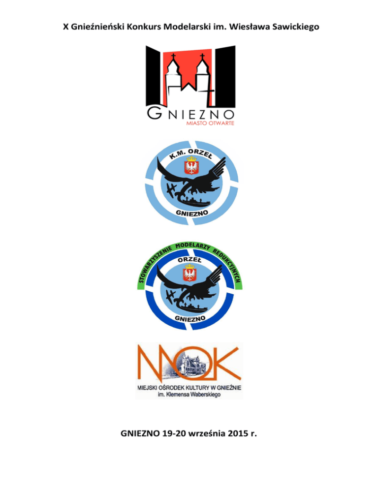 X Gnieźnieński Konkurs Modelarski im. Wiesława Sawickiego GNIEZNO 19-20 września 2015 r. X Gnieźnieński Konkurs Modelarski im. Wiesława Sawickiego Organizatorzy: - Urząd Miejski w Gnieźnie - Miejski Ośrodek Kultury w Gnieźnie - Klub Modelarski Orzeł Gniezno - Stowarzyszenie Modelarzy Redukcyjnych Orzeł Gniezno Termin i miejsce zawodów: 19-20 września 2015 r. Miejski Ośrodek Kultury ul. Łubieńskiego 11 62-200 Gniezno Rodzaj zawodów: X Gnieźnieński Konkurs Modelarski im. Wiesława Sawickiego objęty jest patronatem Prezydenta Miasta Gniezna Tomasza Budasza. Konkurs ma charakter otwarty, mogą w nim wziąć udział modelarze indywidualni jak i zrzeszeni w organizacjach. Termin zgłoszeń: Modele można zgłaszać w dzień imprezy albo poprzez stronę internetową www.modelarstwo.gniezno.pl do 17 września 2015 roku do godziny 23:59. Zakwaterowanie: Organizator zapewnia miejsce noclegowe w centrum miasta oddalone o 150 m od miejsca zawodów (w Internacie Liceum Medycznego). Wyżywienie we własnym zakresie. Zarezerwowana liczba miejsc – 50. Nocleg: 40,00 PLN/ 1 osoba Rezerwacja poprzez kontakt z organizatorem: tel. – 603-532-263 e-mail: [email protected] Giełda modelarska/stoiska klubowe/inne stoiska: Osoby zainteresowane wystawieniem stoiska proszone są o wcześniejszy kontakt. Opłaty nie będą pobierane. tel. – 603-532-263 e-mail: [email protected] Opłaty startowe: Opłaty startowe nie będą pobierane. Ilość wystawionych modeli w klasie jak i w całym konkursie jest nieograniczona. 2 Regulamin zawodów: Modele będą oceniane według zasady „podoba się/nie podoba”. Dokumentacja modelu jest nieobowiązkowa, ale mile widziana. Może być przydatna w przypadku zaistnienia wątpliwości co do zgodności modelu z oryginałem lub jakości i ilości dokonanych zmian. W przypadku, gdy w danej klasie dwa miejsca medalowe zdobędą 2 modele jednego zawodnika do nagrody zostanie wytypowany tylko model o wyższym miejscu. Rozegrane zostaną wszystkie klasy bez wyjątku, nawet gdy będzie w nich tylko 1 model. Organizator zastrzega sobie prawo do zmiany zasad oceny modeli po uzgodnieniu z Sędzią Głównym zawodów. Organizator dopuszcza możliwość łączenia lub podzielenia klas jeśli ilość zgłoszonych modeli na to pozwoli. Organizator nie ubezpiecza modeli i zawodników. Ocena modeli: Ocena wszystkich modeli zostanie przeprowadzona przez grupy sędziowskie złożone z organizatorów. Oficjalny komunikat o ocenie modeli zostanie wywieszony na 2 godziny przed zakończeniem imprezy. Organizator zastrzega sobie prawo zmian w programie godzinowym zawodów, jak również zmian w obsadzie sędziowskiej spowodowanych czynnikami niezależnymi od organizatora. O zaistniałych zmianach organizator poinformuje uczestników zawodów. Nagrody: - wyróżnienia w każdej klasie: statuetka + dyplom - szereg nagród specjalnych za szczególne wyróżnienia oraz puchary ufundowane przez sponsorów i nagrody rzeczowe. Podział klas konkursowych: MODELE PLASTIKOWE Artyleria bez własnego napędu: A1 1:35-1:48 Junior/Senior A2 1:72 Junior/Senior Artyleria z własnym napędem: A3 1:35-1:48 Junior/Senior A4 1:72 Junior/Senior Pojazdy gąsienicowe: G1 1:35 Junior/Senior G2 1:48 Łączona G3 1:72 Junior/Senior Pojazdy kołowe: K1 1:35 K2 1:48 K3 1:72 Junior/Senior Łączona Junior/Senior Pojazdy kołowo-gąsienicowe: KG1 1:35 Junior/Senior KG2 1:72 Junior/Senior 3 Pojazdy cywilne: C1 (ciężarówki) C2 (osobowe) wszystkie skale wszystkie skale Motocykle: M1 1:24 i większe M2 1:35 i mniejsze Łączona Łączona Żaglowce: Ż wszystkie skale Łączona Łączona Łączona Okręty i statki: O1 1:1 - 1:300 Łączona O2 1:301 - 1:500 Łączona O3 1:501 - i mniejsze Łączona O4 okręty podwodne wszystkie skale Łączona Dioramy lądowe: D1 1:35-1:48 D2 1:72 Łączona Łączona Dioramy lotnicze: D3 wszystkie skale Łączona Winiety: W1 1:35-1:48 W2 1:72 Łączone Łączone Śmigłowce: Ś1 1:24-1:32 Ś2 1:48 Ś3 1:72 Junior/Senior Junior/Senior Junior/Senior Samoloty odrzutowe: SO1 1:32 Junior/Senior SO2 1:48 Junior/Senior SO3 1:72 Junior/Senior Samoloty tłokowe: ST1 1:24-1:32 ST2 1:48 ST3 1:72 Junior/Senior Junior/Senior Junior/Senior Samoloty przed II Wojną Światową: SPII1 1:32 Łączona SPII2 1:48 Łączona SPII3 1:72 Łączona Figury: F1 1:24 i większe F2 1:35 i mniejsze Łączona Łączona 4 Pojazdy szynowe: PS1 1:72-1:87 PS2 1:35 Łączona Łączona Science Fiction: SF wszystkie skale Łączona Wszystko inne: WS wszystkie skale Łączona MODELE KARTONOWE Pojazdy gąsienicowe: PGK wszystkie skale Łączona Artyleria bez własnego napędu: AK wszystkie skale Łączona Samoloty: SK wszystkie skale Łączona Pojazdy kołowe: PKK wszystkie skale Łączona Okręty: OK wszystkie skale Łączona Żaglowce: ŻK wszystkie skale Łączona Budowle: BK wszystkie skale Łączona Kolej: KK wszystkie skale Łączona Figury: FK wszystkie skale Łączona Science Fiction (pojazdy, figurki i rakiety fantazyjne): SFK wszystkie skale Łączona Junior – do18 lat włącznie Senior – powyżej 18 lat 5 Program zawodów: Sobota - 19 września 8.00 – 14.00 Przyjmowanie modeli konkursowych* 12.00 - 18.00 Wystawa modelarska 18.00 - ? Ocena konkursowa Niedziela - 20 września 10.00 - 14.00 Wystawa modelarska 12.00 - Ogłoszenie wyników 13:30 - Uroczyste zakończenie zawodów oraz wręczenie nagród ok. 14:30 - Wydawanie modeli *Po uprzednim kontakcie z organizatorem godziny przyjmowania modeli mogą ulec zmianie. 6