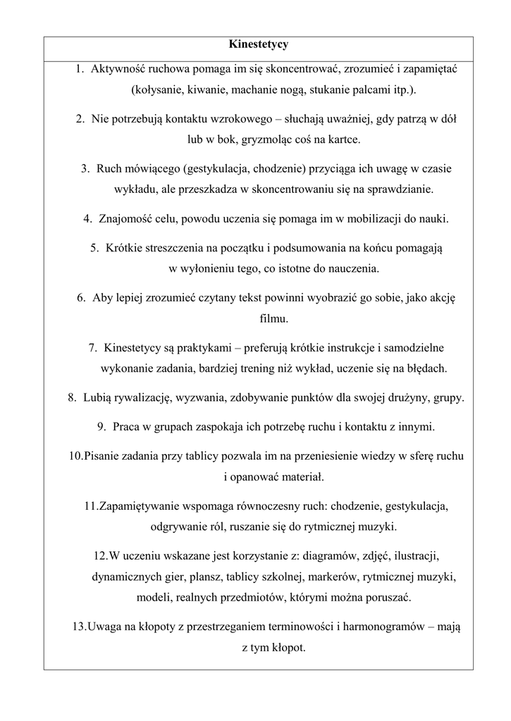 Kinestetycy 1. Aktywność ruchowa pomaga im się skoncentrować, zrozumieć i zapamiętać (kołysanie, kiwanie, machanie nogą, stukanie palcami itp.). 2. Nie potrzebują kontaktu wzrokowego – słuchają uważniej, gdy patrzą w dół lub w bok, gryzmoląc coś na kartce. 3. Ruch mówiącego (gestykulacja, chodzenie) przyciąga ich uwagę w czasie wykładu, ale przeszkadza w skoncentrowaniu się na sprawdzianie. 4. Znajomość celu, powodu uczenia się pomaga im w mobilizacji do nauki. 5. Krótkie streszczenia na początku i podsumowania na końcu pomagają w wyłonieniu tego, co istotne do nauczenia. 6. Aby lepiej zrozumieć czytany tekst powinni wyobrazić go sobie, jako akcję filmu. 7. Kinestetycy są praktykami – preferują krótkie instrukcje i samodzielne wykonanie zadania, bardziej trening niż wykład, uczenie się na błędach. 8. Lubią rywalizację, wyzwania, zdobywanie punktów dla swojej drużyny, grupy. 9. Praca w grupach zaspokaja ich potrzebę ruchu i kontaktu z innymi. 10.Pisanie zadania przy tablicy pozwala im na przeniesienie wiedzy w sferę ruchu i opanować materiał. 11.Zapamiętywanie wspomaga równoczesny ruch: chodzenie, gestykulacja, odgrywanie ról, ruszanie się do rytmicznej muzyki. 12.W uczeniu wskazane jest korzystanie z: diagramów, zdjęć, ilustracji, dynamicznych gier, plansz, tablicy szkolnej, markerów, rytmicznej muzyki, modeli, realnych przedmiotów, którymi można poruszać. 13.Uwaga na kłopoty z przestrzeganiem terminowości i harmonogramów – mają z tym kłopot. Wzrokowcy 1. Lubią ładne rzeczy. Ich uwagę zwraca wizualna strona rzeczywistości: kolory, wzory, obrazy, wizerunki, elementy graficzne, kształty, wzory, rozmiary, relacje. 2. Utrzymują kontakt wzrokowy z rozmówcą, co pozwala im zapamiętać lepiej to, co słyszą. 3. Mogą nie zapamiętać wiele z wykładu, jeśli nie robią własnych notatek. 4. Warto, żeby korzystali z materiałyów z istotnymi informacjami, instrukcjami, wytycznymi, ilustracjami, diagramami, mapami umysłu z wykorzystaniem ciekawych czcionek i kolorów, pozwalające śledzić wykład i zadawać pytania. 5. Łatwiej jest im porozumiewać się metodą pisemną: np. poprzez maile, smsy, tą drogą można przesyłać im przygotowane materiały. 6. Nowego słowa, definicji, wzoru nauczą się szybciej, jeśli zostaną im zaprezentowane wizualnie. 7. W czasie czytania powinni wizualizować sobie to, co czytają. 8. Koncentracje utrudnia im bałagan w otoczeniu lub źle zaprojektowane wnętrze. Dotyczy to również przygotowanych dla nich materiałów (zauważą literówki i źle sformatowany tekst!) 9. Dobrym materiałem do uczenia są dla nich: pokazy na żywo, przedmioty, oglądane na żywo eksperymenty, filmy z napisami, slajdy, prezentacje, tablice, plakaty, podręczniki, przewodniki, gazety, magazyny, instrukcje obsługi. Dotykowcy 1. Ważne są dla nich przyjazne relacje z innymi. Relacje towarzyskie dodają im energii. 2. Otoczeni sympatią zarażają inne osoby entuzjazmem, są troskliwi dla towarzyszy. 3. Utrzymują kontakt wzrokowy z rozmówcą, aby śledzić jego stan emocjonalny (złość, nienawiść, zdenerwowanie utrudnią im koncentrację i zapamiętywanie). 4. Pochwały, słowa uznania oraz pozytywne sygnały przyspieszają ich proces uczenia się. 5. Ważna dla nich jest praca w grupie lubianych osób, w przyjaznej atmosferze. 6. Uczą się szybciej używając dłoni, palców i uczuć. 7. Powiązanie przekazywanego materiału z doznaniami fizycznymi lub uczuciami pozwala im na efektywne zapamiętywanie. 8. W zapamiętywaniu pomaga im tworzenie: szkiców, rysunków, ilustracji, modeli, broszur, barwnych notatek z ładną i kolorową czcionką, map myśli. 9. Lepiej im się myśli, jeśli mogą coś bazgrać, rysować, trzymać w ręku jakiś przedmiot, sporządzać notatki. 10. Wsparciem procesu uczenia są gotowe materiały graficzne wraz z komentarzem. 11. W uczeniu się matematyki ułatwia im kilkakrotne prześledzenie rozwiązania podobnych zadań. 12. W pracy z nimi warto wykorzystywać materiały: szeroki uśmiech na twarzy , programy komputerowe, udział w eksperymentach, grach (niekoniecznie z rywalizacją), tworzenie projektów, map myśli, rysunków. 13. Ważne jest zwrócenie ich uwagi na relaksowanie się: sporty, wygodna pozycja, ulubiona muzyka. Słuchowcy 1. Nie utrzymują kontaktu wzrokowego z rozmówcą, ale uważnie go słuchają patrząc w bok, w stronę własnych uszu. 2. Zwracają uwagę na sposób mówienia, intonację, dykcję, manieryzmy, błędy gramatyczne i syntaktyczne, powtórzenia, ubogie słownictwo, monotonny sposób mówienia. 3. Męczą ich drażniące dźwięki, choć nie lubią też zupełnej ciszy. 4. Ponieważ łatwo rozpraszają ich dźwięki, powinni oni przebywać w otoczeniu, w którym w danej chwili aktywny jest tylko jeden bodziec słuchowy, bez względu na to, czy chodzi o mówcę czy płynącą z radia muzykę. 5. Ciągle komentują i zadają pytania, ich uczenie się przyspiesza udział w dyskusji. 6. Dobrze zapamiętują usłyszany materiał i materiał przeczytany na głos, czytając powinni słyszeć wyobrażony głos w głowie. 7. Wartościowe jest przygotowanie dla nich materiałów, aby mogli łatwiej śledzić tok mówienia rozmówcy, uniknęli wpływu rozproszenia przez dystraktory. 8. Lepiej zapamiętują słowa i potrafią wiernie je przytaczać, jeśli są one skojarzone z muzyką, rymem, rytmem, chwytliwą piosenką lub melodią, poezją, stukaniem, uderzaniem, dźwiękami z otoczenia, naśladując charakterystyczne głosy lub sposób mówienia. 9. Muzyka na żywo, audycje radiowe, płyty, pokazy slajdów z muzyką, filmy, wideo, telewizja, komputery, programy CD-ROM i gry wideo z dobrą muzyką i efektami dźwięków, nagrania wykładów stanowią dla nich najlepsze pomoce naukowe.