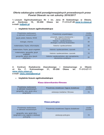 Oferta edukacyjna szkół ponadgimnazjalnych prowadzonych przez Powiat Oławski na rok szkolny 2016/2017 1. Liceum Ogólnokształcące Nr I im. Jana III Sobieskiego w Oławie, pl. Zamkowy 10, 55-200 Oława tel. 71-313-27-48 www.lo.olawa.pl e-mail: [email protected] trzyletnie liceum ogólnokształcące Przedmioty realizowane w zakresie rozszerzonym Przedmioty uzupełniające przyroda, zajęcia artystyczne – techniki artystyczne historia i społeczeństwo, ekologia z ochroną środowiska język polski, historia, WOS biologia, chemia Liczba uczniów 30 30 matematyka, fizyka, informatyka historia i społeczeństwo 30 matematyka, fizyka, język angielski historia i społeczeństwo, rysunek 15 historia i społeczeństwo, rysunek 15 historia i społeczeństwo, abc zarządzania, ekonomia w praktyce 30 matematyka, geografia, język angielski geografia, język obcy (język ang/niem) 2. Centrum Kształcenia Zawodowego i ul. Ks. F. Kutrowskiego 31, 55-200 www.ckziu.olawa.pl, e-mail- [email protected] Ustawicznego w Oławie Oława tel. 71-313-27-11 trzyletnie liceum ogólnokształcące Klasa dziennikarsko-filmowa Przedmioty realizowane w zakresie rozszerzonym geografia, wos, język obcy (ang/niem) Przedmioty dodatkowe/ Zajęcia dodatkowe Liczba uczniów edukacja medialna i filmowa 15 Klasa policyjna Przedmioty realizowane w zakresie rozszerzonym Przedmioty dodatkowe/ Zajęcia dodatkowe Liczba uczniów geografia, wos, język obcy (ang/niem) oraz zajęcia z edukacji policyjnej edukacja policyjna 15 czteroletnie technikum Technik mechanik - innowacja przygotowanie do pracy w służbach mundurowych Przedmioty realizowane w zakresie rozszerzonym Przedmioty dodatkowe/ Zajęcia dodatkowe Liczba uczniów matematyka, fizyka edukacja dla służb mundurowych 30 Technik cyfrowych procesów graficznych Przedmioty realizowane w zakresie rozszerzonym Przedmioty dodatkowe/ Zajęcia dodatkowe Liczba uczniów matematyka, język obcy projekty graficzno-fotograficzne 15 Technik organizacji reklamy Przedmioty realizowane w zakresie rozszerzonym Przedmioty dodatkowe/ Zajęcia dodatkowe Liczba uczniów matematyka, język obcy fotografia produktu 15 Technik żywienia i usług gastronomicznych Przedmioty realizowane w zakresie rozszerzonym Przedmioty dodatkowe/ Zajęcia dodatkowe Liczba uczniów chemia, język obcy kurs carvingu, kultura zawodu 30 Technik hotelarstwa Przedmioty realizowane w zakresie rozszerzonym Przedmioty dodatkowe/ Zajęcia dodatkowe Liczba uczniów geografia, język obcy (ang/niem) kuchnie świata 30 trzyletnia zasadnicza szkoła zawodowa Liczba uczniów Zawód klasa wielozawodowa: mechanik pojazdów samochodowych, mechanik motocyklowy, elektromechanik, ślusarz, operator obrabiarek skrawających, murarz-tynkarz, kucharz, piekarz, cukiernik, fryzjer, lakiernik, blacharz samochodowy 30 3. Zespół Szkół Ponadgimnazjalnych Nr 2 im. Zjednoczonej Europy w Oławie, ul. 3 Maja 18 E, 55-200 Oława tel. 71-313-26-36 , www.zsp2olawa.edu.pl e-mail: [email protected] czteroletnie technikum Technik ekonomista z innowacją programową: PSYCHOLOGIA BIZNESU Przedmioty realizowane w zakresie rozszerzonym Przedmioty dodatkowe/ Zajęcia dodatkowe Liczba uczniów geografia, język obcy psychologia w biznesie 15 Technik handlowiec z innowacją programową: PSYCHOLOGIA BIZNESU Przedmioty realizowane w zakresie rozszerzonym Przedmioty dodatkowe/ Zajęcia dodatkowe Liczba uczniów geografia, język obcy psychologia w biznesie 15 Technik informatyk z innowacją programową: ROBOTYKA Przedmioty realizowane w zakresie rozszerzonym Przedmioty dodatkowe/ Zajęcia dodatkowe Liczba uczniów matematyka, informatyka konstruowanie i programowanie robotów 15 Technik informatyk z innowacją programową: TWORZENIE GIER KOMPUTEROWYCH ROBOTYKA Przedmioty realizowane w zakresie rozszerzonym Przedmioty dodatkowe/ Zajęcia dodatkowe Liczba uczniów matematyka, informatyka grafika komputerowa, tworzenie programowanie gier komputerowych 15 Technik logistyk - klasa wojskowa Przedmioty realizowane w zakresie rozszerzonym Przedmioty dodatkowe/ Zajęcia dodatkowe Liczba uczniów geografia, język obcy edukacja obronna 30 Technik logistyk Przedmioty realizowane w zakresie rozszerzonym Przedmioty dodatkowe/ Zajęcia dodatkowe Liczba uczniów geografia, język obcy - 30 Technik spedytor z innowacją programową: BEZPIECZEŃSTWO WEWNĘTRZNE-OCHRONA OSÓB I MIENIA Przedmioty realizowane w zakresie rozszerzonym Przedmioty dodatkowe/ Zajęcia dodatkowe Liczba uczniów geografia, język obcy bezpieczeństwo osób i mienia 30 trzyletnia zasadnicza szkoła zawodowa Liczba uczniów Zawód klasa wielozawodowa: sprzedawca, fryzjer, kucharz, lakiernik, stolarz, mechanik pojazdów samochodowych, monter sieci- instalacji i urządzeń sanitarnych. 60 4. Zespół Szkół im. J. Kasprowicza w Jelczu-Laskowicach, ul. Techników 26, 55-221 Jelcz-Laskowice tel. 71-318-82-20, www.zsjelcz.pl, e-mail: [email protected] trzyletnie liceum ogólnokształcące - podnoszące sprawność fizyczną Przedmioty realizowane w zakresie rozszerzonym Przedmioty uzupełniające historia i społeczeństwo geografia, język obcy Liczba uczniów 30 czteroletnie technikum Technik informatyk Przedmioty realizowane w zakresie rozszerzonym Liczba uczniów matematyka, informatyka 30 trzyletnia zasadnicza szkoła zawodowa Zawód klasa wielozawodowa : piekarz, cukiernik, fryzjer, krawiec, tapicer, mechanik pojazdów samochodowych, ślusarz, blacharz samochodowy, elektromechanik pojazdów samochodowych, murarz, stolarz, rzeźnik-wędliniarz, operator obrabiarek skrawających, złotnik-jubiler, introligator, elektryk, monter instalacji i urządzeń sanitarnych Liczba uczniów 30 Dodatkowych informacji udzielają: sekretariaty szkół ponadgimnazjalnych, Poradnia Psychologiczno-Pedagogiczna w Oławie, Poradnia Psychologiczno-Pedagogiczna w Jelczu-Laskowicach, Wydział Oświaty, Kultury Sportu i Zdrowia Starostwa Powiatowego w Oławie.