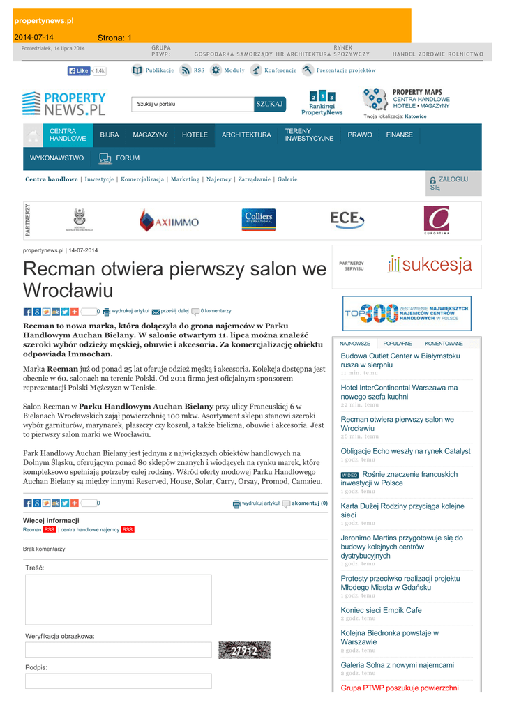 propertynews.pl 2014-07-14 Strona: 1 GRUPA PTWP: Poniedziałek, 14 lipca 2014 Like RYNEK G O S P O D A R K A S A M O R Z Ą D Y H R ARCHITEKTURA S P O Ż Y W C Z Y Publikacje 1.4k RSS Moduły Konferencje Prezentacje projektów CENTRA HANDLOWE HOTELE • MAGAZYNY SZUKAJ Szukaj w portalu HANDEL ZDROWIE R O L N I C T W O Twoja lokalizacja: Katowice CENTRA HANDLOWE BIURA WYKONAWSTWO MAGAZYNY HOTELE ARCHITEKTURA TERENY INWESTYCYJNE PRAWO FINANSE FORUM ZALOGUJ SIĘ Centra handlowe | Inwestycje | Komercjalizacja | Marketing | Najemcy | Zarządzanie | Galerie propertynews.pl | 14-07-2014 Recman otwiera pierwszy salon we Wrocławiu 0 wydrukuj artykuł prześlij dalej 0 komentarzy Recman to nowa marka, która dołączyła do grona najemców w Parku Handlowym Auchan Bielany. W salonie otwartym 11. lipca można znaleźć szeroki wybór odzieży męskiej, obuwie i akcesoria. Za komercjalizację obiektu odpowiada Immochan. Marka Recman już od ponad 25 lat oferuje odzież męską i akcesoria. Kolekcja dostępna jest obecnie w 60. salonach na terenie Polski. Od 2011 firma jest oficjalnym sponsorem reprezentacji Polski Mężczyzn w Tenisie. NAJNOWSZE POPULARNE KOMENTOWANE Budowa Outlet Center w Białymstoku rusza w sierpniu 11 min. temu Hotel InterContinental Warszawa ma nowego szefa kuchni Salon Recman w Parku Handlowym Auchan Bielany przy ulicy Francuskiej 6 w Bielanach Wrocławskich zajął powierzchnię 100 mkw. Asortyment sklepu stanowi szeroki wybór garniturów, marynarek, płaszczy czy koszul, a także bielizna, obuwie i akcesoria. Jest to pierwszy salon marki we Wrocławiu. 22 min. temu Park Handlowy Auchan Bielany jest jednym z największych obiektów handlowych na Dolnym Śląsku, oferującym ponad 80 sklepów znanych i wiodących na rynku marek, które kompleksowo spełniają potrzeby całej rodziny. Wśród oferty modowej Parku Handlowego Auchan Bielany są między innymi Reserved, House, Solar, Carry, Orsay, Promod, Camaieu. Obligacje Echo weszły na rynek Catalyst Recman otwiera pierwszy salon we Wrocławiu 26 min. temu 1 godz. temu WIDEO Rośnie znaczenie francuskich inwestycji w Polsce 1 godz. temu 0 Więcej informacji wydrukuj artykuł skomentuj (0) Karta Dużej Rodziny przyciąga kolejne sieci 1 godz. temu Recman RSS | centra handlowe najemcy RSS Brak komentarzy Treść: Jeronimo Martins przygotowuje się do budowy kolejnych centrów dystrybucyjnych 1 godz. temu Protesty przeciwko realizacji projektu Młodego Miasta w Gdańsku 1 godz. temu Koniec sieci Empik Cafe 2 godz. temu Weryfikacja obrazkowa: Kolejna Biedronka powstaje w Warszawie 2 godz. temu Podpis: Galeria Solna z nowymi najemcami 2 godz. temu Grupa PTWP poszukuje powierzchni propertynews.pl 2014-07-14 Strona: 2 biurowej w centrum Warszawy DODAJ KOMENTARZ NEWSLETTER PROPERTY NEWS POLECAMY W DZIALE Budowa Outlet Center w Białymstoku rusza w sierpniu ZAPISZ Podaj e-mail Koniec sieci Empik Cafe Galeria Solna z nowymi najemcami Znamy plany rozwoju marki Wojas MULTIMEDIA Rośnie znaczenie francuskich inwestycji w Polsce Alchemia II z kamieniem węgielnym Zmiany w kierownictwie Atrium Retail Map Hotels Map Warehouses Map Twoja lokalizacja Katowice [ZMIEŃ] Map data ©2014 Google Terms of Use Przejdź do mapy Podaj nazwę centrum handlowego KALENDARIUM Rusza konkurs Prime Property Prize 2014 Rusza konkurs Prime Property Prize 2014 22-23 września 2014, Warszawa Salon Nieruchomości i Inwestycji INVESTFIELD Targi Wyposażenia Hoteli INVEST-HOTEL 2014 propertynews.pl 2014-07-14 Strona: 3 OSTATNIO NA FORUM Paweł Tamborski wciąż w zawieszeniu tesla ,dobre sobie, kurs nie poczeka więc spadki, spadki, spadki. zachciało się polityki na giełdzie... Neinver wybrał dyrektora Galerii Katowickiej Danuta Swora ,Szanowni Panstwo, prosze o kontakt w sprawie naszej (planowanej)akcji - wymiana kulturalna na teraenie galerii. Nasze stowarzyszenie paris-berlin warschau w niemczech (Saarland). Danuta... Polskie nieruchomości wciąż na celowniku zagranicznych inwestorów growisz ,Największy pootencjał widać w nieruchomościach magazynowych i nie sądzę, aby sytuacja mogła się tutaj prędko zmienić. Prawda jest taka, że potencjał w branży jest ogromny, o ile na... POLECANE PROJEKTY PROPERTY NEWS BUSINESS PARK MARYWILSKA | Emmerson S.A. Agencja Mienia Wojskowego KCI S.A. Kraków - ZESPÓŁ BIUROWO-MIESZKANIOWY REDAKCJA • REKLAMA • REGULAMIN • POLITYKA PRYWATNOŚCI • POLITYKA COOKIES • KONTAKT • MODUŁY INFORMACJI • RSS • PARTNERZY Centra handlowe Biura Magazyny Hotele Finanse Katowice Warszawa Inwestycje Inwestycje Inwestycje Inwestycje Waluty Kraków Trójmiasto Komercjalizacja Komercjalizacja Komercjalizacja Sieci Akcje i indeksy Łódź Szczecin Marketing Najemcy Zarządzanie Euro 2012 Komentarze giełdowe Poznań Wrocław POLECAMY W SERWISACH Specjalizujemy się w tworzeniu zintegrowanych rozwiązań w obszarze komunikacji biznesowej. Serwisy i wydawnictwa o budowie i urządzaniu domu. PLIKI COOKIES: Stosujemy pliki cookies, aby ułatwić korzystanie z serwisu. Dowiedz się więcej » [ x ]