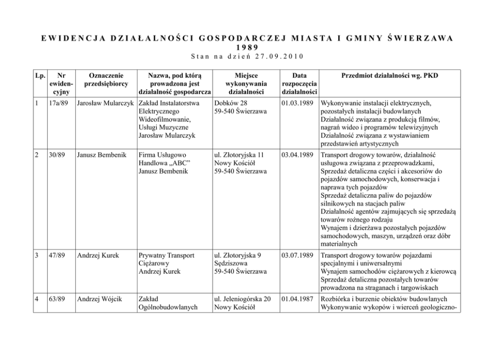 ewidencja działalności gospodarczej miasta i gminy świerzawa 1989