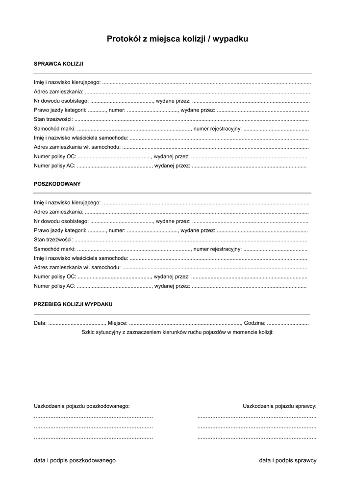 Protokół z miejsca kolizji / wypadku SPRAWCA KOLIZJI Imię i nazwisko kierującego: ............................................................................................................................................ Adres zamieszkania: ....................................................................................................................................................... Nr dowodu osobistego: .........................................., wydane przez: ............................................................................... Prawo jazdy kategorii: ............, numer: .................................., wydane przez: .............................................................. Stan trzeźwości: ............................................................................................................................................................. Samochód marki: ............................................................................, numer rejestracyjny: ............................................ Imię i nazwisko właściciela samochodu: ........................................................................................................................ Adres zamieszkania wł. samochodu: ............................................................................................................................. Numer polisy OC: ................................................., wydanej przez: .............................................................................. Numer polisy AC: .................................................., wydanej przez: ............................................................................. POSZKODOWANY Imię i nazwisko kierującego: ........................................................................................................................................... Adres zamieszkania: ...................................................................................................................................................... Nr dowodu osobistego: .........................................., wydane przez: .............................................................................. Prawo jazdy kategorii: ............, numer: .................................., wydane przez: ............................................................. Stan trzeźwości: ............................................................................................................................................................ Samochód marki: ............................................................................, numer rejestracyjny: ........................................... Imię i nazwisko właściciela samochodu: ....................................................................................................................... Adres zamieszkania wł. samochodu: ............................................................................................................................ Numer polisy OC: ................................................., wydanej przez: .............................................................................. Numer polisy AC: .................................................., wydanej przez: ............................................................................. PRZEBIEG KOLIZJI WYPDAKU Data: ......................................, Miejsce: ..........................................................................., Godzina: ............................ Szkic sytuacyjny z zaznaczeniem kierunków ruchu pojazdów w momencie kolizji: Uszkodzenia pojazdu poszkodowanego: Uszkodzenia pojazdu sprawcy: ........................................................................ ........................................................................ ........................................................................ ........................................................................ ........................................................................ ........................................................................ data i podpis poszkodowanego data i podpis sprawcy