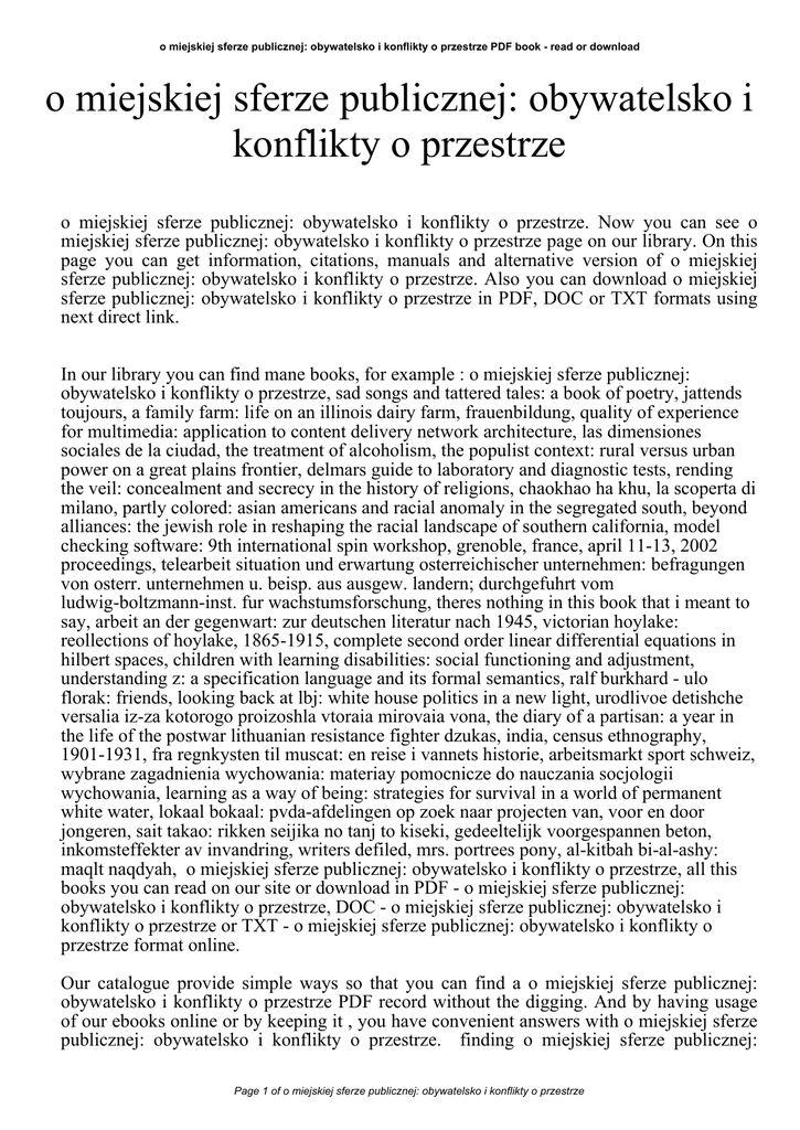 o miejskiej sferze publicznej: obywatelsko i konflikty o przestrze PDF book - read or download o miejskiej sferze publicznej: obywatelsko i konflikty o przestrze o miejskiej sferze publicznej: obywatelsko i konflikty o przestrze. Now you can see o miejskiej sferze publicznej: obywatelsko i konflikty o przestrze page on our library. On this page you can get information, citations, manuals and alternative version of o miejskiej sferze publicznej: obywatelsko i konflikty o przestrze. Also you can download o miejskiej sferze publicznej: obywatelsko i konflikty o przestrze in PDF, DOC or TXT formats using next direct link. In our library you can find mane books, for example : o miejskiej sferze publicznej: obywatelsko i konflikty o przestrze, sad songs and tattered tales: a book of poetry, jattends toujours, a family farm: life on an illinois dairy farm, frauenbildung, quality of experience for multimedia: application to content delivery network architecture, las dimensiones sociales de la ciudad, the treatment of alcoholism, the populist context: rural versus urban power on a great plains frontier, delmars guide to laboratory and diagnostic tests, rending the veil: concealment and secrecy in the history of religions, chaokhao ha khu, la scoperta di milano, partly colored: asian americans and racial anomaly in the segregated south, beyond alliances: the jewish role in reshaping the racial landscape of southern california, model checking software: 9th international spin workshop, grenoble, france, april 11-13, 2002 proceedings, telearbeit situation und erwartung osterreichischer unternehmen: befragungen von osterr. unternehmen u. beisp. aus ausgew. landern; durchgefuhrt vom ludwig-boltzmann-inst. fur wachstumsforschung, theres nothing in this book that i meant to say, arbeit an der gegenwart: zur deutschen literatur nach 1945, victorian hoylake: reollections of hoylake, 1865-1915, complete second order linear differential equations in hilbert spaces, children with learning disabilities: social functioning and adjustment, understanding z: a specification language and its formal semantics, ralf burkhard - ulo florak: friends, looking back at lbj: white house politics in a new light, urodlivoe detishche versalia iz-za kotorogo proizoshla vtoraia mirovaia vona, the diary of a partisan: a year in the life of the postwar lithuanian resistance fighter dzukas, india, census ethnography, 1901-1931, fra regnkysten til muscat: en reise i vannets historie, arbeitsmarkt sport schweiz, wybrane zagadnienia wychowania: materiay pomocnicze do nauczania socjologii wychowania, learning as a way of being: strategies for survival in a world of permanent white water, lokaal bokaal: pvda-afdelingen op zoek naar projecten van, voor en door jongeren, sait takao: rikken seijika no tanj to kiseki, gedeeltelijk voorgespannen beton, inkomsteffekter av invandring, writers defiled, mrs. portrees pony, al-kitbah bi-al-ashy: maqlt naqdyah, o miejskiej sferze publicznej: obywatelsko i konflikty o przestrze, all this books you can read on our site or download in PDF - o miejskiej sferze publicznej: obywatelsko i konflikty o przestrze, DOC - o miejskiej sferze publicznej: obywatelsko i konflikty o przestrze or TXT - o miejskiej sferze publicznej: obywatelsko i konflikty o przestrze format online. Our catalogue provide simple ways so that you can find a o miejskiej sferze publicznej: obywatelsko i konflikty o przestrze PDF record without the digging. And by having usage of our ebooks online or by keeping it , you have convenient answers with o miejskiej sferze publicznej: obywatelsko i konflikty o przestrze. finding o miejskiej sferze publicznej: Page 1 of o miejskiej sferze publicznej: obywatelsko i konflikty o przestrze o miejskiej sferze publicznej: obywatelsko i konflikty o przestrze PDF book - read or download obywatelsko i konflikty o przestrze, you are find our website comprehensive assortment of o miejskiej sferze publicznej: obywatelsko i konflikty o przestrze manuals listed. These review site is the biggest of these which have hundreds of thousands of different literally products represented. So as to there are specific sites catered to different product also categories or types, niches or brands related with o miejskiej sferze publicznej: obywatelsko i konflikty o przestrze. So depending on just what you are searching, you'll be able to choose ebooks o miejskiej sferze publicznej: obywatelsko i konflikty o przestrze to fit your own needs, o miejskiej sferze publicznej: obywatelsko i konflikty o przestrze. Page 2 of o miejskiej sferze publicznej: obywatelsko i konflikty o przestrze