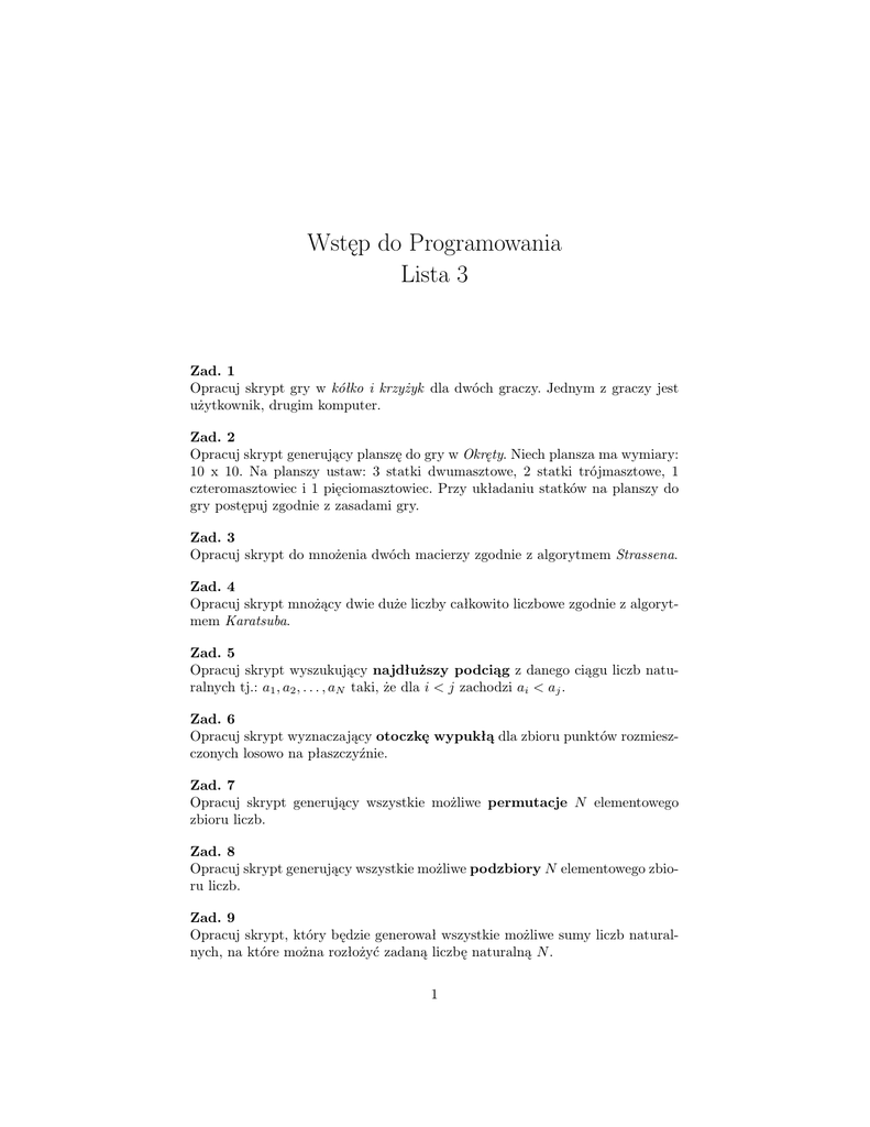 Wstęp do Programowania Lista 3 Zad. 1 Opracuj skrypt gry w kółko i krzyżyk dla dwóch graczy. Jednym z graczy jest użytkownik, drugim komputer. Zad. 2 Opracuj skrypt generujący planszę do gry w Okręty. Niech plansza ma wymiary: 10 x 10. Na planszy ustaw: 3 statki dwumasztowe, 2 statki trójmasztowe, 1 czteromasztowiec i 1 pięciomasztowiec. Przy układaniu statków na planszy do gry postępuj zgodnie z zasadami gry. Zad. 3 Opracuj skrypt do mnożenia dwóch macierzy zgodnie z algorytmem Strassena. Zad. 4 Opracuj skrypt mnożący dwie duże liczby całkowito liczbowe zgodnie z algorytmem Karatsuba. Zad. 5 Opracuj skrypt wyszukujący najdłuższy podciąg z danego ciągu liczb naturalnych tj.: a1 , a2 , . . . , aN taki, że dla i < j zachodzi ai < aj . Zad. 6 Opracuj skrypt wyznaczający otoczkę wypukłą dla zbioru punktów rozmieszczonych losowo na płaszczyźnie. Zad. 7 Opracuj skrypt generujący wszystkie możliwe permutacje N elementowego zbioru liczb. Zad. 8 Opracuj skrypt generujący wszystkie możliwe podzbiory N elementowego zbioru liczb. Zad. 9 Opracuj skrypt, który będzie generował wszystkie możliwe sumy liczb naturalnych, na które można rozłożyć zadaną liczbę naturalną N . 1 Zad. 10 Opracuj skrypt, generujący ciąg N licz pseudolosowych. Zad. 11 Utwórz tablicę (tab1) o wymiarach 10x10 wypełnioną liczbami naturalnymi z przedziału h1, 500i. Następnie: a) Każdą liczbę nieparzystą, która nie jest liczbą pierwszą zastąp jej pierwiastkiem. b) Jeśli jakaś liczba jest palindromem, zastąp ją liczbą 500. Policz, ile palindromów wystąpiło w tablicy. c) Utwórz nową tablicę (tab2), do której przeniesiesz wiersze, w których co najmniej 5 elementów ma wartość wyższą od średniej wartości elementów występujących w oryginalnej tablicy (tab1). d) Sortując odpowiednio elementy nowej tablicy (tab2), znajdź jej największy i najmniejszy element. Zad. 12 Niech: RozmD - wyrażona w centymetrach średnica pizzy dużej; CenaD – cena pizzy dużej; RozmM - wyrażona w centymetrach średnica pizzy małej; CenaM - cena pizzy małej. Opracuj funkcję, która dla odpowiednich parametrów RozmD, RozmM, CenaD, CenaM: a) Wyznaczy cenę za cm2 małej i dużej pizzy; b) Wyznaczy o ile procent cm2 pizzy małej jest droższy/tańszy od cm2 pizzy dużej; c) Wyznaczy ile kosztowałaby pizza o średnicy takiej jak duża, ale o cenie za cm2 równej tej w pizzy małej. 2
