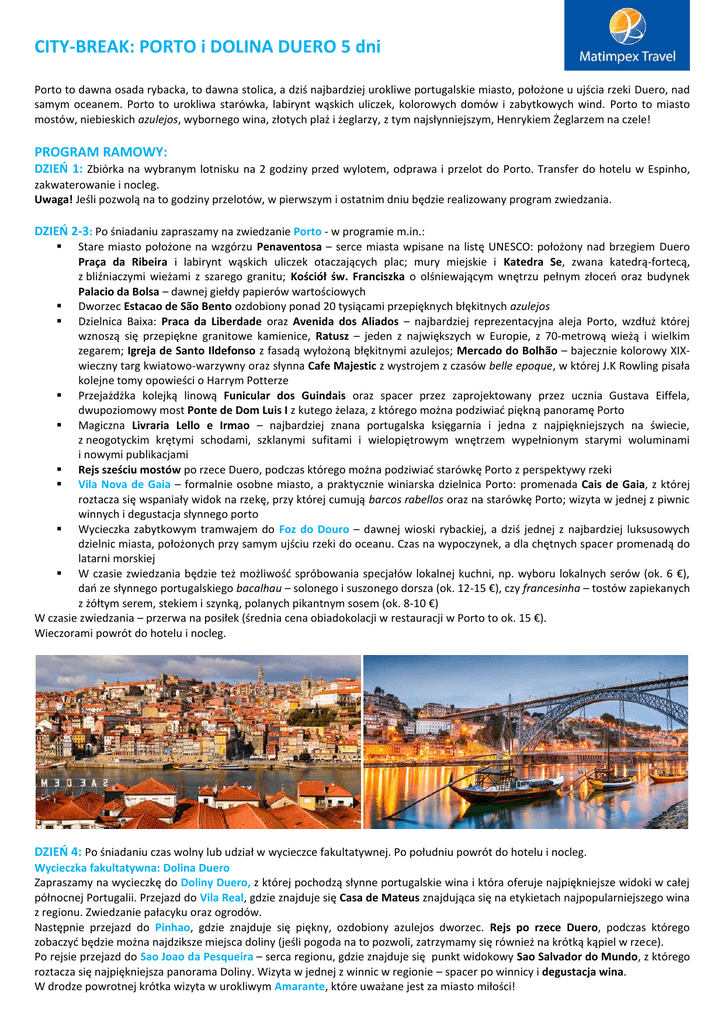 CITY-BREAK: PORTO i DOLINA DUERO 5 dni