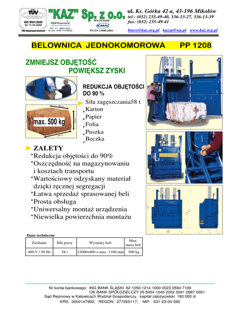 ul. ul. Ks. Górka 42 a, 43-196 Mikołów 09ATEXQS6 PN-EN 13980:2004 tel.: (032) 235-49-40, 336-13-27, 336-13-39 fax: (032) 235-49-41 [email protected] [email protected] www.kaz.org.pl BELOWNICA JEDNOKOMOROWA PP 1208 ZMNIEJSZ OBJĘTOŚĆ POWIĘKSZ ZYSKI REDUKCJA OBJĘTOŚCI DO 90 % Siła zagęszczania58 t Karton Papier Folia Puszka Beczka ZALETY Redukcja objętości do 90% Oszczędność na magazynowaniu i kosztach transportu Wartościowy odzyskany materiał dzięki ręcznej segregacji Łatwa sprzedaż sprasowanej beli Prosta obsługa Uniwersalny montaż urządzenia Niewielka powierzchnia montażu Dane techniczne Zasilanie Siła prasy Wymiary beli Max. masa beli 400 V / 50 Hz 58 t 12000x800 x max. 1100 mm 500 kg Nr konta bankowego: ING BANK ŚLĄSKI 62 1050 1214 1000 0023 0594 7109 OK BANK SPÓŁDZIELCZY 25 8454 1040 2002 0041 2887 0001 Sąd Rejonowy w Katowicach Wydział Gospodarczy, kapitał założycielski 180 000 zł KRS: 0000147992; REGON: 277265117; NIP: 631-23-00-560 BELOWNICA JEDNOKOMOROWA PP 1208 Masa beli do 500 kg siła prasowania do 580 kN (ok. 58 ton) nacisk powierzchniowy do 60t/m² skok stempla prasującego - 890 mm nastawny system prowadzenia stempla Typ Strautmann TopPlus Brak oczekiwania na zakończenie procesu prasowania automatyczne sterowanie Typ Strautmann MicroLogic krótki czas trwania procesu Komfort obsługi belownicy sterowanie logiczne Typ Strautmann MircoLogic sygnał świetlny informujący o wykonaniu beli półautomatyczny system wiązania beli proste wiązanie beli przy otwartych drzwiach łatwy dostęp i wymiana szpuli z taśmą poziom hałasu poniżej 80 [dB] Łatwe napełnianie komory niewielka powierzchnia montażu powierzchnia montażowa poniżej 2m², nie wystające drzwi napełniania wygodne otwieranie i zamykanie otworu wsadowego dzięki pionowym przesuwnym drzwiom System Strautmann QuickDoor wystający materiał jak np. karton, może być przy pomocy pionowych, przesuwnych drzwi, System Strautmann QuickDoor, wciśnięty do środka komory prasy Duża pojemność komory jednorazowy napełnienie do 1,5 m³ Duża objętość dopełnienia długi wysuw stempla gwarantuje dopełnienie do 0,85m³ chroniony patentem system hamowania podnoszącego się sprasowanego materiału Typ Strautmann CircleSystem umożliwia przeprowadzenie procesu dopełnienia do osiągnięcia odpowiedniej masy beli. Wygodny wyładunek beli chroniony patentem system wyładunku beli Typ Strautmann BaleMatic tzn. oddzielny cylinder hydrauliczny i automatyczny powrót stożkowe wykonanie ścian bocznych Standard bezpieczeństwa potrójny wyłącznik magnetyczny sprawdzający domknięcie rygla drzwi dodatkowe dolne zabezpieczenie drzwi przed otworzeniem GS geprüfte Sicherheit - certyfikat bezpieczeństwa w Niemczech wykonano zgodnie z dyrektywami CE Wyposażenie seryjne siła prasowania - 58 t 4 sztuki szpuli z taśma Strautmann SU 19/200 50 klipsów do zawiązania taśmy opasającej bele opuszczany cylinder do transportu wysokość maszyny po opuszczeniu cylindra - 2150 mm Wyposażenie opcjonalne różne wysokości transportu (1950 mm, 2150 mm, 2350 mm) zintegrowany ze stemplem system wiązania beli automatycznie otwieranie drzwi dodatkowe szpule z taśmą Typ Strautmann SU 13/500 urządzenie do dociągania taśmy na beli ocynkowane elementy belownicy do pracy w wilgotnych warunkach podłączenie do odciągu kurzu i pyłu wykonanie instalacji elektrycznej w sposób uniemożliwiający eksplozję system hydrauliczny pracujący na Bio oleju Nr konta bankowego: ING BANK ŚLĄSKI 62 1050 1214 1000 0023 0594 7109 OK BANK SPÓŁDZIELCZY 25 8454 1040 2002 0041 2887 0001 Sąd Rejonowy w Katowicach Wydział Gospodarczy, kapitał założycielski 180 000 zł KRS: 0000147992; REGON: 277265117; NIP: 631-23-00-560