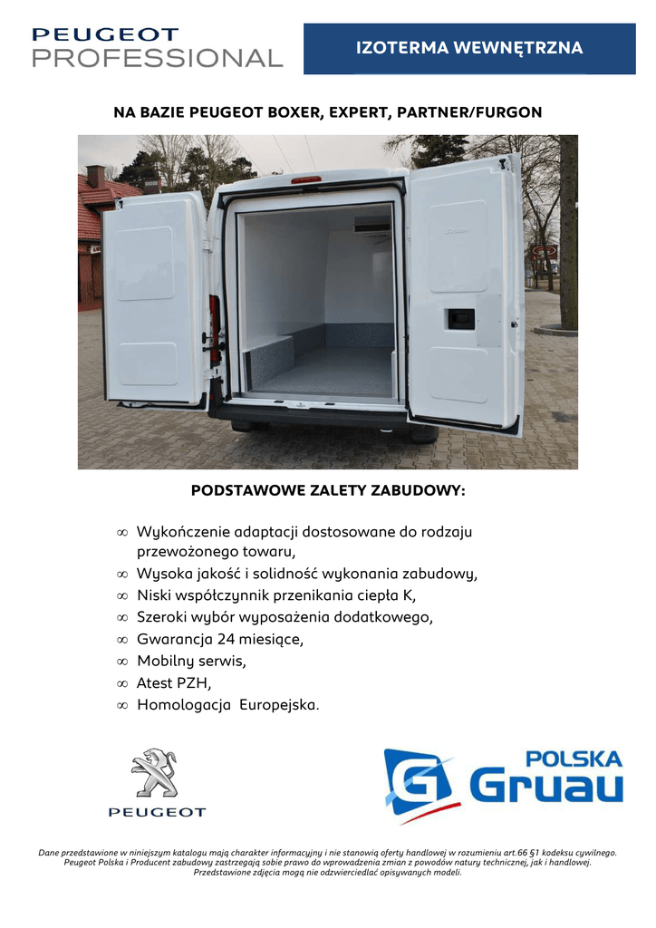 IZOTERMA WEWNĘTRZNA NA BAZIE PEUGEOT BOXER, EXPERT, PARTNER/FURGON PODSTAWOWE ZALETY ZABUDOWY: • Wykończenie adaptacji dostosowane do rodzaju przewożonego towaru, • Wysoka jakość i solidność wykonania zabudowy, • Niski współczynnik przenikania ciepła K, • Szeroki wybór wyposażenia dodatkowego, • Gwarancja 24 miesiące, • Mobilny serwis, • Atest PZH, • Homologacja Europejska. Dane przedstawione w niniejszym katalogu mają charakter informacyjny i nie stanowią oferty handlowej w rozumieniu art.66 §1 kodeksu cywilnego. Peugeot Polska i Producent zabudowy zastrzegają sobie prawo do wprowadzenia zmian z powodów natury technicznej, jak i handlowej. Przedstawione zdjęcia mogą nie odzwierciedlać opisywanych modeli. IZOTERMA WEWNĘTRZNA CHARAKTERYSTYKA ZABUDOWY: • Wykonanie izolacji wewnętrznej. Materiał użyty : przekładkowy (poliester z pianką) o gr. 50 mm. Powierzchnia wewnętrzna gładka, koloru białego, • Druga uszczelka montowana na dodatkowej futrynce drzwi, • Podłoga: - izolowana pianką o gr. 50 mm, - wzmocniona sklejką, - wylewką antypoślizgową do wysokości nadkoli, • Oświetlenie przedziału – 1 punkt zamontowany w suficie, • Drzwi tylne izolowane pianką 50 mm pokryte wykładką laminatową, • Wzmocnienie pod montaż agregatu, • Drzwi boczne przesuwne izolowane z możliwością użytkowania, OPCJE DODATKOWE: • • • • • • • • • Agregat chłodzący lub chłodząco-grzewczy Podłoga wykończona blachą ryflowaną lub kwasową, Dodatkowe drzwi boczne wewnętrzne, Wersja dwukomorowa z wykorzystaniem przegrody stałej lub mobilnej, Szeroki wybór akcesoriów do mocowania ładunku, Podesty, Kuweta pod agregat, Półki składane lub stałe, Certyfikat ATP w klasie FRC i FNA. Dane przedstawione w niniejszym katalogu mają charakter informacyjny i nie stanowią oferty handlowej w rozumieniu art.66 §1 kodeksu cywilnego. Peugeot Polska i Producent zabudowy zastrzegają sobie prawo do wprowadzenia zmian z powodów natury technicznej, jak i handlowej. Przedstawione zdjęcia mogą nie odzwierciedlać opisywanych modeli.