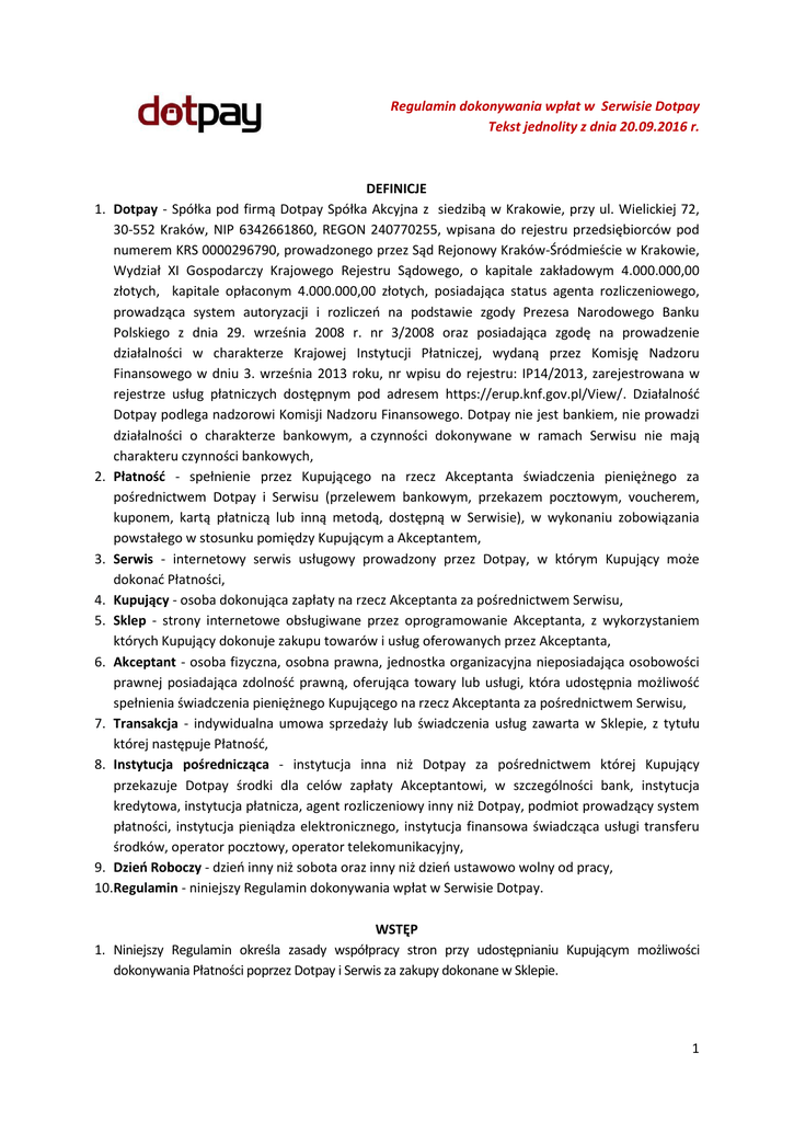 Regulamin dokonywania wpłat w Serwisie Dotpay Tekst jednolity z dnia 20.09.2016 r. DEFINICJE 1. Dotpay - Spółka pod firmą Dotpay Spółka Akcyjna z siedzibą w Krakowie, przy ul. Wielickiej 72, 30-552 Kraków, NIP 6342661860, REGON 240770255, wpisana do rejestru przedsiębiorców pod numerem KRS 0000296790, prowadzonego przez Sąd Rejonowy Kraków-Śródmieście w Krakowie, Wydział XI Gospodarczy Krajowego Rejestru Sądowego, o kapitale zakładowym 4.000.000,00 złotych, kapitale opłaconym 4.000.000,00 złotych, posiadająca status agenta rozliczeniowego, prowadząca system autoryzacji i rozliczeń na podstawie zgody Prezesa Narodowego Banku Polskiego z dnia 29. września 2008 r. nr 3/2008 oraz posiadająca zgodę na prowadzenie działalności w charakterze Krajowej Instytucji Płatniczej, wydaną przez Komisję Nadzoru Finansowego w dniu 3. września 2013 roku, nr wpisu do rejestru: IP14/2013, zarejestrowana w rejestrze usług płatniczych dostępnym pod adresem https://erup.knf.gov.pl/View/. Działalność Dotpay podlega nadzorowi Komisji Nadzoru Finansowego. Dotpay nie jest bankiem, nie prowadzi działalności o charakterze bankowym, a czynności dokonywane w ramach Serwisu nie mają charakteru czynności bankowych, 2. Płatność - spełnienie przez Kupującego na rzecz Akceptanta świadczenia pieniężnego za pośrednictwem Dotpay i Serwisu (przelewem bankowym, przekazem pocztowym, voucherem, kuponem, kartą płatniczą lub inną metodą, dostępną w Serwisie), w wykonaniu zobowiązania powstałego w stosunku pomiędzy Kupującym a Akceptantem, 3. Serwis - internetowy serwis usługowy prowadzony przez Dotpay, w którym Kupujący może dokonać Płatności, 4. Kupujący - osoba dokonująca zapłaty na rzecz Akceptanta za pośrednictwem Serwisu, 5. Sklep - strony internetowe obsługiwane przez oprogramowanie Akceptanta, z wykorzystaniem których Kupujący dokonuje zakupu towarów i usług oferowanych przez Akceptanta, 6. Akceptant - osoba fizyczna, osobna prawna, jednostka organizacyjna nieposiadająca osobowości prawnej posiadająca zdolność prawną, oferująca towary lub usługi, która udostępnia możliwość spełnienia świadczenia pieniężnego Kupującego na rzecz Akceptanta za pośrednictwem Serwisu, 7. Transakcja - indywidualna umowa sprzedaży lub świadczenia usług zawarta w Sklepie, z tytułu której następuje Płatność, 8. Instytucja pośrednicząca - instytucja inna niż Dotpay za pośrednictwem której Kupujący przekazuje Dotpay środki dla celów zapłaty Akceptantowi, w szczególności bank, instytucja kredytowa, instytucja płatnicza, agent rozliczeniowy inny niż Dotpay, podmiot prowadzący system płatności, instytucja pieniądza elektronicznego, instytucja finansowa świadcząca usługi transferu środków, operator pocztowy, operator telekomunikacyjny, 9. Dzień Roboczy - dzień inny niż sobota oraz inny niż dzień ustawowo wolny od pracy, 10.Regulamin - niniejszy Regulamin dokonywania wpłat w Serwisie Dotpay. WSTĘP 1. Niniejszy Regulamin określa zasady współpracy stron przy udostępnianiu Kupującym możliwości dokonywania Płatności poprzez Dotpay i Serwis za zakupy dokonane w Sklepie. 1 2. Regulamin zostaje bezpłatnie udostępniony Kupującemu przed dokonaniem Płatności poprzez zamieszczenie go na stronie internetowej Dotpay pod adresem www.dotpay.pl w postaci elektronicznej, pozwalającej na jego przechowywanie i odtwarzanie w zwykłym toku czynności. 3. Dotpay przyjmuje zlecenie płatnicze wykonania Płatności po wprowadzeniu do Serwisu danych Kupującego, akceptacji Regulaminu przez Kupującego, w dniu uznania rachunku bankowego Dotpay kwotą Płatności lub uznania kwotą Płatności rachunku bankowego instytucji płatniczej, która przyjmuje środki w imieniu lub na rzecz Dotpay. 4. Dotpay nie prowadzi dla Kupującego rachunku płatniczego, o którym mowa w ustawie z dnia 19.08.2011 r. o usługach płatniczych ani rachunku bankowego w rozumieniu Prawa bankowego, a czynności dokonywane w ramach Serwisu nie mają charakteru czynności bankowych. 5. Momentem otrzymania przez Dotpay od Kupującego zlecenia płatniczego dokonania Płatności jest dzień, w którym rachunek bankowy Dotpay, lub rachunek bankowy instytucji płatniczej, która przyjmuje środki w imieniu lub na rzecz Dotpay, uznany został kwotą Płatności. 6. Kupujący w celu korzystania z usług, o których mowa w Regulaminie musi posiadać infrastrukturę techniczną i system informatyczny pozwalający na korzystanie z zasobów Internetu, konta e-mail oraz przeglądarki zasobów internetowych umożliwiającej wyświetlanie stron WWW. Zaleca się stosowanie najbardziej aktualnej wersji jednej z następujących przeglądarek, z włączoną opcją „cookies” (obsługa plików cookies), Java Script i SSL: Microsoft Internet Explorer, Opera, Mozilla Firefox, Safari, Google Chrome. §1 ZASADY OBSŁUGI PŁATNOŚCI 1. Kupujący wyraża wolę zapłaty Akceptantowi za pośrednictwem Serwisu poprzez wybranie w Sklepie opcji „Płatność Dotpay”. 2. Celem dokonania Płatności, Kupujący podaje następujące dane: imię, nazwisko, adres zamieszkania, adres e-mail, telefon. 3. Kupujący, po przekierowaniu na strony internetowe Serwisu, wybiera formę dokonania Płatności dostępną w Serwisie. 4. W zależności od wybranej formy Płatności, po poprawnym dokonaniu Płatności Instytucja pośrednicząca przekazuje Dotpay, lub instytucji płatniczej działającej w imieniu lub na rzecz Dotpay, środki pieniężne dla celów zapłaty Akceptantowi za zakupione w Sklepie towary lub usługi. Po weryfikacji płatności w Instytucji pośredniczącej Dotpay przekazuje Akceptantowi potwierdzenie dokonania Płatności, a Akceptant przekazuje Kupującemu zakupiony towar lub usługę albo wykonuje inne czynności uzgodnione w umowie pomiędzy Kupującym a Akceptantem. 5. Płatność jest dostępna dla Akceptanta w czasie do 15 minut od momentu otrzymania przez Dotpay potwierdzen