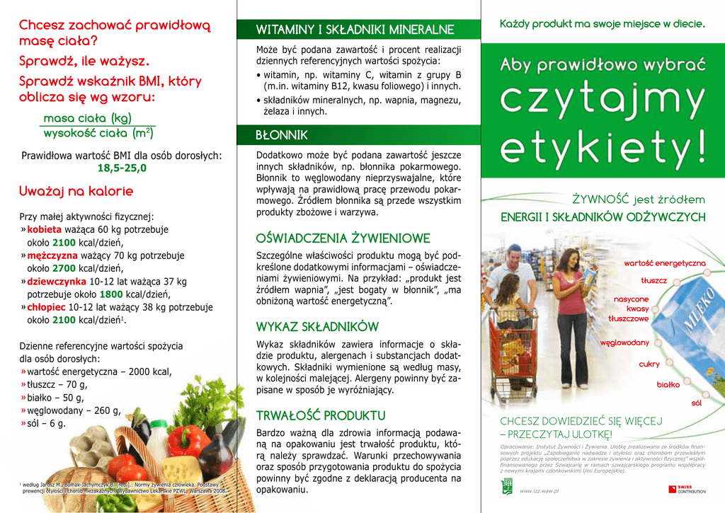 Chcesz zachować prawidłową masę ciała? Sprawdź, ile ważysz. Sprawdź wskaźnik BMI, który oblicza się wg wzoru: masa ciała (kg) wysokość ciała (m2) Prawidłowa wartość BMI dla osób dorosłych: 18,5-25,0 Uważaj na kalorie Przy małej aktywności fizycznej: Ikobieta ważąca 60 kg potrzebuje około 2100 kcal/dzień, Imężczyzna ważący 70 kg potrzebuje około 2700 kcal/dzień, Idziewczynka 10-12 lat ważąca 37 kg potrzebuje około 1800 kcal/dzień, Ichłopiec 10-12 lat ważący 38 kg potrzebuje około 2100 kcal/dzień1. Dzienne referencyjne wartości spożycia dla osób dorosłych: Iwartość energetyczna ‒ 2000 kcal, Itłuszcz ‒ 70 g, Ibiałko ‒ 50 g, Iwęglowodany ‒ 260 g, Isól ‒ 6 g. 1 według Jarosz M., Bułhak‑Jachymczyk B. [red.].: Normy żywienia człowieka. Podstawy prewencji otyłości i chorób niezakaźnych. Wydawnictwo Lekarskie PZWL, Warszawa 2008. WITAMINY I SKŁADNIKI MINERALNE Każdy produkt ma swoje miejsce w diecie. Może być podana zawartość i procent realizacji dziennych referencyjnych wartości spożycia: • witamin, np. witaminy C, witamin z grupy B (m.in. witaminy B12, kwasu foliowego) i innych. • składników mineralnych, np. wapnia, magnezu, żelaza i innych. BŁONNIK Dodatkowo może być podana zawartość jeszcze innych składników, np. błonnika pokarmowego. Błonnik to węglowodany nieprzyswajalne, które wpływają na prawidłową pracę przewodu pokarmowego. Źródłem błonnika są przede wszystkim produkty zbożowe i warzywa. ŻYWNOŚĆ jest źródłem ENERGII I SKŁADNIKÓW ODŻYWCZYCH OŚWIADCZENIA ŻYWIENIOWE Szczególne właściwości produktu mogą być podkreślone dodatkowymi informacjami – oświadczeniami żywieniowymi. Na przykład: „produkt jest źródłem wapnia”, „jest bogaty w błonnik”, „ma obniżoną wartość energetyczną”. wartość energetyczna tłuszcz nasycone kwasy tłuszczowe WYKAZ SKŁADNIKÓW węglowodany Wykaz składników zawiera informacje o składzie produktu, alergenach i substancjach dodatkowych. Składniki wymienione są według masy, w kolejności malejącej. Alergeny powinny być zapisane w sposób je wyróżniający. cukry białko sól TRWAŁOŚĆ PRODUKTU Bardzo ważną dla zdrowia informacją podawaną na opakowaniu jest trwałość produktu, którą należy sprawdzać. Warunki przechowywania oraz sposób przygotowania produktu do spożycia powinny być zgodne z deklaracją producenta na opakowaniu. CHCESZ DOWIEDZIEĆ SIĘ WIĘCEJ – PRZECZYTAJ ULOTKĘ! Opracowanie: Instytut Żywności i Żywienia. Ulotkę zrealizowano ze środków finansowych projektu „Zapobieganie nadwadze i otyłości oraz chorobom przewlekłym poprzez edukację społeczeństwa w zakresie żywienia i aktywności fizycznej” współfinansowanego przez Szwajcarię w ramach szwajcarskiego programu współpracy z nowymi krajami członkowskimi Unii Europejskiej. www.izz.waw.pl Ż y w n o ść jes t źródłe m e ne rgii i składni kó w odży wc zy c h WARTOŚĆ ODŻYWCZA WĘGLOWODANY Wartość odżywcza żywności to jej przydatność do pokrycia potrzeb organizmu na niezbędne składniki. Obejmuje wartość energetyczną oraz zawartość składników odżywczych. Na opakowaniu podaje się wybrane składniki istotne dla zachowania zdrowia. Wartość odżywcza wyrażana jest na 100 g lub 100 ml produktu oraz dodatkowo na porcję. Powinny być podstawowym źródłem energii w diecie. Są niezbędne dla układu nerwowego i mózgu. Zaleca się spożywanie węglowodanów złożonych (skrobia), obecnych w produktach zbożowych (chleb, kasze, makarony, ryż), ziemniakach i warzywach. WARTOŚĆ ENERGETYCZNA Wynika głównie z zawartości w produkcie białka, tłuszczu, węglowodanów oraz błonnika. Wyrażana jest w kilodżulach (kJ) i kilokaloriach (kcal). BIAŁKO Jest ważnym składnikiem diety, niezbędnym do prawidłowej budowy, rozwoju i funkcjonowania organizmu. Musi być spożywane codziennie. Białko występuje zarówno w produktach zwierzęcych (mleko, sery, mięso, ryby, drób), jak i w roślinnych (produkty zbożowe, rośliny strączkowe). Wartości odżywcze sera żółtego w 100 g Wartość energetyczna 353 kcal Tłuszcz 28 g Nasycone kwasy tłuszczowe 17 g Węglowodany 0g Cukry 0g Białko 26 g Sól 1,9 g CUKRY Do cukrów prostych zalicza się jednocukry (glukoza, fruktoza) i dwucukry (sacharoza, laktoza). Nie powinno się spożywać więcej niż 90 g cukrów dziennie. Niektóre produkty mają napis „bez dodatku cukru”, chociaż podana jest jego zawartość. Oznacza to, że w trakcie produkcji nie dodano cukru, a jego zawartość wynika z naturalnej obecności cukrów w surowcach. TŁUSZCZ NASYCONE KWASY TŁUSZCZOWE SÓL Jest ważnym składnikiem dostarczającym energii. Zawiera kwasy tłuszczowe i witaminy (A, D, E, K). Zaleca się spożywanie przede wszystkim tłuszczów roślinnych (oleje), bogatych w niezbędne nienasycone kwasy tłuszczowe. Ważne też jest spożywanie ryb, gdyż ich tłuszcz zawiera wielonienasycone kwasy tłuszczowe z rodziny omega-3. Występują głównie w produktach pochodzenia zwierzęcego oraz w produktach zawierających utwardzane tłuszcze roślinne (tłuszcze cukiernicze) i olej palmowy. Nie powinno się ich spożywać więcej niż 20 g/dzień. Choć niezbędna dla człowieka, spożywana w nadmiarze jest niekorzystna. Powszechnie dodawana jest do wielu produktów (pieczywo, wędliny, żółte sery, słone przekąski itp.). Ponieważ spożywamy dużo soli, trzeba ją ograniczyć do 6 g/dzień.