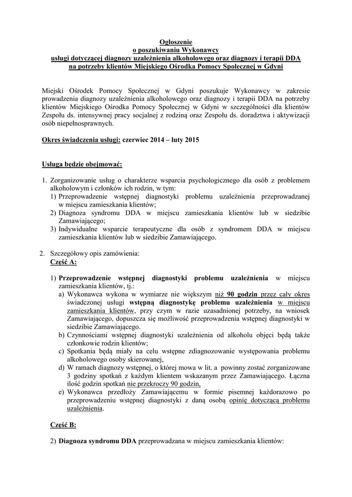 Ogłoszenie o poszukiwaniu Wykonawcy usługi dotyczącej diagnozy uzależnienia alkoholowego oraz diagnozy i terapii DDA na potrzeby klientów Miejskiego Ośrodka Pomocy Społecznej w Gdyni Miejski Ośrodek Pomocy Społecznej w Gdyni poszukuje Wykonawcy w zakresie prowadzenia diagnozy uzależnienia alkoholowego oraz diagnozy i terapii DDA na potrzeby klientów Miejskiego Ośrodka Pomocy Społecznej w Gdyni w szczególności dla klientów Zespołu ds. intensywnej pracy socjalnej z rodziną oraz Zespołu ds. doradztwa i aktywizacji osób niepełnosprawnych. Okres świadczenia usługi: czerwiec 2014 – luty 2015 Usługa będzie obejmować: 1. Zorganizowanie usług o charakterze wsparcia psychologicznego dla osób z problemem alkoholowym i członków ich rodzin, w tym: 1) Przeprowadzenie wstępnej diagnostyki problemu uzależnienia przeprowadzanej w miejscu zamieszkania klientów; 2) Diagnoza syndromu DDA w miejscu zamieszkania klientów lub w siedzibie Zamawiającego; 3) Indywidualne wsparcie terapeutyczne dla osób z syndromem DDA w miejscu zamieszkania klientów lub w siedzibie Zamawiającego. 2. Szczegółowy opis zamówienia: Część A: 1) Przeprowadzenie wstępnej diagnostyki problemu uzależnienia w miejscu zamieszkania klientów, tj.: a) Wykonawca wykona w wymiarze nie większym niż 90 godzin przez cały okres świadczonej usługi wstępną diagnostykę problemu uzależnienia w miejscu zamieszkania klientów, przy czym w razie uzasadnionej potrzeby, na wniosek Zamawiającego, dopuszcza się możliwość przeprowadzenia wstępnej diagnostyki w siedzibie Zamawiającego. b) Czynnościami wstępnej diagnostyki uzależnienia od alkoholu objęci będą także członkowie rodzin klientów; c) Spotkania będą miały na celu wstępne zdiagnozowanie występowania problemu alkoholowego osoby skierowanej, d) W ramach diagnozy wstępnej, o której mowa w lit. a powinny zostać zorganizowane 3 godziny spotkań z każdym klientem wskazanym przez Zamawiającego. Łączna ilość godzin spotkań nie przekroczy 90 godzin, e) Wykonawca przedłoży Zamawiającemu w formie pisemnej każdorazowo po przeprowadzeniu wstępnej diagnostyki z daną osobą opinię dotyczącą problemu uzależnienia. Część B: 2) Diagnoza syndromu DDA przeprowadzana w miejscu zamieszkania klientów: a) Wykonawca wykona w wymiarze nie większym niż 90 godzin diagnozę syndromu DDA. b) Diagnoza będzie przeprowadzana w miejscu zamieszkania klientów, lub w siedzibie Zamawiającego. c) W ramach diagnozy, o której mowa w lit. a powinny zostać zorganizowane 3 godziny spotkań z każdym klientem wskazanym przez Zamawiającego. Łączna ilość godzin spotkań nie przekroczy 90 godzin. d) Spotkania mają mieć na celu zdiagnozowanie występowania syndromu DDA u klientów MOPS. 3) Indywidualne wsparcie terapeutyczne dla osób z syndromem DDA a) Wykonawca wykona w wymiarze nie większym niż 130 godzin indywidualne wsparcie terapeutyczne dla osób ze zdiagnozowanym syndromem DDA. b) Indywidualne wsparcie terapeutyczne będzie prowadzone w miejscu zamieszkania klientów lub w gabinecie Wykonawcy, w uzasadnionych przypadkach może też odbywać się w siedzibie Zamawiającego. c) Indywidualne wsparcie terapeutyczne ma na celu rozbudzenie samoświadomości, która pozwoli na uwolnienie się od traumatycznych przeżyć z dzieciństwa związanych z nadużywaniem alkoholu przez rodziców oraz ewentualne zmotywowanie uczestnika do podjęcia grupowej terapii dla osób z syndromem DDA d) W czasie indywidualnej pracy terapeutycznej uczestnicy dowiedzą się o: istocie problemu alkoholowego i jego wpływie na życie wszystkich członków rodziny, wpływie picia alkoholu przez rodziców na życie dzieci i problemach, jakie z tego powodu powstają w dorosłym życiu tych dzieci, możliwości pracy nad własnymi deficytami psychologicznymi, rolach życiowych, prawach osobistych, hierarchii wartości, wyznaczaniu celów życiowych, źródłach doświadczanych aktualnie trudności życiowych o tym jak uświadomić sobie osobiste krzywdy doznane w dzieciństwie uwolnieniu stłumionych urazów i uczuć uwolnieniu od poczucia krzywdy rozpoczęciu pracy nad budową własnej nowej tożsamości o tym jak uświadomić sobie własne wewnętrzne zasoby i możliwości nauce nowych zachowań służących wzmacnianiu poczucia własnej wartości e) Ilość spotkań z każdą osobą musi być dostosowana do indywidualnych potrzeb. Przy czym średnia ilość godzin przeznaczona na pracę z jedną osobą nie powinna przekroczyć 7 godzin pracy terapeutycznej. 3. Wymagania stawiane Wykonawcy do realizacji w/w zakresu zamówienia: 1) Do realizacji usługi opisanej w pkt 2 ppkt 1 (Część A) - niezbędne jest dysponowanie co najmniej jedną osobą posiadającą wykształcenie wyższe psychologiczne lub pedagogiczne o kierunku pedagogika resocjalizacyjna, przy czym: a) osoba ta powinna posiadać minimum dwuletnie doświadczenie w realizowaniu diagnozy problemu uzależnienia alkoholowego; b) osoba ta musi posiadać minimum jednoroczne doświadczenie w pracy z osobami z problemem uzależnienia od alkoholu - klientami ośrodka pomocy społecznej. 2) Do realizacji usługi opisanej w pkt 2 ppkt 2 i 3 (Część B) - niezbędne jest dysponowanie co najmniej jedną osobą posiadającą wykształcenie wyższe psychologiczne oraz certyfikat specjalisty psychoterapii uzależnień, na podstawie przepisów rozporządzenia Ministra Zdrowia z dnia 25 czerwca 2012r. w sprawie organizacji, kwalifikacji personelu, sposobu funkcjonowania i rodzajów podmiotów leczniczych wykonujących świadczenia stacjonarne i całodobowe oraz ambulatoryjne w sprawowaniu opieki nad uzależnionymi od alkoholu oraz sposobu współdziałania w tym zakresie z instytucjami publicznymi i organizacjami społecznymi (Dz. U. 2012, poz. 734) Ponadto ww. osoba musi posiadać minimum dwuletnie doświadczenie w realizowaniu terapii osób z syndromem DDA oraz doświadczenie w pracy z klientami ośrodka pomocy 