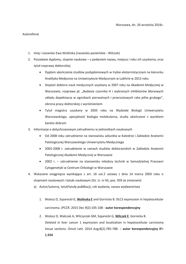 Warszawa, dn. 26 września 2016r. Autoreferat 1. Imię i nazwisko Ewa Wolińska (nazwisko panieńskie - Wilczek) 2. Posiadane dyplomy, stopnie naukowe – z podaniem nazwy, miejsca i roku ich uzyskania, oraz tytuł rozprawy doktorskiej · Dyplom ukończenia studiów podyplomowych w trybie eksternistycznym na kierunku Analityka Medyczna na Uniwersytecie Medycznym w Lublinie w 2013 roku · Stopień doktora nauk medycznych uzyskany w 2007 roku na Akademii Medycznej w Warszawie, rozprawa pt. „Badania czynnika H i wybranych inhibitorów błonowych układu dopełniacza w ogniskach pierwotnych i przerzutowych raka jelita grubego”, obrona pracy doktorskiej z wyróżnieniem · Tytuł magistra uzyskany w 2003 roku na Wydziale Biologii Uniwersytetu Warszawskiego, specjalność biologia molekularna, studia ukończone z wynikiem bardzo dobrym 3. Informacje o dotychczasowym zatrudnieniu w jednostkach naukowych · Od 2008 roku zatrudnienie na stanowisku adiunkta w Katedrze i Zakładzie Anatomii Patologicznej Warszawskiego Uniwersytetu Medycznego · 2003-2008 r. zatrudnienie w ramach studiów doktoranckich w Zakładzie Anatomii Patologicznej Akademii Medycznej w Warszawie · 2002 r. – zatrudnienie na stanowisku młodszy technik w Samodzielnej Pracowni Cytogenetyki w Centrum Onkologii w Warszawie 4. Wskazane osiągnięcia wynikające z art. 16 ust.2 ustawy z dnia 14 marca 2003 roku o stopniach naukowych i tytule naukowym (Dz. U. nr 65, poz. 959 ze zmianami) a) Autor/autorzy, tytuł/tytuły publikacji, rok wydania, nazwa wydawnictwa 1. Wolosz D, Szparecki G, Wolinska E and Gornicka B. DLC3 expression in hepatocellular carcinoma. JPCCR. 2015 Dec 9(2):105-108 - autor korespondencyjny 2. Wolosz D, Walczak A, Wilczynski GM, Szparecki G, Wilczek E, Gornicka B. Deleted in liver cancer 1 expression and localization in hepatocellular carcinoma tissue sections. Oncol Lett. 2014 Aug;8(2):785-788. – autor korespondencyjny IF= 1.554 3. Wilczek E, Szparecki G, Lukasik D, Koperski L, Winiarska M, Wilczynski GM, Wasiutynski A, Gornicka B. Loss of the orphan nuclear receptor SHP is more pronounced in fibrolamellar carcinoma than in typical hepatocellular carcinoma. PLoS One. 2012;7(1):e30944. IF=3,73 4. Wilczek E, Rzepko R, Nowis D, Legat M, Golab J, Glab M, Gorlewicz A, Konopacki F, Mazurkiewicz M, Sladowski D, Gornicka B, Wasiutynski A, Wilczynski GM. The possible role of factor H in colon cancer resistance to complement attack. Int J Cancer. 2008 May 1;122(9):2030-7. IF=4,734 5. Wilczek E, Wasiutynski A, Śladowski D, Wilczynski GM, Górnicka B: “ The expression of membranous complement inhibitors CD46, CD55 and CD59 in the primary and metastatic colon cancer cell lines derived from the same patient”; Centr Eur J Immunol 2013; 38 (4): 549-555) IF= 0,358 6. Wilczek E, Wasiutynski A, Śladowski D, Wilczynski GM, Górnicka B: “Comparison of the expression of complement regulatory proteins CD46, CD55 and CD59 in primary colon cancer and synchronous/ metachronous liver metastases”: Centr Eur J Immunol 2013; 38 (4): 543-548 IF= 0,358 b) Omówienie celu naukowego wyżej wymienionych prac i osiągniętych wyników wraz z omówieniem ich ewentualnego wykorzystania Postęp w badaniach molekularnych jaki się dokonał w ostatnich latach pozwolił na lepszą charakterystykę a tym samym na lepsze zrozumienie podłoża powstawania nowotworów. Za jedne z głównych mechanizmów prowadzących do rozwoju nowotworów uznano nieprawidłowe funkcjonowanie takich procesów komórkowych, jak proliferacja, różnicowanie czy apoptoza. Dlatego też w sposobach kontroli tego typu procesów poszukuje się obecnie mechanizmów, które mogłyby stanowić potencjalny cel terapii przeciwnowotworowej. Stąd też ogromne zainteresowanie zarówno badaczy w dziedzinie nauk podstawowych, jak i klinicystów na całym świecie budzą badania dające możliwość wytypowania takich zmian molekularnych w nowotworach, których zniwelowanie mogłoby przynieść wymierny efekt terapeutyczny u pacjentów. W przypadku kilku typów nowotworów takie podejście naukowe zaowocowało stworzeniem efektywnej terapii celowanej. Sukcesem terapeutycznym okazał się m.in. Rituximab, przeciwciało skierowane przeciwko cząsteczkom CD20, stosowany w leczeniu chłoniaków, czy też Trastuzumab, stosowany w leczeniu raka sutka wykazującego nadekspresję receptora HER2. W przypadku raka wątrobowokomórkowego pierwszym tego rodzaju lekiem zastosowanym w leczeniu zaawansowanych postaci raka był Sorafenib, białko blokujące wiele typów kinaz tyrozynowych, oraz receptory m.in. VEGFR czy PDGFR. Jednak jego zastosowanie przyniosło umiarkowane efekty, jako, że, jak pokazały badania kliniczne, lek ten wydłużał średni czas przeżycia pacjentów jedynie o około 3 miesiące. Przedmiotem mojego zainteresowania były wybrane aspekty patogenezy nowotworów układu pokarmowego zachodzące na poziomie komórkowym i molekularnym. W moich badaniach skupiłam się na dwóch typach nowotworów: 1) najpowszechniejszym pierwotnym raku wątroby, raku wątrobowokomórkowym, oraz 2) rakach jelita grubego, które stosunkowo najczęściej dają przerzuty do wątroby z powodu uwarunkowań anatomicznych, przy czym w tej grupie nowotworów analizowałam zarówno guzy pierwotne jak i przerzutowe. Rak wątrobowokomórkowy (z ang. hepatocellular carcinoma, HCC) stanowi jeden z najczęstszych pierwotnych raków wątroby. Najnowsze badania wskazują, że jest to trzeci pod względem śmiertelności nowotwór wśród mężczyzn i piąty wśród kobiet w populacji światowej. Wśród czynników etiologicznych związanych z jego powstawaniem wymienia się wirusowe zapalenie wątroby typu B i C, alkohol, oraz wpływ aflatoksyn wytwarzanych przez grzyby z rodzaju Aspergillus. Częstość jego występowania na świecie jest zróżnicowana w zależności od regionu geograficznego. W krajach azjatyckich, w związku z większą częstotliwością występowania zakażeń wirusowych wątro