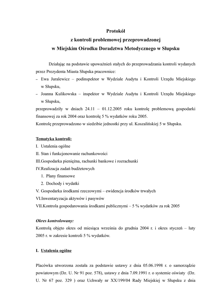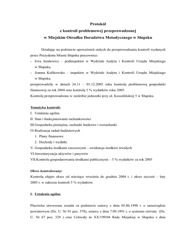 Protokół z kontroli problemowej przeprowadzonej w Miejskim Ośrodku Doradztwa Metodycznego w Słupsku Działając na podstawie upoważnień stałych do przeprowadzania kontroli wydanych przez Prezydenta Miasta Słupska pracownice: – Ewa Juralewicz – podinspektor w Wydziale Audytu i Kontroli Urzędu Miejskiego w Słupsku, – Joanna Kulikowska – inspektor w Wydziale Audytu i Kontroli Urzędu Miejskiego w Słupsku, przeprowadziły w dniach 24.11 – 01.12.2005 roku kontrolę problemową gospodarki finansowej za rok 2004 oraz kontrolę 5 % wydatków roku 2005. Kontrolę przeprowadzono w siedzibie jednostki przy ul. Koszalińskiej 5 w Słupsku. Tematyka kontroli: I. Ustalenia ogólne II. Stan i funkcjonowanie rachunkowości III.Gospodarka pieniężna, rachunki bankowe i rozrachunki IV.Realizacja zadań budżetowych 1. Plany finansowe 2. Dochody i wydatki V. Gospodarka środkami rzeczowymi – ewidencja środków trwałych VI.Inwentaryzacja aktywów i pasywów VII.Kontrola gospodarowania środkami publicznymi – 5 % wydatków za rok 2005 Okres kontrolowany: Kontrolą objęto okres od miesiąca września do grudnia 2004 r. i okres styczeń – luty 2005 r. w zakresie kontroli 5 % wydatków. I. Ustalenia ogólne Placówka utworzona została za podstawie ustawy z dnia 05.06.1998 r. o samorządzie powiatowym (Dz. U. Nr 91 poz. 578), ustawy z dnia 7.09.1991 r. o systemie oświaty (Dz. U. Nr 67 poz. 329 ) oraz Uchwały nr XX/199/04 Rady Miejskiej w Słupsku z dnia 28.01.2004 r. w sprawie przyjęcia strategii oświatowej miasta Słupska na lata 2004-2009. Z dniem 1 września 2004 r. Uchwałą nr XXVII/301/04 Rady Miejskiej w Słupsku z dnia 30.06.2004 r. utworzono Miejski Ośrodek Doradztwa Metodycznego w Słupsku. Miejski Ośrodek Doradztwa Metodycznego jest placówką doskonalenia nauczycieli. Obejmuje zasięgiem swojego działania szkoły i placówki publiczne, dla których organem prowadzącym jest gmina miejska Słupsk. Celem MODM jest realizowanie zadań z zakresu doskonalenia nauczycieli, ze szczególnym uwzględnieniem doradztwa metodycznego. Do zadań Miejskiego Ośrodka Doradztwa Metodycznego w Słupsku należy w szczególności: 1. współpraca z organem nadzoru pedagogicznego, organem prowadzącym, dyrektorami szkół i placówek, dotycząca realizacji priorytetów: państwa, województwa oraz miasta w zakresie doskonalenia nauczycieli; 2. diagnozowanie potrzeb w dziedzinie doskonalenia nauczycieli oraz stanu ich kwalifikacji zawodowych; 3. organizowanie różnorodnych form doskonalenia zawodowego nauczycieli; 4. tworzenie i rozwijanie systemu informacji głównie z zakresu: pedagogiki, psychologii, metodyki nauczania, prawa oświatowego; 5. tworzenie warunków do wymiany doświadczeń, współpracy pomiędzy nauczycielami poszczególnych specjalności, typów oraz rodzajów szkół i placówek; 6. opieka merytoryczna nad ruchem nowatorstwa pedagogicznego i popularyzacja jego efektów; 7. diagnozowanie rozwoju zawodowego nauczycieli, a także wspieranie metodyczne nauczycieli, odbywających staż na kolejny stopień awansu zawodowego; 8. wspomaganie rozwoju wewnątrzszkolnych systemów doskonalenia nauczycieli; 9. wspieranie przeprowadzania badań nad efektem pracy szkół i placówek; 10.ewaluacja procesu doskonalenia zawodowego nauczycieli; 11.współpraca w zakresie doskonalenia nauczycieli z biblioteką pedagogiczną, uczelniami wyższymi, wydawnictwami podręczników szkolnych i innymi instytucjami. Dyrektorem Miejskiego Ośrodka Doradztwa Metodycznego jest Pani Barbara Grędecka powołana na stanowisko z dniem 1 września 2004 r. Zarządzeniem Nr 563/O/04 Prezydenta Miasta Słupska z dnia 14.07.2004 r. 2 Zarządzeniem Nr 698/O/04 Prezydenta Miasta Słupska z dnia 18.08.2004 r. udzielono Pani Barbarze Grędeckiej pełnomocnictwa do dokonywania czynności prawnych związanych z kierowaniem bieżącą działalnością MODM w Słupsku. Pełnomocnictwo uprawnia do kierowania ośrodkiem w ramach jego statutowej działalności, reprezentowania ośrodka na zewnątrz i składania jednoosobowo oświadczeń woli w sprawach majątkowych, a zwłaszcza zawierania mów cywilnoprawnych zgodnie z ustawą o zamówieniach publicznych, otwierania konta bankowego i dysponowania środkami finansowymi znajdującymi się na tym koncie zgodnie z obowiązującymi w tym zakresie przepisami, udzielania dalszych pełnomocnictw do dokonywania czynności szczególnych, oddania nieruchomości lub jej części w najem, dzierżawę albo jej użyczenia w drodze umowy z równoczesnym zawiadomieniem organu prowadzącego. Pełnomocnictwa udzielono na czas określony od dnia 1.09.2004 r. do dnia 31.08.2009 r. II. Stan i funkcjonowanie rachunkowości W jednostce opracowano dokumentację opisującą przyjęte zasady rachunkowości: 1. Zarządzeniem Nr 1/2004 Dyrektora Miejskiego Ośrodka Doradztwa Metodycznego w Słupsku z dnia 01.09.2004 r. wprowadzono zakładowy plan kont opracowany na podstawie rozporządzenia Ministra Finansów z dnia 18 grudnia 2001 r. w sprawie szczegółowych zasad rachunkowości oraz niektórych jednostek sektora finansów publicznych (Dz.U. Nr 153 poz. 1752), 2. Zarządzeniem Nr 2/2004 Dyrektora Miejskiego Ośrodka Doradztwa Metodycznego w Słupsku z dnia 01.09.2004 r. wprowadzono instrukcję określającą procedury kontroli wydatków dokonanych ze środków publicznych i zasad wstępnej oceny celowości ponoszonych wydatków w związku z realizacją zadań opracowaną na podstawie art. 28A ust. 1 i 2, art. 35A ust. 1 i 2 ustawy z dnia 26 listopada 1993 r. o finansach publicznych, 3. Zarządzeniem Nr 3/2004 Dyrektora Miejskiego Ośrodka Doradztwa Metodycznego w Słupsku z dnia 01.09.2004 r. wprowadzono instrukcję określającą obieg dokumentów księgowych i kontroli wewnętrznej - w instrukcji powołano się na nieobowiązujące przepisy zarządzenia nr 46 Ministra Finansów z dnia 1 sierpnia 1995 r. w sprawie szczególnych zasad prowadzenia rachunkowości oraz jednolitych planów ko