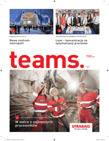 30 22 Projekty / REWITALIZACJA Jednostki koncernu STRABAG / WPROWADZENIE Nowe centrum metropolii Lean – koncentracja na optymalizacji procesów t eams 10 Magazyn STRABAG SE Nr 01 2014 Temat z okładki / Human Resource Development W walce o najlepszych pracowników STRA_01_14_teams_final_pl_r12.indd 1 28.05.14 16:04 Spis treści 02 www.strabag.com 06 Aktualności / KOBIETY STRABAG na obcasach 18 Ludzie w firmie STRABAG / MY CAŁKIEM PRYWATNIE „To, co jest wyobrażalne, jest także wykonalne!” Projekty / TECHNICZNE WYPOSAŻENIE BUDYNKÓW Czysta sprawa 34 26 Jednostki koncernu STRABAG / KONSTRUKTYWNA WSPÓŁPRACA Praca w partnerstwie jako model na przyszłość STRA_01_14_teams_final_pl_r12.indd 2 28.05.14 16:04 teams. Nr 01 / 2014 Spis treści 03 Aktualności Projekty 05 30 Rewitalizacja Nowe centrum metropolii 32 Budownictwo Ogólne Polska / Centralny Most wyznacza nowe standardy 34 Techniczne wyposażenie budynków Czysta sprawa 36 Wioska olimpijska w Soczi Nasz wkład w sportowe sukcesy Forum Artystyczne ART break – nowa przerwa obiadowa pod znakiem sztuki w siedzibie koncernu STRABAG 06 Kobiety STRABAG na obcasach 06 Zarządzanie wiedzą connect – wewnętrzna platforma komunikacyjna 07 Park Słoni Jak pod dachem z liści 37 Szkoła w Milovicach Nowe życie w starych murach 08 Jubileusz „Mister SKB“ Günter Lorenz obchodził jubileusz 50-lecia w służbie koncernowi 38 O1NE Club Klub nocny nowym symbolem wyspy Yas 09 Encord Nasza sieć dla konkurencyjności jutra 40 Projekt Homestake Długo oczekiwany: remont zapory na europejskim poziomie 42 Wymiana personalna Züblin – Gilbane Wszechstronna wymiana wiedzy hen przez Atlantyk Temat z okładki 10 Human Resource Development W walce o najlepszych pracowników Ludzie w firmie STRABAG 18 My całkiem prywatnie „To, co jest wyobrażalne, jest także wykonalne!“ Jednostki koncernu STRABAG 22 Wdrożenie Lean – koncentracja na optymalizacji procesów 24 Analiza osobista Przedmiot badań: ile czasu potrzebujemy na realizację naszych zadań? 26 Konstruktywna współpraca Praca w partnerstwie jako model na przyszłość 28 Usługi transportowe i spedycyjne (TSL) Nasza misja: we właściwym czasie, we właściwym miejscu 29 Optymalizacja jakości Co-Qualify: trening wewnątrzfirmowy ku satysfakcji klienta & dla sukcesu Specjalne 44 Ulubione miejsca pracowników firmy STRABAG Praga: moje miasto 46 Techniki akupresury Skutecznie leczyć się samemu – to zrobić coś dobrego dla siebie 44 Specjalne / Ulubione miejsca pracowników firmy STRABAG Praga: moje miasto STRA_01_14_teams_final_pl_r12.indd 3 28.05.14 16:04 04 Słowo wstępne www.strabag.com Szanowni Państwo, Szanowne Koleżanki i Koledzy, jako wiodący europejski koncern wdrażający technologie w branży budowlanej sprzedajemy usługi w zakresie kompleksowych procesów, dostarczając ludzi, materiały budowlane i maszyny we właściwym czasie na właściwe miejsce, dzięki czemu realizujemy nawet najbardziej skomplikowane inwestycje terminowo, z zachowaniem najwyższej jakości i bez zbędnych kosztów. Nasz sukces zależy wyłącznie od tego, na ile dobrze jest ze sobą związanych wiele różnych osób tworzących zespoły. I ten właśnie kierunek chcemy teraz ująć hasłem TEAMS WORK. – naszą jasną deklaracją i poparciem dla Państwa, ponad 73 tys. ludzi w koncernie. Korzystając z okazji pragnę w tym miejscu złożyć Państwu podziękowanie za dobrą współpracę. Wydawało nam się również, że tytuł naszego magazynu dla pracowników „inform” nie oddaje adekwatnie znaczenia ludzkiego czynnika w koncernie. Dlatego dzisiaj do Państwa rąk trafia po raz pierwszy nowy magazyn dla pracowników „teams.”. Thomas Birtel Prezes Zarządu STRABAG SE Odpowiednio do nowej formy magazynu przedstawiamy w tym wydaniu nasz Human Resource Development pod kierownictwem Güntera Senonera. Każdego dnia 132 wysoko wykwalifikowanych pracowników tej jednostki rozpracowuje najrozmaitsze aspekty rozwoju personalnego i oferuje swoje wsparcie na obszarze całego koncernu. Na kilku stronach, począwszy od str. 10 mogą Państwo poszerzyć swoją wiedzę w tym zakresie. Po regresie w 2012 roku, obciążonym różnymi wydarzeniami, w 2013 mogliśmy znowu wykazać się wyraźnie lepszymi wynikami. Nasza obecność w wielu rozmaitych obszarach po raz kolejny okazuje się najlepszym zabezpieczeniem w razie kryzysu. Dlatego nadal przykładamy strategiczną uwagę do selektywnej dywersyfikacji dziedzin naszej działalności, utrzymania naszej siły kapitałowej i ciągłego zarządzania ryzykiem. Naszym najważniejszym atutem jest i pozostanie jakość naszego zespołu: bo w pracy zespołowej, w mikro- i makroskali, wewnętrznie i na zewnątrz, ponad granicami rynków, państw i jednostek organizacyjnych udaje się to, co dla pojedynczych osób jest niemożliwe. Według tej zasady rodzą się też nasze innowacje. W tym roku doszło do pierwszego spotkania członków ENCORD w wiedeńskiej siedzibie koncernu STRABAG, tematem którego były rozważania nad przyszłością branży budowlanej w Europie (str. 9). Jako że ja sam – dokładnie tak samo jak moi koledzy z Zarządu – uważam innowacje za strategiczny element kluczowy, musimy również pracować nad systematycznym postępem tej idei w naszym przedsiębiorstwie. Wasz Thomas Birtel STRA_01_14_teams_final_pl_r12.indd 4 28.05.14 16:05 Aktualności teams. Nr 01 / 2014 05 FORUM ARTYSTYCZNE ARTbreak – nowa przerwa obiadowa pod znakiem sztuki w siedzibie koncernu STRABAG W każdą 1 i 3 (lub 5) środę miesiąca punktualnie o godz. 12.00 zainteresowani twórczością artystyczną pracownicy spotykają się na wspólnej przerwie obiadowej pod znakiem sztuki. Austria. Prześliczna kobieta leży zwrócona ku nam oparta na lustrzanej tafli. Swe spojrzenie kieruje na kawałek rozbitego lustra trzymany w rękach. Ta egzotyczna piękność na obrazie ma na imię Nadège, jest dziełem austriackiego artysty Martina Schnura i skupi