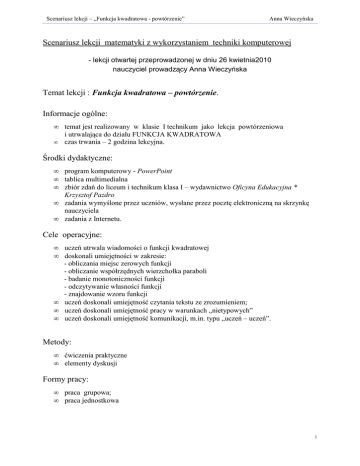 Scenariusz lekcji – „Funkcja kwadratowa - powtórzenie” Anna Wieczyńska Scenariusz lekcji matematyki z wykorzystaniem techniki komputerowej - lekcji otwartej przeprowadzonej w dniu 26 kwietnia2010 nauczyciel prowadzący Anna Wieczyńska Temat lekcji : Funkcja kwadratowa – powtórzenie. Informacje ogólne: • • temat jest realizowany w klasie I technikum jako lekcja powtórzeniowa i utrwalająca do działu FUNKCJA KWADRATOWA czas trwania – 2 godzina lekcyjna. Środki dydaktyczne: • • • • • program komputerowy - PowerPoint tablica multimedialna zbiór zdań do liceum i technikum klasa I – wydawnictwo Oficyna Edukacyjna * Krzysztof Pazdro zadania wymyślone przez uczniów, wysłane przez pocztę elektroniczną na skrzynkę nauczyciela zadania z Internetu. Cele operacyjne: • • uczeń utrwala wiadomości o funkcji kwadratowej doskonali umiejętności w zakresie: - obliczania miejsc zerowych funkcji - obliczanie współrzędnych wierzchołka paraboli - badanie monotoniczności funkcji - odczytywanie własności funkcji - znajdowanie wzoru funkcji • uczeń doskonali umiejętność czytania tekstu ze zrozumieniem; • uczeń doskonali umiejętność pracy w warunkach „nietypowych” • uczeń doskonali umiejętność komunikacji, m.in. typu „uczeń – uczeń”. Metody: • • ćwiczenia praktyczne elementy dyskusji Formy pracy: • • praca grupowa; praca jednostkowa 1 Scenariusz lekcji – „Funkcja kwadratowa - powtórzenie” Anna Wieczyńska Przebieg lekcji: 1. 2. 3. 4. 5. Nauczyciel podaje temat lekcji „Funkcja kwadratowa – powtórzenie” Nauczyciel podaje w jakiej formie będzie przeprowadzona lekcja. Nauczyciel prosi pięciu uczniów do udziału w eliminacjach gry Milionerzy. Zwycięzca bierze udział w dalszej grze Milionerzy. Uczniowie notują zadania i rozwiązania w zeszytach Materiały: • • instrukcja gry milionerów i zasada oceniania – załącznik nr 1 pliki do przeprowadzenia gry – program PowerPoint – załącznik nr 2 2 Scenariusz lekcji – „Funkcja kwadratowa - powtórzenie” Anna Wieczyńska Załącznik nr 1. instrukcja gry milionerów: • W eliminacjach startuje pięciu uczniów. • Uczeń, który zna odpowiedź na pytanie z eliminacji wstaje. • Uczniowie mają 1 minutę na rozwiązanie zdania. • Uczniowie podają odpowiedzi na pytanie w kolejności w jakiej wstali. • Wygrywa ten, kto pierwszy poda prawidłową odpowiedź. • Zwycięzca bierze udział w głównej grze. • Gracz moŜe korzystać z kół ratunkowych: 50 -50, telefon do przyjaciela oraz pomoc publiczności. Zasady oceniania: • JeŜeli uczeń sam odpowie (bez pomocy kół ratunkowych) na wszystkie pytania, to otrzymuje ocenę celującą. • JeŜeli uczeń odpowie na wszystkie pytania z wykorzystaniem jednego koła ratunkowego, to otrzymuje ocenę bardzo dobrą. • JeŜeli uczeń odpowie na wszystkie pytania z wykorzystaniem dwóch lub trzech kół ratunkowych, to otrzymuje dobrą. • JeŜeli uczeń sam odpowie (bez pomocy kół ratunkowych) na pięć pytań, to otrzymuje ocenę bardzo dobrą. • JeŜeli uczeń sam odpowie (bez pomocy kół ratunkowych) na cztery pytania, to otrzymuje ocenę dobrą. Załącznik nr 2. Zadania: • Milionerzy nr 1 – plik do pobrania na stronie www.zsae.gdynia.pl • Milionerzy nr 2 – plik do pobrania na stronie www.zsae.gdynia.pl • Milionerzy nr 3 – plik do pobrania na stronie www.zsae.gdynia.pl 3