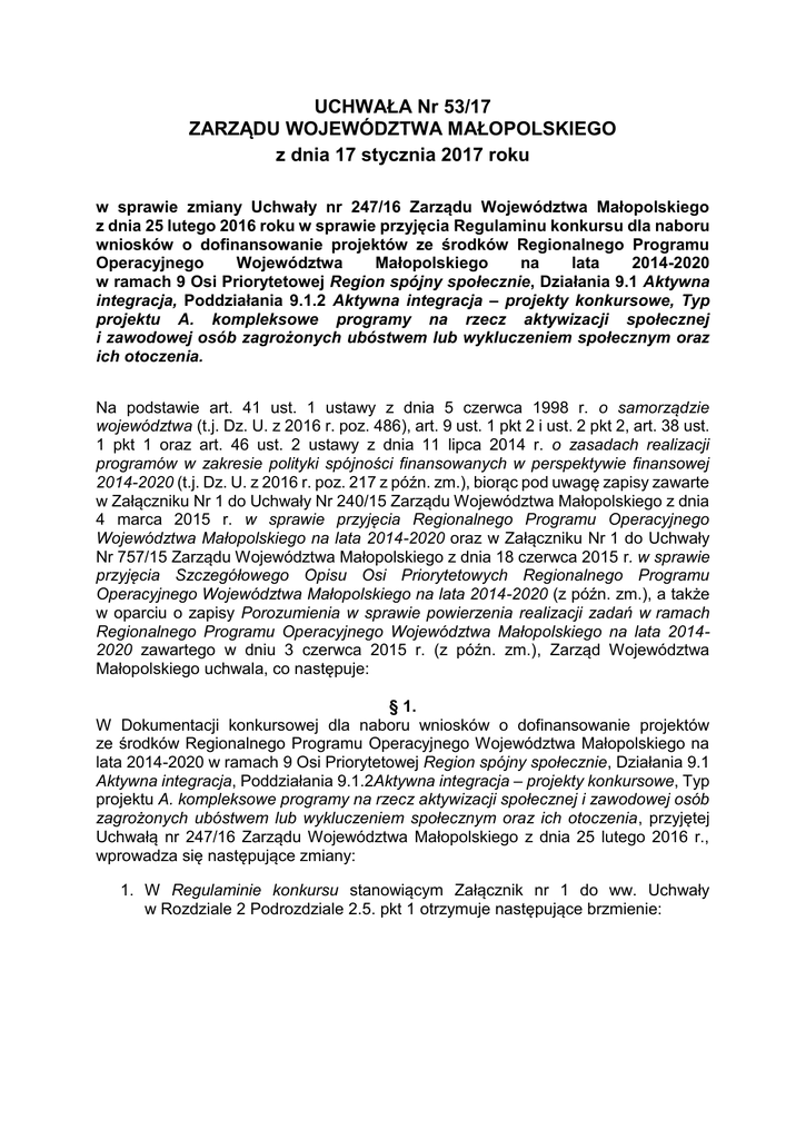 UCHWAŁA Nr 53/17 ZARZĄDU WOJEWÓDZTWA MAŁOPOLSKIEGO z dnia 17 stycznia 2017 roku w sprawie zmiany Uchwały nr 247/16 Zarządu Województwa Małopolskiego z dnia 25 lutego 2016 roku w sprawie przyjęcia Regulaminu konkursu dla naboru wniosków o dofinansowanie projektów ze środków Regionalnego Programu Operacyjnego Województwa Małopolskiego na lata 2014-2020 w ramach 9 Osi Priorytetowej Region spójny społecznie, Działania 9.1 Aktywna integracja, Poddziałania 9.1.2 Aktywna integracja – projekty konkursowe, Typ projektu A. kompleksowe programy na rzecz aktywizacji społecznej i zawodowej osób zagrożonych ubóstwem lub wykluczeniem społecznym oraz ich otoczenia. Na podstawie art. 41 ust. 1 ustawy z dnia 5 czerwca 1998 r. o samorządzie województwa (t.j. Dz. U. z 2016 r. poz. 486), art. 9 ust. 1 pkt 2 i ust. 2 pkt 2, art. 38 ust. 1 pkt 1 oraz art. 46 ust. 2 ustawy z dnia 11 lipca 2014 r. o zasadach realizacji programów w zakresie polityki spójności finansowanych w perspektywie finansowej 2014-2020 (t.j. Dz. U. z 2016 r. poz. 217 z późn. zm.), biorąc pod uwagę zapisy zawarte w Załączniku Nr 1 do Uchwały Nr 240/15 Zarządu Województwa Małopolskiego z dnia 4 marca 2015 r. w sprawie przyjęcia Regionalnego Programu Operacyjnego Województwa Małopolskiego na lata 2014-2020 oraz w Załączniku Nr 1 do Uchwały Nr 757/15 Zarządu Województwa Małopolskiego z dnia 18 czerwca 2015 r. w sprawie przyjęcia Szczegółowego Opisu Osi Priorytetowych Regionalnego Programu Operacyjnego Województwa Małopolskiego na lata 2014-2020 (z późn. zm.), a także w oparciu o zapisy Porozumienia w sprawie powierzenia realizacji zadań w ramach Regionalnego Programu Operacyjnego Województwa Małopolskiego na lata 20142020 zawartego w dniu 3 czerwca 2015 r. (z późn. zm.), Zarząd Województwa Małopolskiego uchwala, co następuje: § 1. W Dokumentacji konkursowej dla naboru wniosków o dofinansowanie projektów ze środków Regionalnego Programu Operacyjnego Województwa Małopolskiego na lata 2014-2020 w ramach 9 Osi Priorytetowej Region spójny społecznie, Działania 9.1 Aktywna integracja, Poddziałania 9.1.2Aktywna integracja – projekty konkursowe, Typ projektu A. kompleksowe programy na rzecz aktywizacji społecznej i zawodowej osób zagrożonych ubóstwem lub wykluczeniem społecznym oraz ich otoczenia, przyjętej Uchwałą nr 247/16 Zarządu Województwa Małopolskiego z dnia 25 lutego 2016 r., wprowadza się następujące zmiany: 1. W Regulaminie konkursu stanowiącym Załącznik nr 1 do ww. Uchwały w Rozdziale 2 Podrozdziale 2.5. pkt 1 otrzymuje następujące brzmienie: „Kwota przeznaczona na dofinansowanie projektów w konkursie wynosi 71 178 299,571 (słownie: siedemdziesiąt jeden milionów sto siedemdziesiąt osiem tysięcy dwieście dziewięćdziesiąt dziewięć złotych i 57/100), w tym: wsparcie EFS – 63 685 846,70 zł (słownie: sześćdziesiąt trzy miliony sześćset osiemdziesiąt pięć tysięcy osiemset czterdzieści sześć złotych i 70/100); wsparcie krajowe – 7 492 452,87 zł (słownie: siedem milionów czterysta dziewięćdziesiąt dwa tysiące czterysta pięćdziesiąt dwa złote i 87/100). Wykonanie Uchwały Przedsiębiorczości. powierza § 2. się Dyrektorowi Małopolskiego Centrum § 3. Uchwała wchodzi w życie z dniem podjęcia. Kwota przeznaczona na dofinansowanie projektów w ramach niniejszego konkursu została określona w załączniku nr 1 do Uchwały Nr 1886/16 ZWM z dnia 15 grudnia 2016 r. w sprawie zmiany Uchwały Nr 580/15 z dnia 14 maja 2015 r. ZWM w sprawie przyjęcia Ramowego Planu Realizacji Działań dla osi 1-13 na lata 2015-2020 w ramach Regionalnego Programu Operacyjnego na lata 2014-2020 z późn. zm. (w skrócie RPRD) * kurs księgowy publikowany na stronie: http://www.ecb.int/stats/exchange/eurofxref/html/eurofxref-graph-pln.en.html z przedostatniego dnia kwotowania środków w Europejskim Banku Centralnym (EBC) w miesiącu poprzedzającym miesiąc, dla którego dokonuje się wyliczenia limitu alokacji środków wspólnotowych. 1 UZASADNIENIE Na podstawie art. 9 ust. 1 pkt. 2 ustawy z dnia 11 lipca 2014 r. o zasadach realizacji programów w zakresie polityki spójności finansowanych w perspektywie finansowej 2014-2020 (t.j. Dz. U. z 2016 r., poz. 217 z późn. zm.) Instytucją Zarządzającą Regionalnego Programu Operacyjnego Województwa Małopolskiego na lata 2014-2020 jest Zarząd Województwa Małopolskiego. W zakresie Poddziałania 10.1.1 IZ na mocy Porozumienia w sprawie powierzenia realizacji zadań w ramach Regionalnego Programu Operacyjnego Województwa Małopolskiego na lata 2014-2020 zawartego w dniu 3 czerwca 2015 r.(z późn. zm.) oraz Porozumienia w sprawie powierzenia realizacji zadań w ramach Regionalnego Programu Operacyjnego Województwa Małopolskiego na lata 2014-2020 zawartego w dniu 10 lipca 2015 r.(z późn. zm.) powierzyła Małopolskiemu Centrum Przedsiębiorczości. Zwiększenie kwoty określonej w Regulaminie konkursu, przeznaczonej na dofinansowanie projektów w konkursie z kwoty 67 193 947,23 zł na kwotę 71 178 299,57 zł pozwoli na dofinansowanie dwóch projektów ocenionych pozytywnie w wyniku procedury odwoławczej. Łączna kwota przeznaczona na konkurs nie przekracza kwoty wskazanej w Ramowym Planie Realizacji Działań dla osi 1-13 na lata 2015-2020 w ramach Regionalnego Programu Operacyjnego Województwa Małopolskiego.