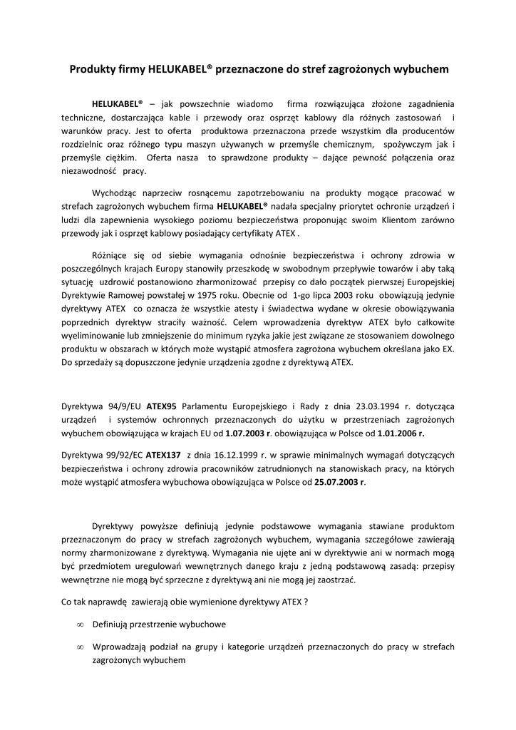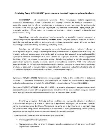 Produkty firmy HELUKABEL® przeznaczone do stref zagrożonych wybuchem HELUKABEL® – jak powszechnie wiadomo firma rozwiązująca złożone zagadnienia techniczne, dostarczająca kable i przewody oraz osprzęt kablowy dla różnych zastosowań i warunków pracy. Jest to oferta produktowa przeznaczona przede wszystkim dla producentów rozdzielnic oraz różnego typu maszyn używanych w przemyśle chemicznym, spożywczym jak i przemyśle ciężkim. Oferta nasza to sprawdzone produkty – dające pewność połączenia oraz niezawodność pracy. Wychodząc naprzeciw rosnącemu zapotrzebowaniu na produkty mogące pracować w strefach zagrożonych wybuchem firma HELUKABEL® nadała specjalny priorytet ochronie urządzeń i ludzi dla zapewnienia wysokiego poziomu bezpieczeństwa proponując swoim Klientom zarówno przewody jak i osprzęt kablowy posiadający certyfikaty ATEX . Różniące się od siebie wymagania odnośnie bezpieczeństwa i ochrony zdrowia w poszczególnych krajach Europy stanowiły przeszkodę w swobodnym przepływie towarów i aby taką sytuację uzdrowić postanowiono zharmonizować przepisy co dało początek pierwszej Europejskiej Dyrektywie Ramowej powstałej w 1975 roku. Obecnie od 1-go lipca 2003 roku obowiązują jedynie dyrektywy ATEX co oznacza że wszystkie atesty i świadectwa wydane w okresie obowiązywania poprzednich dyrektyw straciły ważność. Celem wprowadzenia dyrektyw ATEX było całkowite wyeliminowanie lub zmniejszenie do minimum ryzyka jakie jest związane ze stosowaniem dowolnego produktu w obszarach w których może wystąpić atmosfera zagrożona wybuchem określana jako EX. Do sprzedaży są dopuszczone jedynie urządzenia zgodne z dyrektywą ATEX. Dyrektywa 94/9/EU ATEX95 Parlamentu Europejskiego i Rady z dnia 23.03.1994 r. dotycząca urządzeń i systemów ochronnych przeznaczonych do użytku w przestrzeniach zagrożonych wybuchem obowiązująca w krajach EU od 1.07.2003 r. obowiązująca w Polsce od 1.01.2006 r. Dyrektywa 99/92/EC ATEX137 z dnia 16.12.1999 r. w sprawie minimalnych wymagań dotyczących bezpieczeństwa i ochrony zdrowia pracowników zatrudnionych na stanowiskach pracy, na których może wystąpić atmosfera wybuchowa obowiązująca w Polsce od 25.07.2003 r. Dyrektywy powyższe definiują jedynie podstawowe wymagania stawiane produktom przeznaczonym do pracy w strefach zagrożonych wybuchem, wymagania szczegółowe zawierają normy zharmonizowane z dyrektywą. Wymagania nie ujęte ani w dyrektywie ani w normach mogą być przedmiotem uregulowań wewnętrznych danego kraju z jedną podstawową zasadą: przepisy wewnętrzne nie mogą być sprzeczne z dyrektywą ani nie mogą jej zaostrzać. Co tak naprawdę zawierają obie wymienione dyrektywy ATEX ? • Definiują przestrzenie wybuchowe • Wprowadzają podział na grupy i kategorie urządzeń przeznaczonych do pracy w strefach zagrożonych wybuchem • Określają wymogi bezpieczeństwa dotyczące projektowania i budowy urządzeń oraz systemów ochronnych • Obejmują dodatkowo urządzenia nieelektryczne (np. pneumatyczne itd.) • Wprowadzają wymóg formalnej oceny ryzyka eksploatacji • Opisują procedurę badania urządzeń oraz zawartość deklaracji zgodności • Określają minimalne kryteria uwzględniane przy notyfikowaniu jednostek • Określają sposób oznakowania urządzeń i systemów ochronnych • Podają wzór oznakowania CE • Wprowadzają wymóg dołączania instrukcji montażu i eksploatacji do dostarczanych urządzeń Co to jest zatem strefa zagrożenia wybuchem ? Z definicji “Strefa zagrożenia wybuchem jest to obszar, charakteryzujący się obecnością gazów, oparów, mgieł czy pyłów, które mieszając się z powietrzem powodują, że atmosfera staje się potencjalnie wybuchowa”. Do eksplozji może dojść tylko w atmosferze wybuchowej, która powstaje tam gdzie mieszanina gazów palnych, par lub pyłów jest produkowana, użytkowana lub przechowywana w obecności powietrza. Substancje, które mogą z powietrzem tworzyć mieszaniny wybuchowe to • Ciecze łatwo zapalne oraz ich pary (benzyny, rozpuszczalniki) • Gazy palne (propan-butan, acetylen, wodór) • Pyły i włókna (pył węglowy, drzewny, aluminiowy, cynowy) Eksplozja może być wywołana nie tylko przez instalacje elektryczne, ale również przez komponenty nieelektryczne takie jak gorąca powierzchnia, iskry wywołane przez uderzenia, tarcie materiałów itd. Wybuch może mieć miejsce przy wystąpieniu jednocześnie dwóch warunków: • Atmosfery wybuchowej, mieszaniny gazów palnych, par lub pyłów, w której po zainicjowaniu zapłonu spalanie odbywa się w całej objętości mieszaniny • Wystąpienia efektywnego źródła zapłonu którym może być np. gorące powierzchnie, płomienie i gorące gazy, iskry wytwarzane mechanicznie, elektrycznie lub elektrostatycznie, sprężenia adiabatyczne i fale uderzeniowe, promieniowanie elektromagnetyczne oraz jonizujące, ultradźwięki, reakcje chemiczne, błyskawice, reakcje egzotermiczne łącznie z samozapaleniem się pyłów Przestrzenie, w których występuje zagrożenie wybuchem dzielone są na strefy zagrożenia wybuchem zagrożenie strefa atmosfera wybuchowa gazy, ciecze 0 ciągła, długotrwała, częsta 1 okazjonalna (strefa G) 2 okazjonalna, krótkotrwała palne pyły 20 ciągła, długotrwała, częsta (strefa D) 21 okazjonalna 22 okazjonalna, krótkotrwała i ich pary Grupy urządzeń w wykonaniu przeciwwybuchowym, dyrektywa ATEX dzieli urządzenia na dwie podstawowe grupy. grupa opis podgrupa opis I urządzenia przeznaczone do pracy pod ziemią w kopalniach także zagrożonych wybuchem metanu _ _ A grupa propanowa (aceton, alkohol) B grupa etylenowa (etylen, siarkowodór) C grupa wodorowa (acetylen, wodór) II urządzenia przeznaczone do stosowania na powierzchni w obszarach zagrożonych wybuchem W ramach każdej grupy urządzenie dzielimy dalej na poszczególne kategorie. W grupie I wyróżnia się następujące