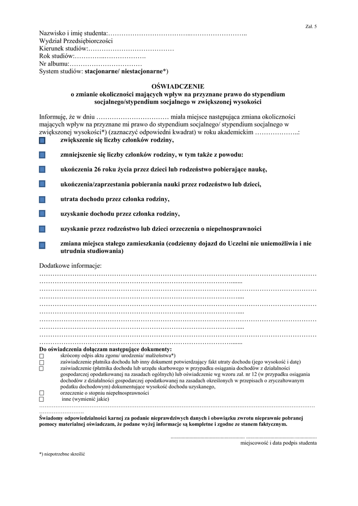 Zał. 5 Nazwisko i imię studenta:………………………………..…………………….. Wydział Przedsiębiorczości Kierunek studiów:………………………………… Rok studiów:…………..………………. Nr albumu:…………………………… System studiów: stacjonarne/ niestacjonarne*) OŚWIADCZENIE o zmianie okoliczności mających wpływ na przyznane prawo do stypendium socjalnego/stypendium socjalnego w zwiększonej wysokości Informuję, że w dniu …………………………… miała miejsce następująca zmiana okoliczności mających wpływ na przyznane mi prawo do stypendium socjalnego/ stypendium socjalnego w zwiększonej wysokości*) (zaznaczyć odpowiedni kwadrat) w roku akademickim ………………..: zwiększenie się liczby członków rodziny, zmniejszenie się liczby członków rodziny, w tym także z powodu: ukończenia 26 roku życia przez dzieci lub rodzeństwo pobierające naukę, ukończenia/zaprzestania pobierania nauki przez rodzeństwo lub dzieci, utrata dochodu przez członka rodziny, uzyskanie dochodu przez członka rodziny, uzyskanie przez rodzeństwo lub dzieci orzeczenia o niepełnosprawności zmiana miejsca stałego zamieszkania (codzienny dojazd do Uczelni nie uniemożliwia i nie utrudnia studiowania) Dodatkowe informacje: ……………………………………………………………………………………………………………… ……………………………………………………………………………....... ……………………………………………………………………………………………………………… ……………………………………………………………………………….... ……………………………………………………………………………………………………………… ……………………………………………………………………………….... ……………………………………………………………………………………………………………… ……………………………………………………………………………….... ……………………………………………………………………………………………………………… ……………………………………………………………………………....... Do oświadczenia dołączam następujące dokumenty: skrócony odpis aktu zgonu/ urodzenia/ małżeństwa*) zaświadczenie płatnika dochodu lub inny dokument potwierdzający fakt utraty dochodu (jego wysokość i datę) zaświadczenie (płatnika dochodu lub urzędu skarbowego w przypadku osiągania dochodów z działalności gospodarczej opodatkowanej na zasadach ogólnych) lub oświadczenie wg wzoru zał. nr 12 (w przypadku osiągania dochodów z działalności gospodarczej opodatkowanej na zasadach określonych w przepisach o zryczałtowanym podatku dochodowym) dokumentujące wysokość dochodu uzyskanego, orzeczenie o stopniu niepełnosprawności inne (wymienić jakie) ……………………………………………………………………………………………………………………………………… ……………………. Świadomy odpowiedzialności karnej za podanie nieprawdziwych danych i obowiązku zwrotu nieprawnie pobranej pomocy materialnej oświadczam, że podane wyżej informacje są kompletne i zgodne ze stanem faktycznym. ....................................................... .................................................... miejscowość i data podpis studenta *) niepotrzebne skreślić Pouczenie: Za utratę dochodu uznaje się utratę spowodowaną jedną z następujących okoliczności: -uzyskanie prawa do urlopu wychowawczego -utrata prawa do zasiłku lub stypendium dla bezrobotnych, -utrata zatrudnienia lub innej pracy zarobkowej, z wyłączeniem pracy wykonywanej na podstawie umowy o dzieło, -utrata zasiłku przedemerytalnego lub świadczenia przedemerytalnego, nauczycielskiego świadczenia kompensacyjnego, a także emerytury lub renty, renty rodzinnej lub renty socjalnej, z wyjątkiem rent przyznanych rolnikom w związku z przekazaniem lub dzierżawą gospodarstwa rolnego, -wyrejestrowanie pozarolniczej działalności gospodarczej lub zawieszeniem jej wykonywania w rozumieniu art. 14a ust. 1d ustawy z dnia 2 lipca 2004 r. o swobodzie działalności gospodarczej. -utrata zasiłku chorobowego, świadczenia rehabilitacyjnego lub zasiłku macierzyńskiego, przysługujących po utracie zatrudnienia lub innej pracy zarobkowej, -utrata zasądzonych świadczeń alimentacyjnych w związku ze śmiercią osoby zobowiązanej do tych świadczeń. Za uzyskanie dochodu uważa się uzyskanie dochodu wyłącznie w wyniku zaistnienia następujących okoliczności: -zakończenie urlopu wychowawczego, -uzyskanie prawa do zasiłku lub stypendium dla bezrobotnych, -uzyskanie zatrudnienia lub innej pracy zarobkowej, z wyłączeniem pracy wykonywanej na podstawie umowy o dzieło, -uzyskanie zasiłku przedemerytalnego lub świadczenia przedemerytalnego, nauczycielskiego świadczenia kompensacyjnego, a także emerytury lub renty, renty rodzinnej lub renty socjalnej, z wyjątkiem rent przyznanych rolnikom w związku z przekazaniem lub dzierżawą gospodarstwa rolnego, -rozpoczęcie pozarolniczej działalności gospodarczej lub wznowieniem jej wykonywania, -uzyskanie zasiłku chorobowego, świadczenia rehabilitacyjnego lub zasiłku macierzyńskiego, przysługujących po utracie zatrudnienia lub innej pracy zarobkowej.