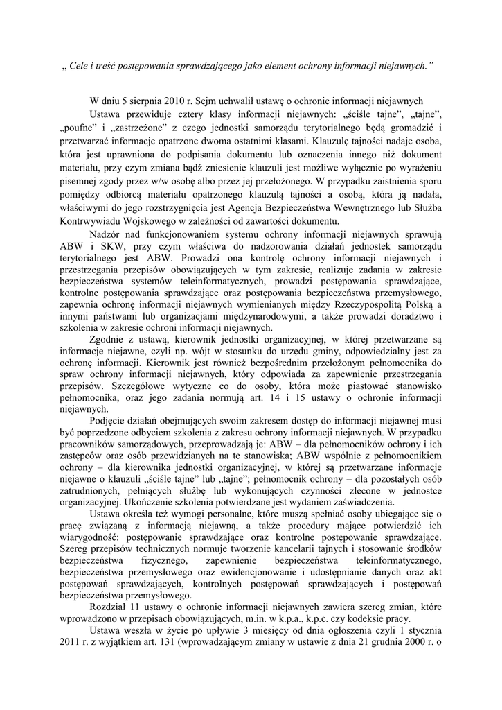 „ Cele i treść postępowania sprawdzającego jako element ochrony informacji niejawnych.” W dniu 5 sierpnia 2010 r. Sejm uchwalił ustawę o ochronie informacji niejawnych Ustawa przewiduje cztery klasy informacji niejawnych: „ściśle tajne”, „tajne”, „poufne” i „zastrzeżone” z czego jednostki samorządu terytorialnego będą gromadzić i przetwarzać informacje opatrzone dwoma ostatnimi klasami. Klauzulę tajności nadaje osoba, która jest uprawniona do podpisania dokumentu lub oznaczenia innego niż dokument materiału, przy czym zmiana bądź zniesienie klauzuli jest możliwe wyłącznie po wyrażeniu pisemnej zgody przez w/w osobę albo przez jej przełożonego. W przypadku zaistnienia sporu pomiędzy odbiorcą materiału opatrzonego klauzulą tajności a osobą, która ją nadała, właściwymi do jego rozstrzygnięcia jest Agencja Bezpieczeństwa Wewnętrznego lub Służba Kontrwywiadu Wojskowego w zależności od zawartości dokumentu. Nadzór nad funkcjonowaniem systemu ochrony informacji niejawnych sprawują ABW i SKW, przy czym właściwa do nadzorowania działań jednostek samorządu terytorialnego jest ABW. Prowadzi ona kontrolę ochrony informacji niejawnych i przestrzegania przepisów obowiązujących w tym zakresie, realizuje zadania w zakresie bezpieczeństwa systemów teleinformatycznych, prowadzi postępowania sprawdzające, kontrolne postępowania sprawdzające oraz postępowania bezpieczeństwa przemysłowego, zapewnia ochronę informacji niejawnych wymienianych między Rzeczypospolitą Polską a innymi państwami lub organizacjami międzynarodowymi, a także prowadzi doradztwo i szkolenia w zakresie ochroni informacji niejawnych. Zgodnie z ustawą, kierownik jednostki organizacyjnej, w której przetwarzane są informacje niejawne, czyli np. wójt w stosunku do urzędu gminy, odpowiedzialny jest za ochronę informacji. Kierownik jest również bezpośrednim przełożonym pełnomocnika do spraw ochrony informacji niejawnych, który odpowiada za zapewnienie przestrzegania przepisów. Szczegółowe wytyczne co do osoby, która może piastować stanowisko pełnomocnika, oraz jego zadania normują art. 14 i 15 ustawy o ochronie informacji niejawnych. Podjęcie działań obejmujących swoim zakresem dostęp do informacji niejawnej musi być poprzedzone odbyciem szkolenia z zakresu ochrony informacji niejawnych. W przypadku pracowników samorządowych, przeprowadzają je: ABW – dla pełnomocników ochrony i ich zastępców oraz osób przewidzianych na te stanowiska; ABW wspólnie z pełnomocnikiem ochrony – dla kierownika jednostki organizacyjnej, w której są przetwarzane informacje niejawne o klauzuli „ściśle tajne” lub „tajne”; pełnomocnik ochrony – dla pozostałych osób zatrudnionych, pełniących służbę lub wykonujących czynności zlecone w jednostce organizacyjnej. Ukończenie szkolenia potwierdzane jest wydaniem zaświadczenia. Ustawa określa też wymogi personalne, które muszą spełniać osoby ubiegające się o pracę związaną z informacją niejawną, a także procedury mające potwierdzić ich wiarygodność: postępowanie sprawdzające oraz kontrolne postępowanie sprawdzające. Szereg przepisów technicznych normuje tworzenie kancelarii tajnych i stosowanie środków bezpieczeństwa fizycznego, zapewnienie bezpieczeństwa teleinformatycznego, bezpieczeństwa przemysłowego oraz ewidencjonowanie i udostępnianie danych oraz akt postępowań sprawdzających, kontrolnych postępowań sprawdzających i postępowań bezpieczeństwa przemysłowego. Rozdział 11 ustawy o ochronie informacji niejawnych zawiera szereg zmian, które wprowadzono w przepisach obowiązujących, m.in. w k.p.a., k.p.c. czy kodeksie pracy. Ustawa weszła w życie po upływie 3 miesięcy od dnia ogłoszenia czyli 1 stycznia 2011 r. z wyjątkiem art. 131 (wprowadzającym zmiany w ustawie z dnia 21 grudnia 2000 r. o żegludze śródlądowej Dz. U. z 2006 r., Nr 123, poz. 857 ze zm.), który wchodzi w życie 1 stycznia 2013 r. Podstawą do wszczęcia przez pełnomocnika ochrony postępowania sprawdzającego wobec osoby ubiegającej się o stanowisko lub zlecenie prac związanych z dostępem do informacji niejawnych stanowiących tajemnicę służbową jest pisemne polecenie kierownika jednostki organizacyjnej, natomiast w wypadku postępowania sprawdzającego poszerzonego lub specjalnego, które prowadzą służby ochrony państwa, podstawą do jego wszczęcia jest wniosek kierownika jednostki organizacyjnej o wszczęcie postępowania sprawdzającego Wystawienie poświadczenia bezpieczeństwa osobie, która zamierza podjąć pracę na określonym stanowisku związanym z dostępem do informacji niejawnych lub zleceniem prac, jest poprzedzone czynnościami polegającymi na przeprowadzeniu procedury sprawdzenia. Postępowania sprawdzające mogą przeprowadzać tylko podmioty wymienione w ustawie, tzn.: Wojskowe Służby Informacyjne, Agencja Bezpieczeństwa Wewnętrznego oraz pełnomocnik do spraw ochrony informacji niejawnych. Postępowanie sprawdzające ma na celu ustalenie, czy osoba sprawdzana daje rękojmię zachowania tajemnicy. Pełnomocnik ochrony prowadzi wykaz stanowisk i prac zleconych oraz osób dopuszczonych do pracy na stanowiskach, z którymi wiąże się dostęp do informacji niejawnych. W zależności od stanowiska lub zleconej pracy, o które ubiega się dana osoba, przeprowadza się postępowanie: zwykłe - przy stanowiskach i pracach związanych z dostępem do informacji niejawnych stanowiących tajemnicę służbową sprawdzające oznaczonych klauzulą: "zastrzeżone" oraz "poufne"; poszerzone - przy stanowiskach i pracach związanych z dostępem do informacji niejawnych oznaczonych klauzulą "tajne", Przeprowadzenie postępowania sprawdzającego wymaga pisemnej zgody osoby sprawdzanej. Podanie osoby sprawdzanej ubiegającej się o zatrudnienie na stanowisku objętym z mocy przepisów ustawy wymogiem przeprowadzenia postępowania