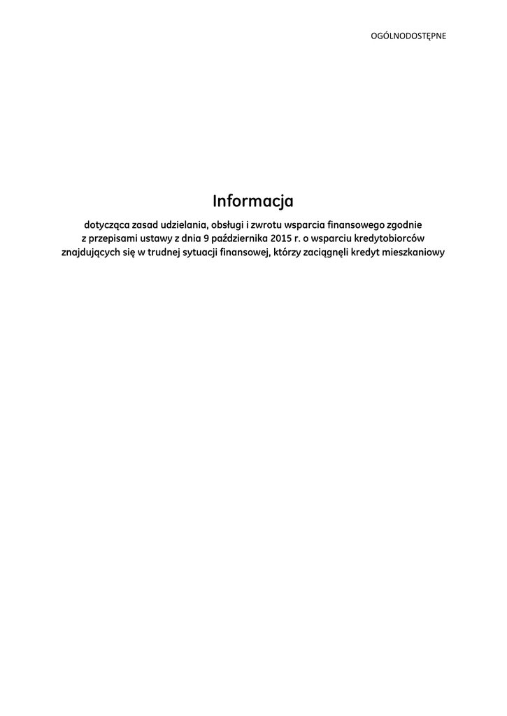 OGÓLNODOSTĘPNE Informacja dotycząca zasad udzielania, obsługi i zwrotu wsparcia finansowego zgodnie z przepisami ustawy z dnia 9 października 2015 r. o wsparciu kredytobiorców znajdujących się w trudnej sytuacji finansowej, którzy zaciągnęli kredyt mieszkaniowy OGÓLNODOSTĘPNE Rozdział I Przepisy ogólne §1 Zakres przedmiotowy Przedmiotem niniejszego dokumentu jest opisanie zasad przyznawania, obsługi i zwrotu Wsparcia udzielonego na podstawie przepisów Ustawy. §2 Zakres podmiotowy Informacja ta przeznaczona jest dla klientów Banku BPH S.A. spłacających Kredyty mieszkaniowe w celu przybliżenia zasad udzielenia wsparcia finansowego na podstawie Ustawy, z zastrzeżeniem, iż wiążącymi Bank i Wnioskodawcę będą postanowienia Umowy o udzielenie Wsparcia zawartej przez Bank oraz Wnioskodawcę. §3 Definicje Ilekroć w niniejszym dokumencie użyte zostały niżej wymienione pojęcia lub skróty, należy przez nie rozumieć: 1) Bank – Bank BPH Spółka Akcyjna, ul. Płk. Jana Pałubickiego 2, 80-175 Gdańsk, wpisana do rejestru prowadzonego przez Sąd Rejonowy Gdańsk-Północ w Gdańsku, VII Wydział Gospodarczy Krajowego Rejestru Sądowego w Gdańsku, pod numerem KRS 0000010260. NIP: 675-000-03-84, 2) BGK – Bank Gospodarstwa Krajowego, działający na podstawie ustawy z dnia 14 marca 2003 r. o Banku Gospodarstwa Krajowego (Dz. U. z 2014 r. poz. 510) oraz Statutu Banku Gospodarstwa Krajowego nadanego rozporządzeniem Ministra Skarbu Państwa z dnia 11 maja 2010 r. (Dz. U. Nr 81, poz. 535). NIP 525-00-12-372, 3) Dochód – dochód w rozumieniu ustawy z dnia 12 marca 2004 r. o pomocy społecznej (Dz. U. z 2015 r. poz. 163 z późn. zm.), 4) FWK – Fundusz Wsparcia Kredytobiorców, o którym mowa w art. 14 Ustawy. 5) Gospodarstwo domowe – gospodarstwo prowadzone przez Kredytobiorcę ubiegającego się o Wsparcie, samodzielnie zajmującego lokal mieszkalny lub dom jednorodzinny, albo gospodarstwo prowadzone przez Kredytobiorcę wspólnie z innymi osobami stale z nim zamieszkującymi i gospodarującymi, które swoje prawa do zamieszkiwania w lokalu mieszkalnym lub domu jednorodzinnym wywodzą z prawa Kredytobiorcy, 6) Dochód Gospodarstwa domowego – suma miesięcznych dochodów osób zamieszkujących i gospodarujących w lokalu mieszkalnym lub domu jednorodzinnym należącym do Kredytobiorcy, z miesiąca poprzedzającego miesiąc złożenia Wniosku 7) Kredyt mieszkaniowy – kredyt udzielony przez Bank, którego celem było zaspokojenie potrzeb mieszkaniowych Kredytobiorcy (kwota przeznaczona na cel mieszkaniowy ma największy udział w łącznej kwocie kredytu), dla którego ustanowiono zabezpieczenie w postaci hipoteki na nieruchomości, w szczególności kredyt przeznaczony na: a) nabycie, budowę, przebudowę, rozbudowę lub nadbudowę domu albo lokalu mieszkalnego stanowiącego odrębną nieruchomość oraz adaptację pomieszczeń (budynków) niemieszkalnych na cele mieszkalne, OGÓLNODOSTĘPNE b) nabycie spółdzielczego prawa do lokalu mieszkalnego lub prawa odrębnej własności lokalu mieszkalnego w spółdzielni mieszkaniowej, c) remont domu albo lokalu, o których mowa powyżej, d) nabycie działki budowlanej lub jej części pod budowę domu jednorodzinnego lub budynku mieszkalnego, w którym jest lub ma być położony lokal mieszkalny, e) inne cele związane z zaspokajaniem potrzeb mieszkaniowych, w szczególności na pokrycie kosztów partycypacji w kosztach budowy mieszkań przez towarzystwa budownictwa społecznego, f) refinansowanie jednego lub więcej z wyżej wymienionych celów. g) W przypadku kredytów refinansowych, w ramach których refinansowane były także kredyty na cele inne niż mieszkaniowe, za Kredyt mieszkaniowy uznaje się tylko tą część kredytu, która przeznaczona była na refinansowanie celu mieszkaniowego. W związku z tym wysokość miesięcznego wsparcia nie może przekroczyć wartości tej części raty kredytu, która przypada na spłatę celu mieszkaniowego, nie więcej niż 1500 zł miesięcznie. 8) Kredytobiorca – osoba lub osoby pozostające w Gospodarstwie domowym, zobowiązane do spłaty Kredytu Mieszkaniowego zaciągniętego na zaspokojenie własnych potrzeb mieszkaniowych, 9) Rada Funduszu – Rada Funduszu Wsparcia Kredytobiorców, o której mowa w art. 15 Ustawy, 10) Informacja – niniejsza Informacja „Zasady udzielania, obsługi i zwrotu Wsparcia zgodnie z przepisami ustawy o wsparciu kredytobiorców znajdujących się w trudnej sytuacji finansowej, którzy zaciągnęli kredyt mieszkaniowy”, 11) Rata Kredytu mieszkaniowego – rata kapitałowo-odsetkowa, ustalona zgodnie z umową Kredytu mieszkaniowego oraz harmonogramem spłat Kredytu mieszkaniowego, 12) Wsparcie – zwrotne wsparcie finansowe, udzielone osobom fizycznym zobowiązanym do spłaty Kredytu mieszkaniowego, które znalazły się w trudnej sytuacji finansowej, zgodnie z art. 3 Ustawy, 13) Wniosek – druk wniosku o udzielenie wsparcia, wydany na podstawie Rozporządzenia. 14) Rozporządzenie – Rozporządzenie Ministra Finansów z dnia 10 lutego 2016 roku (Dz. U. z 2016 r. poz. 196). 15) Wnioskodawca – Kredytobiorca, który wystąpił do Banku z Wnioskiem o udzielenie Wsparcia, 16) Umowa o udzielenie Wsparcia – umowa pomiędzy Wnioskodawcą a Bankiem o udzielenie Wsparcia, 17) Rata Wsparcia – kwota przekazywana do Banku przez BGK, zgodnie z harmonogramem wypłaty Wsparcia, na spłatę zobowiązań Kredytobiorcy wynikających z umowy Kredytu mieszkaniowego, 18) Ustawa - ustawa z dnia 9 października 2015 r. o wsparciu kredytobiorców znajdujących się w trudnej sytuacji finansowej, którzy zaciągnęli kredyt mieszkaniowy (Dz. U. z 2015 poz. 1925). Rozdział II Zasady wnioskowania i udzielania Wsparcia §4 Wniosek o udzielenie Wsparcia 1. Kredytobiorca ubiegający się o przyznanie Wsparcia składa w Banku Wniosek wraz z kompletem wymaganych dokumentów poświadczających spełnienie przesłanki lub przesłanek do udzielenia Wsparc