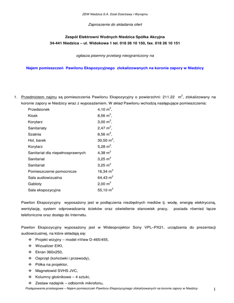 ZEW Niedzica S.A. Dział Dzierżawy i Wynajmu Zaproszenie do składania ofert Zespół Elektrowni Wodnych Niedzica Spółka Akcyjna 34-441 Niedzica – ul. Widokowa 1 tel. 018 26 10 150, fax. 018 26 10 151 ogłasza pisemny przetarg nieograniczony na Najem pomieszczeń Pawilonu Ekspozycyjnego zlokalizowanych na koronie zapory w Niedzicy 2 1. Przedmiotem najmu są pomieszczenia Pawilonu Ekspozycyjny o powierzchni: 211.22 m , zlokalizowany na koronie zapory w Niedzicy wraz z wyposażeniem. W skład Pawilonu wchodzą następujące pomieszczenia: 2 Przedsionek 4,10 m , Kiosk 8,56 m , Korytarz 3,00 m , Sanitariaty 2,47 m , Szatnia 8,56 m , Hol, barek 30,50 m , Korytarz 5,28 m . Sanitariat dla niepełnosprawnych 4,38 m 2 Sanitariat 3,25 m 2 Sanitariat 3,25 m 2 Pomieszczenie pomocnicze 16,34 m 2 Sala audiowizualna 64,43 m 2 Gabloty 2,00 m Sala ekspozycyjna 55,10 m 2 2 2 2 2 2 2 2 Pawilon Ekspozycyjny wyposażony jest w podłączenia niezbędnych mediów tj. wodę, energię elektryczną, wentylację, system odprowadzania ścieków oraz oświetlenie stanowisk pracy, posiada również łącze telefoniczne oraz dostęp do Internetu. Pawilon Ekspozycyjny wyposażony jest w Wideoprojektor Sony VPL–PX21, urządzenia do prezentacji audiowizualnej, na które składają się: Projekt wizyjny – model nView D-465/455, Wizualizer EIKI, Ekran 360x250, Osprzęt (końcówki i przewody), Półka na projektor, Magnetowid SVHS JVC, Kolumny głośnikowe – 4 sztuki, Zestaw nadajnik – odbiornik mikrofonu, Postępowanie przetargowe – Najem pomieszczeń Pawilonu Ekspozycyjnego zlokalizowanych na koronie zapory w Niedzicy 1 ZEW Niedzica S.A. Dział Dzierżawy i Wynajmu Mikrofon dynamiczny, Mikrofon „lavalier”, Mikser ze wzmacniaczem mocy, Eliminator sprzężeń, Stojak aparatury RACK19 z okablowaniem Istnieje możliwość wizji lokalnej pomieszczeń Pawilonu Ekspozycyjnego oraz wglądu w projekt budynku. Dodatkowo Zamawiający przekazuje teren przylegający bezpośrednio do Pawilonu Wystawowego 2 o powierzchni 320 m . Załącznik nr 1 – lokalizacja Pawilonu Ekspozycyjnego wraz z terenem do niego przylegającym Załącznik nr 2 - szkic Pawilonu Ekspozycyjnego, Załącznik nr 3 – projekt pomieszczeń Pawilonu Ekspozycyjnego, 2. Do składania ofert uprawione są wszystkie osoby fizyczne, prawne i jednostki organizacyjne nie posiadające osobowości prawnej, mogące występować w obrocie gospodarczym, działające we własnym imieniu i na własny rachunek jak również solidarnie w ramach konsorcjum. 2.1. Przez konsorcjum rozumie się współdziałanie na podstawie umowy konsorcyjnej dwóch lub więcej samodzielnych podmiotów dla realizowania wspólnego celu gospodarczego, których odpowiedzialność za zaciągnięte zobowiązania ma charakter solidarny. Konsorcjum reprezentuje wytypowany członek konsorcjum bądź pełnomocnik, na podstawie pisemnego umocowania. W przypadku wybrania oferty konsorcjum ZEW Niedzica S.A. może żądać umowy konsorcyjnej do wglądu przed zawarciem umowy dzierżawy. 3. Jeden oferent może złożyć oferty tylko jedną ofertę na najem pomieszczeń Pawilonu Ekspozycyjnego 4. Zamawiający nie dopuszcza prowadzenia działalności w zakresie: 4.1. sprzedaży materiałów pirotechnicznych i ich pochodnych, 4.2. niezgodnej z prawem. 5. Zamawiający w związku z przeznaczeniem Pawilonu Ekspozycyjnego preferować będzie prowadzenie działalności gospodarczej z zakresu: 5.1. prezentacji programów audiowizualnych, 5.2. przeglądów filmów oraz DKF, 5.3. wystaw, odczytów, 5.4. programów edukacyjnych dla szkół oraz działań o charakterze oświatowym (seminaria, odczyty), 5.5. inną po za akceptowaniu przez Zamawiającego 6. Oferenci powinni spełniać następujące wymagania formalne: 6.1. przedstawią wszystkie dokumenty oraz informacje wymagane zgodnie z punktem 6; Postępowanie przetargowe – Najem pomieszczeń Pawilonu Ekspozycyjnego zlokalizowanych na koronie zapory w Niedzicy 2 ZEW Niedzica S.A. Dział Dzierżawy i Wynajmu 6.2. dokonają wpłaty wadium w wysokości 5.000,00 złotych (słownie: pięć tysiące pięćset złotych) przelewem na konto Wynajmującego w banku PKO S.A. o/ Nowy Targ nr konta: 26 1240 1574 1111 0000 0790 1812 lub gotówką w kasie ZEW Niedzica S.A. 6.2.1.wadium musi być wniesione przed upływem terminu składania ofert. 6.2.2. w przypadku wnoszenia wadium przelewem na rachunek bankowy o terminie jego wniesienia decydować będzie data uznania rachunku bankowego Zamawiającego, a w przypadku wpłaty gotówki – termin wpłaty gotówki do kasy Wynajmującego. 6.2.3.wpłata musi zawierać wyraźne zaznaczenie, że dotyczy przedmiotowego postępowania, 6.3. wpłata wadium przepada na rzecz ZEW Niedzica S.A. w razie: 6.3.1. uchylania się przez Oferenta, który został wybrany w postępowaniu przetargowym, od podpisania umowy zgodnej z „Wzorem umowy najmu” w terminie określonym przez ZEW Niedzica S.A., 6.3.2. przedstawienia w ofercie nieprawdziwych danych, 6.3.3. gdy zawarcie umowy stało się niemożliwe z winy Oferenta, Uprzejmie informujemy, że gotówkowej wpłaty wadium można dokonać w godzinach od 8.00 do 15.00 w kasie ZEW Niedzica S.A. znajdującej się w Hotelu Pieniny (adres: 34 – 441 Niedzica, ul. Kanada 38). 6.4. nie zalegają z uiszczeniem podatków, opłat lub innych zobowiązań, które są zobowiązani na mocy obowiązujących przepisów prawa i stosownych umów uiszczać, w tym również dla ZEW Niedzica S.A (Formularz ofertowy - załącznik nr 4); 6.5. posiadają wszelkie wymagane prawem dokumenty potrzebne do prowadzenia działalności (Formularz ofertowy - załącznik nr 4); 6.6. złożą oświadczenie, że Oferent uważa się za związanego z ofertą przez okres 35 dni (Formularz ofertowy - załącznik nr 4), 6.7. złożą oświadczenie, że akceptują „Wzór umowy najmu”, który stanowi załącznik nr 5 do niniejszej dokumentacji. 6.8. oferta oraz wszystkie dokumenty z nią związane muszą być sporządzone pod ry
