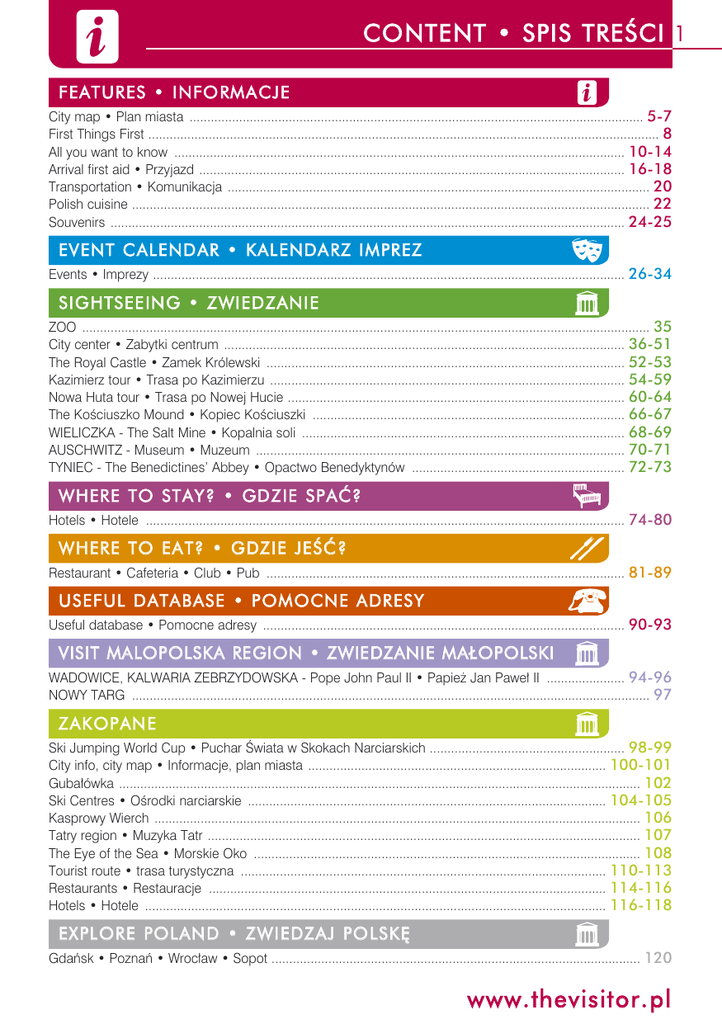 CONTE NT • SPI S TREÂCI 1 F EAT UR ES • I NFO RM A CJ E City map • Plan miasta ................................................................................................................................ 5-7 First Things First ................................................................................................................................................ 8 All you want to know ............................................................................................................................... 10-14 Arrival first aid • Przyjazd ........................................................................................................................ 16-18 Transportation • Komunikacja ....................................................................................................................... 20 Polish cuisine .................................................................................................................................................. 22 Souvenirs ................................................................................................................................................. 24-25 EV ENT C AL END AR • KAL ENDA R Z I MPR EZ Events • Imprezy ..................................................................................................................................... 26-34 S I G HTS EE IN G • Z WI ED Z ANI E ZOO ................................................................................................................................................................ 35 City center • Zabytki centrum ................................................................................................................. 36-51 The Royal Castle • Zamek Królewski ..................................................................................................... 52-53 Kazimierz tour • Trasa po Kazimierzu .................................................................................................... 54-59 Nowa Huta tour • Trasa po Nowej Hucie ............................................................................................... 60-64 The Kościuszko Mound • Kopiec Kościuszki ........................................................................................ 66-67 WIELICZKA - The Salt Mine • Kopalnia soli ........................................................................................... 68-69 AUSCHWITZ - Museum • Muzeum ........................................................................................................ 70-71 TYNIEC - The Benedictines’ Abbey • Opactwo Benedyktynów ............................................................ 72-73 W HER E TO S T AY? • GD Z IE S P Aå? Hotels • Hotele ....................................................................................................................................... 74-80 WHER E TO EA T? • GDZI E JEÂå ? Restaurant • Cafeteria • Club • Pub ..................................................................................................... 81-89 USEF UL D ATA BASE • P OMOCN E A DR ESY Useful database • Pomocne adresy ...................................................................................................... 90-93 V IS I T MA LO P O LS K A RE GI O N • Z W IE D Z A N I E M A Ł O P O LS K I WADOWICE, KALWARIA ZEBRZYDOWSKA - Pope John Paul II • Papież Jan Paweł II ...................... 94-96 NOWY TARG .................................................................................................................................................. 97 ZAKOPAN E Ski Jumping World Cup • Puchar Świata w Skokach Narciarskich ....................................................... 98-99 City info, city map • Informacje, plan miasta .................................................................................... 100-101 Gubałówka ................................................................................................................................................... 102 Ski Centres • Ośrodki narciarskie ..................................................................................................... 104-105 Kasprowy Wierch ......................................................................................................................................... 106 Tatry region • Muzyka Tatr .......................................................................................................................... 107 The Eye of the Sea • Morskie Oko ............................................................................................................. 108 Tourist route • trasa turystyczna ....................................................................................................... 110-113 Restaurants • Restauracje ................................................................................................................ 114-116 Hotels • Hotele .................................................................................................................................. 116-118 EX PL OR E POL AN D • ZWI EDZAJ PO LSK¢ Gdańsk • Poznań • Wrocław • Sopot ........................................................................................................ 120 w w w. thevisit or. pl 2 WEL COM E • WITA MY Welcome to these invigorating days of New Year and the Carnival with a winter edition of The Visitor Małopolska free guide. The unusually long holidays are gone and next year unfortunately will not be as pleasant for those who like to prolong their weekends with extra holiday days. Unfortunately in 2009 most of the national and church holidays are at weekends. What can we do about this? Make it up with extra quality weekends. Plan carefully and enjoy every minute with rest and recreation, as they say. And we are here with The Visitor to help you to plan. Take a stroll with our tourist routes that will