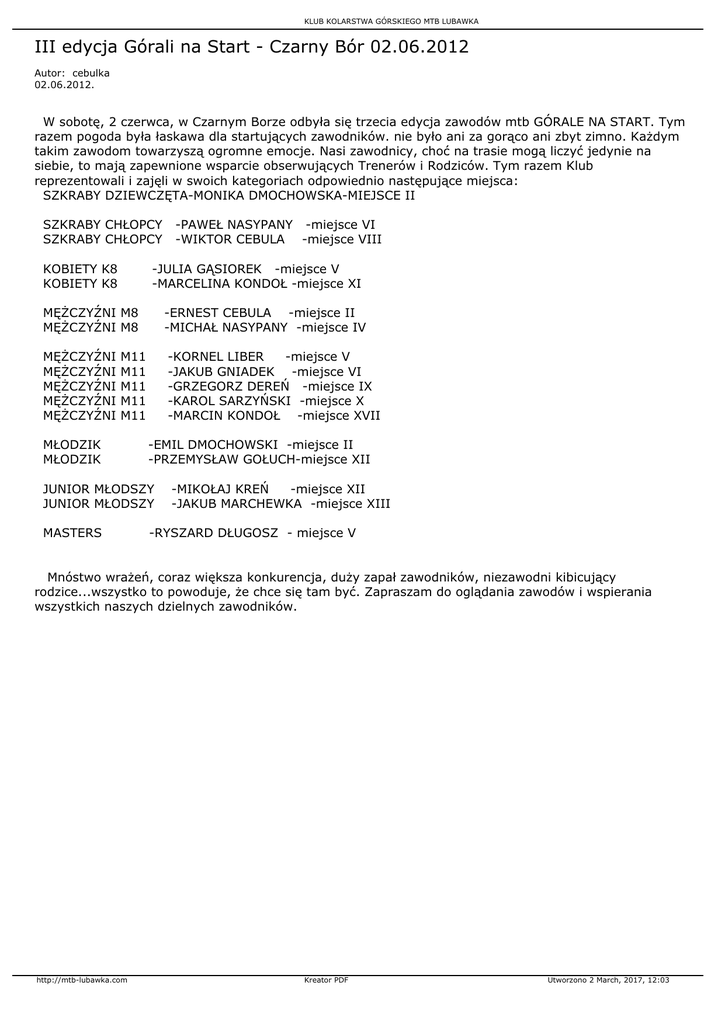 KLUB KOLARSTWA GÓRSKIEGO MTB LUBAWKA III edycja Górali na Start - Czarny Bór 02.06.2012 Autor: cebulka 02.06.2012. W sobotę, 2 czerwca, w Czarnym Borze odbyła się trzecia edycja zawodów mtb GÓRALE NA START. Tym razem pogoda była łaskawa dla startujących zawodników. nie było ani za gorąco ani zbyt zimno. Każdym takim zawodom towarzyszą ogromne emocje. Nasi zawodnicy, choć na trasie mogą liczyć jedynie na siebie, to mają zapewnione wsparcie obserwujących Trenerów i Rodziców. Tym razem Klub reprezentowali i zajęli w swoich kategoriach odpowiednio następujące miejsca: SZKRABY DZIEWCZĘTA-MONIKA DMOCHOWSKA-MIEJSCE II SZKRABY CHŁOPCY SZKRABY CHŁOPCY KOBIETY K8 KOBIETY K8 -PAWEŁ NASYPANY -miejsce VI -WIKTOR CEBULA -miejsce VIII -JULIA GĄSIOREK -miejsce V -MARCELINA KONDOŁ -miejsce XI MĘŻCZYŹNI M8 MĘŻCZYŹNI M8 -ERNEST CEBULA -miejsce II -MICHAŁ NASYPANY -miejsce IV MĘŻCZYŹNI MĘŻCZYŹNI MĘŻCZYŹNI MĘŻCZYŹNI MĘŻCZYŹNI -KORNEL LIBER -miejsce V -JAKUB GNIADEK -miejsce VI -GRZEGORZ DEREŃ -miejsce IX -KAROL SARZYŃSKI -miejsce X -MARCIN KONDOŁ -miejsce XVII M11 M11 M11 M11 M11 MŁODZIK MŁODZIK -EMIL DMOCHOWSKI -miejsce II -PRZEMYSŁAW GOŁUCH-miejsce XII JUNIOR MŁODSZY JUNIOR MŁODSZY MASTERS -MIKOŁAJ KREŃ -miejsce XII -JAKUB MARCHEWKA -miejsce XIII -RYSZARD DŁUGOSZ - miejsce V Mnóstwo wrażeń, coraz większa konkurencja, duży zapał zawodników, niezawodni kibicujący rodzice...wszystko to powoduje, że chce się tam być. Zapraszam do oglądania zawodów i wspierania wszystkich naszych dzielnych zawodników. http://mtb-lubawka.com Kreator PDF Utworzono 2 March, 2017, 12:03