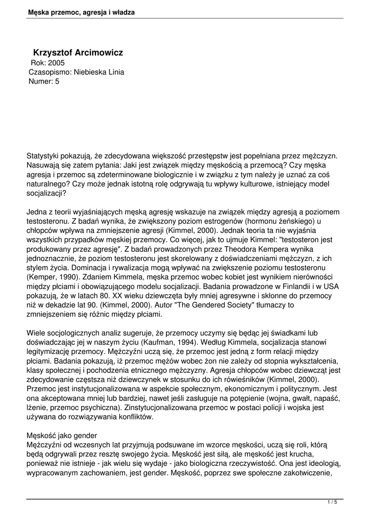 Męska przemoc, agresja i władza Krzysztof Arcimowicz Rok: 2005 Czasopismo: Niebieska Linia Numer: 5 Statystyki pokazują, że zdecydowana większość przestępstw jest popełniana przez mężczyzn. Nasuwają się zatem pytania: Jaki jest związek między męskością a przemocą? Czy męska agresja i przemoc są zdeterminowane biologicznie i w związku z tym należy je uznać za coś naturalnego? Czy może jednak istotną rolę odgrywają tu wpływy kulturowe, istniejący model socjalizacji? Jedna z teorii wyjaśniających męską agresję wskazuje na związek między agresją a poziomem testosteronu. Z badań wynika, że zwiększony poziom estrogenów (hormonu żeńskiego) u chłopców wpływa na zmniejszenie agresji (Kimmel, 2000). Jednak teoria ta nie wyjaśnia wszystkich przypadków męskiej przemocy. Co więcej, jak to ujmuje Kimmel: "testosteron jest produkowany przez agresję". Z badań prowadzonych przez Theodora Kempera wynika jednoznacznie, że poziom testosteronu jest skorelowany z doświadczeniami mężczyzn, z ich stylem życia. Dominacja i rywalizacja mogą wpływać na zwiększenie poziomu testosteronu (Kemper, 1990). Zdaniem Kimmela, męska przemoc wobec kobiet jest wynikiem nierówności między płciami i obowiązującego modelu socjalizacji. Badania prowadzone w Finlandii i w USA pokazują, że w latach 80. XX wieku dziewczęta były mniej agresywne i skłonne do przemocy niż w dekadzie lat 90. (Kimmel, 2000). Autor "The Gendered Society" tłumaczy to zmniejszeniem się różnic między płciami. Wiele socjologicznych analiz sugeruje, że przemocy uczymy się będąc jej świadkami lub doświadczając jej w naszym życiu (Kaufman, 1994). Według Kimmela, socjalizacja stanowi legitymizację przemocy. Mężczyźni uczą się, że przemoc jest jedną z form relacji między płciami. Badania pokazują, iż przemoc mężów wobec żon nie zależy od stopnia wykształcenia, klasy społecznej i pochodzenia etnicznego mężczyzny. Agresja chłopców wobec dziewcząt jest zdecydowanie częstsza niż dziewczynek w stosunku do ich rówieśników (Kimmel, 2000). Przemoc jest instytucjonalizowana w aspekcie społecznym, ekonomicznym i politycznym. Jest ona akceptowana mniej lub bardziej, nawet jeśli zasługuje na potępienie (wojna, gwałt, napaść, lżenie, przemoc psychiczna). Zinstytucjonalizowana przemoc w postaci policji i wojska jest używana do rozwiązywania konfliktów. Męskość jako gender Mężczyźni od wczesnych lat przyjmują podsuwane im wzorce męskości, uczą się roli, którą będą odgrywali przez resztę swojego życia. Męskość jest siłą, ale męskość jest krucha, ponieważ nie istnieje - jak wielu się wydaje - jako biologiczna rzeczywistość. Ona jest ideologią, wypracowanym zachowaniem, jest gender. Męskość, poprzez swe społeczne zakotwiczenie, 1/5 Męska przemoc, agresja i władza jest przyjmowana jako synonim biologicznej płci męskiej. Pleck (1994) poddaje analizie teorie dotyczące męskiej dominacji. Zakładają one, że mężczyźni potrzebują władzy nad kobietami, ponieważ czerpią z tego korzyści i przywileje; po drugie, mężczyźni muszą mieć władzę nad kobietami, gdyż jest to głęboko zakotwiczona potrzeba tkwiąca w męskiej osobowości. Punktem wyjścia do psychologicznej analizy męskiej potrzeby dominacji nad kobietami są wczesne dziecięce doświadczenia z kobietami. Chłopcy postrzegają swoje matki i nauczycielki w szkole podstawowej jako panujące i kontrolujące. Te związki prawdopodobnie mogą wywołać chęć wyrażenia władzy nad kobietami w dorosłym życiu. Mężczyźni odczuwają przez całe życie potrzebę wyzwolenia się spod panowania kobiet. Ponieważ odczuwali dominację kobiet w dzieciństwie, uciskają kobiety, będąc dorosłymi. Ta teoria może służyć jako ogólne wytłumaczenie potrzeby mężczyzn panowania nad kobietami, ale jest ona nadużywana. Twierdzi się bowiem, że winę za tę sytuację ponoszą kobiety. Pleck (1994) wymienia dwie przyczyny związane z tradycyjnymi definicjami męskości i kobiecości. Według niektórych autorów mają one istotny wpływ na postrzeganie kobiet przez mężczyzn jako osoby mające nad nimi władzę uczuciową. W tradycyjnym związku między kobietą a mężczyzną kobiety rzekomo dążą do zawładnięcia uczuciami partnera. Mężczyźni doświadczają swoich uczuć zastępczo poprzez kobiety. Wielu mężczyzn uczy się uczuciowej zależności od kobiet. W końcowym stadium wielu z nich nie jest zdolnych do samodzielnego emocjonalnego życia. Zdaniem Plecka (1994), te szkodliwe przeświadczenia na temat kobiet są dodatkowo utwierdzane przez filmy, które sugerują, iż kobiety chcą sobie podporządkować mężczyzn. Wielfried Wieck uważa, że kobiety są silne, a mężczyźni słabi. To kobieta podtrzymuje mężczyznę na duchu i pozwala mu funkcjonować. Społeczeństwo wychowuje mężczyznę w zależności od kobiet. Uzależnienie dokonuje się już w dzieciństwie. Matka jest pierwszym człowiekiem, który akceptuje dziecko. Z drugiej strony jest pierwszym uosobieniem woli, ponieważ dominuje nad dzieckiem i uzależnia je. Patriarchat określa rodzinę jako instytucję opartą na "pigułce", którą jest matka. Syn uzależnia się od matki - "pigułki". Dorosły mężczyzna zmienia uzależnienie od matki na rzecz uzależnienia od kobiety, partnerki w związku (Wieck, 1993). Hierarchia patriarchatu Po drugie - jak uważa Pleck (1994) - według męskiej filozofii władzy, kobietom wyznacza się określone role, które one powinny spełniać. Formułowanie nakazów w stosunku do kobiet mężczyźni odczuwają jako męskość. Jednak kiedy kobiety odmawiają pełnienia narzuconej im roli, wielu mężczyzn jest zagubionych i w desperacji próbuje przemocą wprowadzić tradycyjne role. Tak więc poczucie męskości jest uzależnione od tego, czy kobiety wypełniają narzucone im role. Kiedy mężczyźni zrozumieją, że mogą rozwijać w sobi