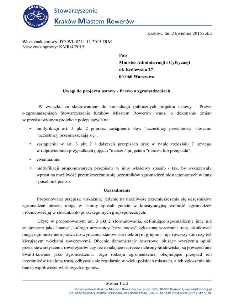 Stowarzyszenie Kraków Miastem Rowerów Kraków, dn. 2 kwietnia 2015 roku Wasz znak sprawy: DP-WL.0211.11.2015.JRM Nasz znak sprawy: KMR/4/2015 Pan Minister Administracji i Cyfryzacji ul. Królewska 27 00-060 Warszawa Uwagi do projektu ustawy - Prawo o zgromadzeniach W związku ze skierowaniem do konsultacji publicznych projektu ustawy - Prawo o zgromadzeniach Stowarzyszenie Kraków Miastem Rowerów wnosi o dokonanie zmian w przedstawionym projekcie polegających na: • modyfikacji art. 3 pkt 2 poprzez zastąpienie słów "uczestnicy przechodzą" słowami "uczestnicy przemieszczają się", • zastąpieniu w art. 3 pkt 2 i dalszych przepisach oraz w tytule rozdziału 2 użytego w odpowiednich przypadkach pojęcia "marszu" pojęciem "marszu lub przejazdu", • ewentualnie: • modyfikacji proponowanych przepisów w inny właściwy sposób - tak, by wskazywały wprost na możliwość przemieszczania się uczestników zgromadzeń niestacjonarnych w inny sposób niż pieszo. Uzasadnienie Proponowane przepisy, wskazując jedynie na możliwość przemieszczania się uczestników zgromadzeń pieszo, mogą w istotny sposób godzić w konstytucyjną wolność zgromadzeń i różnicować ją w stosunku do poszczególnych grup społecznych. Użyte w proponowanym art. 3 pkt 2 sformułowania, definiujące zgromadzenie inne niż stacjonarne jako "marsz", którego uczestnicy "przechodzą" zgłoszoną wcześniej trasą, skutkować mogą ograniczeniem prawa do wyrażania stanowiska niektórym grupom - np. rowerzystom czy też kierującym wózkami rowerowymi. Obecnie demonstracje rowerowe, służące wyrażeniu opinii przez stowarzyszenia rowerzystów czy też działające na rzecz ochrony środowiska, są powszechnie kwalifikowane jako zgromadzenia. Tego rodzaju zgromadzenia, obejmujące przejazd ich uczestników ustaloną trasą, odbywają się regularnie w wielu polskich miastach, a ich zgłoszenia nie budzą wątpliwości właściwych organów. Strona 1 z 2 Stowarzyszenie Kraków Miastem Rowerów, skr. poczt. 525, 30-960 Kraków 1, [email protected] NIP: 677-236-874-3, REGON:122555864, KRS:0000417516, mBank: 40 1140 2004 0000 3502 7542 5078 Stowarzyszenie Kraków Miastem Rowerów Obowiązująca ustawa o zgromadzeniach wspomina wprawdzie w art. 7 ust. 2 pkt 3 o "trasie przejścia", jednakże przepis ten interpretować należy szeroko, zgodnie z postanowieniami Konstytucji RP, gwarantującymi wolność zgromadzeń. Podkreślić należy, że celem rozwiania wszelkich wątpliwości w tym względzie w minionych latach prowadzone były prace legislacyjne zmierzające do zmiany tego przepisu i zastąpienia ww. pojęcia pojęciem "trasy przejścia albo przejazdu" (vide: projekt ustawy o zmianie ustawy - Prawo o zgromadzeniach oraz ustawy Kodeks wykroczeń opublikowany 18 grudnia 2009 r. na stronie Biuletynu Informacji Publicznej MSWiA oraz pismo MSWiA do Rzecznika Praw Obywatelskich z 4 stycznia 2010 r., DAP/026-300 (1)/09/10/MPi). Proponowana ustawa, z uwagi na użyte pojęcie "marszu" i jego definicję, wprost wyłącza tymczasem możliwość przemieszczania się uczestników zgromadzeń pojazdami (np. rowerami). Jedynie na marginesie zwrócić należy uwagę, że pojazdy uczestniczą także w wielu przemarszach pieszych, zapewniające np. nagłośnienie, bądź też przewożąc część uczestników. Nie powinno zarazem budzić wątpliwości, że nieuwzględnienie w proponowanych przepisach możliwości przemieszczania się uczestników zgromadzeń niestacjonarnych w inny sposób niż pieszo w oczywisty sposób godzi w wolność zgromadzeń, gwarantowaną postanowieniami Konstytucji RP. Ustawowe ograniczenie dopuszczalnych sposobów przemieszczania się uczestników zgromadzeń do przemieszczania się pieszo nie znajduje bowiem uzasadnienia w świetle art. 31 ust. 3 Konstytucji. Z poważaniem, Za Zarząd Stowarzyszenia, Krzysztof Nil Ryba /podpisano elektronicznie/ Do wiadomości (w formie elektronicznej): [email protected] Oświadczenie Korespondencję w tej sprawie proszę kierować do mnie za pomocą środków komunikacji elektronicznej zgodnie z art. 39' ustawy z dnia 14 czerwca 1960 r. Kodeks postępowania administracyjnego (Dz. U. z 2000 r. Nr 98, poz. 1071, z późn. zm.). Otrzymują: • • Minister Administracji i Cyfryzacji a/a Strona 2 z 2 Stowarzyszenie Kraków Miastem Rowerów, skr. poczt. 525, 30-960 Kraków 1, [email protected] NIP: 677-236-874-3, REGON:122555864, KRS:0000417516, mBank: 40 1140 2004 0000 3502 7542 5078