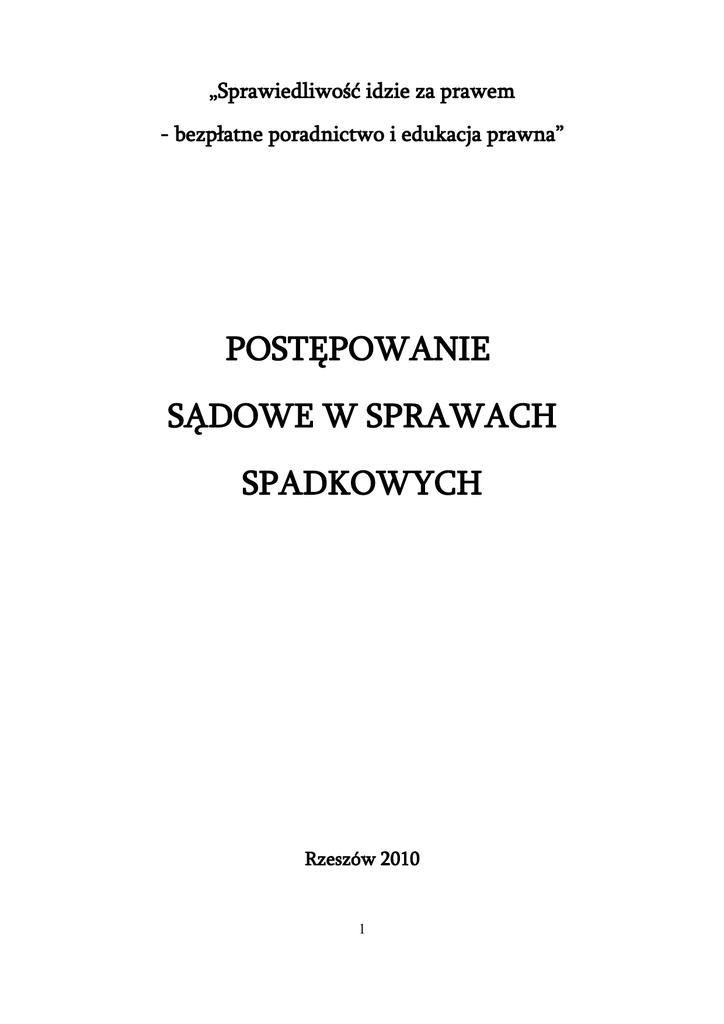 „Sprawiedliwość idzie za prawem - bezpłatne poradnictwo i edukacja prawna” POSTĘPOWANIE SĄDOWE W SPRAWACH SPADKOWYCH Rzeszów 2010 1 Podkarpacki Ośrodek Rozwoju Społeczeństwa Obywatelskiego ul. Fredry 4/58 35-959 Rzeszów tel/fax (0-17) 86 20 122 [email protected] www.porso.yoyo.pl Broszura opracowana przez Karola Grześkiewicza Broszura sfinansowana przez Ministerstwo Pracy i Polityki Społecznej w ramach Programu Operacyjnego Fundusz Inicjatyw Obywatelskich 2 STWIERDZENIE NABYCIA SPADKU Stwierdzenie nabycia spadku przez sąd spadku następuje na wniosek uprawnionego podmiotu czyli każdego mającego interes prawny w prawidłowym wykazaniu następstwa po spadkodawcy. Wniosek taki można złożyć zawsze - nie przedawnia się ani w żadnych okolicznościach nie wygasa prawo do jego złożenia. Jednak jeśli wniosek składa się przed upływem 6 miesięcy wszyscy spadkobiercy muszą złożyć oświadczenie o nabyciu lub odrzuceniu spadku. Za każde oświadczenie w toku posiedzenia, sąd pobiera opłatę sądową w wysokości 50 zł. Brak oświadczeń co do zasady oznacza przyjęcie spadku wprost! - bez ograniczenia odpowiedzialności za długi spadkowe. Do sporządzenia wniosku niezbędne są odpisy aktów stanu cywilnego spadkobierców - dotyczy to dziedziczenia ustawowego, oraz wniosku o zachowek. W zależności od stopnia pokrewieństwa należy wykazać inne akty. Zawsze należy załączyć akt zgonu spadkodawcy Kto załącza jaki akt : • małżonek załącza tylko akt zgonu spadkodawcy – jest w nim wskazany • dzieci niezamężne – załączają akty urodzin 3 • dzieci zamężne (które przyjęły nazwisko małżonka) akt małżeństwa. • rodzeństwo spadkodawcy – akt urodzenia, akt małżeństwa rodziców – jeśli pochodzą z różnych związków. Wniosek składa się do wydziału cywilnego Sądu Rejonowego właściwego dla ostatniego miejsca zamieszkania spadkodawcy. Opłata sądowa od wniosku to 50 zł (do wniosku musimy załączyć dowód uiszczenia opłaty sądowej – w znakach sądowych (do kupienie w kasie sądu,) lub dowód przelewu). Za odpis skrócony aktu pobiera się opłatę skarbową w wysokości 22 zł. Wnioskodawca to: osoba składająca wniosek – może to być dowolny ze spadkobierców, posiadający zdolność do czynności prawnych. – należy wskazać imię i nazwisko oraz adres zamieszkania. Wnioskodawcą może być każdy kto ma w tym interes prawny, a więc m.in. wierzyciele spadkobierców, oraz spadkodawcy. Uczestnicy to: pozostali spadkobiercy : musimy wskazać ich dane i adresy Powinniśmy wskazać wszystkich możliwych spadkobierców. 4 Przykładowy wniosek o stwierdzenie nabycia spadku TYTUŁ: Wniosek o stwierdzenia nabycia spadku. Treść wniosku : Wnoszę o : stwierdzenie, że spadek po ……………, synu /córce ……… i ……….. , zmarłym dnia …………. w ……….. i ostatnio zamieszkałym w ……………, na podstawie ustawy nabyli: (W tym miejscu należy wymienić wszystkich znanych spadkobierców, oraz ich stopień pokrewieństwa ze zmarłym ): Np. Anna Nowak - żona, Janusz Nowak- brat, Marian Nowak- brat, Grażyna Kowalska – siostra, Barbara Bielak – siostra, Uzasadnienie W uzasadnieniu należy wskazać okoliczności spadkobrania. W szczególności: • powtórzyć datę i dane spadkodawcy. • opisać wzajemne relacje miedzy spadkodawcą a spadkobiercami (w zakresie powiązań rodzinnych) Na dowód powiązań rodzinnych należy załączyć odpisy z aktów stanu cywilnego. 5 • wskazać i ewentualnie załączyć oświadczenia spadkodawców o przyjęciu, lub odrzuceniu spadku • jeśli wiemy że nie ma dalszych spadkobierców - jako dowód powołujemy zapewnienie spadkowe, które będzie złożone podczas rozprawy. Wniosek należy własnoręcznie podpisać. Podpisany oryginał wniosku, wraz z oryginałami załączników (np. odpisami z aktów stanu cywilnego) pozostawić dla sądu. Należy stworzyć tyle jego kopii wniosku i załączników (wystarczą kserokopie) ilu jest uczestników postępowania wskazanych we wniosku. Jeden egzemplarz kopii ad acta (dla siebie – do „akt”). Wniosek wraz z odpisami dla uczestników, można złożyć na biurze podawczym – wówczas na kopii którą pozostawiamy dla siebie otrzymamy prezentatę – pieczęć sądu, wraz z datą złożenia wniosku. Całość dokumentów możemy również wysłać pocztą do sądu – za pomocą listu poleconego. Dowodem złożenia wniosku, będzie wówczas dowód nadania listu poleconego. Na rozprawę poprzedzającą wydanie postanowienia o stwierdzeniu nabycia spadku sąd wzywa wnioskodawcę, wszystkich mogących wchodzić w rachubę jako spadkobiercy ustawowi i testamentowi (bez względu na ocenę ważności złożonego testamentu), a ponadto inne 6 osoby zainteresowane, zgłaszające swe uczestnictwo w sprawie, których udział sąd uzna za konieczny. DZIAŁ SPADKU Dział spadku polega na określeniu wartości całego majątku i jego podziale pomiędzy poszczególnych spadkobierców. Dział spadku może nastąpić w drodze umowy, w tym także zawartej w formie ugody w postępowaniu działowym, albo na mocy orzeczenia sądu. Wniosek o wszczęcie postępowania działowego mogą złożyć: spadkobierca, spadkobierca zmarłego spadkobiercy, nabywcę spadku, a na zasadach ogólnych także prokuratora i Rzecznika Praw Obywatelskich. Od wniosku o dział spadku pobiera się opłatę stałą w wysokości 500 zł, a jeżeli zawiera on zgodny projekt działu spadku w wysokości 300 zł Dział spadku obejmuje podział aktywów majątku spadkowego, nie obejmuje zaś długów spadkowych. przedmiotem działu jest majątek, który stanowił w chwili otwarcia spadku własność spadkodawcy. Darowizny otrzymane od spadkodawcy dolicza się do masy spadkowej. 7 SĄDOWY DZIAŁ SPADKU Zasadą sądowego działu spadku jest objęcie nim całego spadku. Z ważnych powodów sądowy dział spadku może zostać ograniczony do części spadku. 1. Z wn