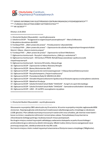 *** SERWIS INFORMACYJNY OLSZTYŃSKIEGO CENTRUM ORGANIZACJI POZARZĄDOWYCH*** *** I FUNDACJI INICJATYWA KOBIET AKTYWNYCH FIKA*** *** NR 16/2013*** Olsztyn, 6.10.2013 ================================= 1. Olsztyński Budżet Obywatelski – wyniki głosowania 2. Szkolenia OCOP - "Księgowość w organizacjach pozarządowych" - Maria Ziółkowska 3. Bezpłatne doradztwo dla NGO 4. Fundacja FIKA - „Mam prawo do prawa” - Porady prawne i obywatelskie 5. Fundacja FIKA - „Mam prawo do prawa” – Zaproszenie do udziału w Regionalnym Kongresie Kobiet Warmii i Mazur „Razem możemy więcej” 6. Fundacja FIKA – „Mam prawo do prawa” - Zaproszenie na Dzień Mediatora 7. Ogłoszenia o konkursach - Ruszyła V edycja konkursu „Odkryj e-wolontariat”! 8. Ogłoszenia o konkursach – XIII konkurs PFRON: Rehabilitacja zawodowa i społeczna osób niepełnosprawnych 9. Ogłoszenia o konkursach - Seniorzy XXI wieku. Edycja druga 10. Ogłoszenia OCOP - Zaproszenie na Marsz Różowej Wstążki 11. Ogłoszenia OCOP - Barwy Wolontariatu 2013 12. Ogłoszenia OCOP - Zaproszenie do nominowania gwiazd - V Edycja Gwiazd Dobroczynności 13. Ogłoszenia OCOP - Ruszyła kampania „Pacjent wykluczony” 14. Ogłoszenia OCOP - Posiedzenie Rady W-MSON 8.10.2013 15. Ogłoszenia OCOP - Ośrodek Wsparcia Ekonomii Społecznej w Olsztynie zaprasza na bezpłatne szkolenia 16. Ogłoszenia OCOP - BabaFest III edycja 17. Ogłoszenia OCOP - Szkoła Chińskich Sztuk Walki "SHAOLIN" - Kung Fu to sport dla każdego 18. Ogłoszenia OCOP - Szkoła Chińskich Sztuk Walki "SHAOLIN" - Samoobrona dla kobiet i dziewcząt 19. Ogłoszenia OCOP – UNO - 25 lat RPO-oszczędzanie się opłaca ================================= -----------------------------------------------------------------1. Olsztyński Budżet Obywatelski – wyniki głosowania -----------------------------------------------------------------Głosowanie na projekty OBO zakończyło się 13 września. W sumie na projekty miejskie zagłosowało 6056 olsztynian. Najwięcej głosów zebrał pomysł rewaloryzacji zabytkowego parku miejskiego w Jakubowie (1338 głosów). Plan zakłada wymianę zniszczonych nawierzchni oraz schodów, jak również nowe ławki i kosze na śmieci, nasadzenie roślinności i remont placu zabaw. Pomysłodawcy liczą również na zlikwidowanie dzikiego parkingu i budowę nowych miejsc postojowych. Na drugim miejscu znalazł się projekt zakładający zadaszenie skateparku w parku Kusocińskiego i przekształcenie go w całoroczny obiekt rekreacyjny. Młodzi ludzie, którzy mocno zaangażowali się w promocję swojej idei, zdołali przekonać do niej 941 osób. Na trzecim miejscu z kolei znalazł się pomysł utworzenia w Olsztynie roweru miejskiego (768 głosów). Oprócz miliona złotych na projekty miejskie, do wykorzystania było także po 50 tys. na każde z 23 osiedli. W tym przypadku mieszkańcy najczęściej wskazywali na potrzeby rozwijania infrastruktury rekreacyjnej, a także konieczność remontów chodników i ścieżek rowerowych. obowynikiprojektyoglnomiejskie.pdf >> obowynikiprojektyosiedlowe.pdf >> --------------------------------------------------------------------2. Szkolenia OCOP - "Księgowość w organizacjach pozarządowych" - Maria Ziółkowska --------------------------------------------------------------------Związek Stowarzyszeń „Razem w Olsztynie”, prowadzący Olsztyńskie Centrum Organizacji Pozarządowych, zaprasza na szkolenie pt. „Księgowość w organizacjach pozarządowych”, które przeprowadzi Maria Ziółkowska – księgowa z wieloletnim doświadczeniem, pracująca w organizacji pozarządowej posiadającej status organizacji pożytku publicznego. Program szkolenia: I Plan Kont II Jak prawidłowo opisywać dokumenty finansowe III Praktyczne przykłady w księgowości IV VAT w organizacjach pozarządowych V Sprawozdawczość Szkolenie jest nieodpłatne i skierowane do przedstawicieli organizacji pozarządowych z Olsztyna i powiatu olsztyńskiego, zajmujących się w swoich organizacjach księgowością. Będzie to szkolenie na poziomie podstawowym i średniozaawansowanym. Uczestnicy szkolenia otrzymają materiały szkoleniowe oraz poczęstunek. Miejsce szkolenia: Olsztyńskie Centrum Organizacji Pozarządowych ul. Tarasa Szewczenki 1 10-274 Olsztyn mapa >> Termin: 24-25 października 2013 godz.16.30-20.00 Prosimy o wypełnienie formularza zgłoszeniowego na stronie http://www.ocop.olsztyn.pl/index.php?group=ocop&page=szkolenia&grupa=1&id=150. Ilość miejsc jest ograniczona. O zakwalifikowaniu się decyduje kolejność zgłoszeń. Potwierdzenie udziału w spotkaniu zostanie przekazane telefoniczne lub przesłane e -mailem na podany w formularzu adres co najmniej 3 dni przed szkoleniem. Organizatorzy zastrzegają sobie prawo do odwołania lub zmiany terminu szkolenia. Informacje na temat szkolenia: Związek Stowarzyszeń "Razem w Olsztynie" ul. Tarasa Szewczenki 1 10-274 Olsztyn tel. 503 680 500 [email protected] Szkolenie jest organizowane przez Związek Stowarzyszeń „Razem w Olsztynie” w ramach projektu „Olsztyńskie Centrum Organizacji Pozarządowych" realizowanego przy współudziale finansowym Gminy Olsztyn oraz projektu "W kierunku profesjonalizacji" współfinansowanego przez Powiat Olsztyński. --------------------------------------------------------------------3. Bezpłatne doradztwo dla NGO --------------------------------------------------------------------Olsztyńskie Centrum Organizacji Pozarządowych oferuje bezpłatną pomoc przy przygotowaniu ofert konkursowych. Organizacje zainteresowane ofertą OCOP proszone są o kontakt: [email protected] Tel. 503 680 500 Bezpłatne doradztwo uzyskać można również w zakresie m.in.: rozliczania ofert z realizacji zadań publicznych oraz pisania i rozliczania projektów. Osoby zajmujące się w organizacji sprawami księgowymi i finansowymi zapraszamy do skorzystania z bezpłatnego doradztwa w Olsztyńskim Centrum Organizacji Pozarzą