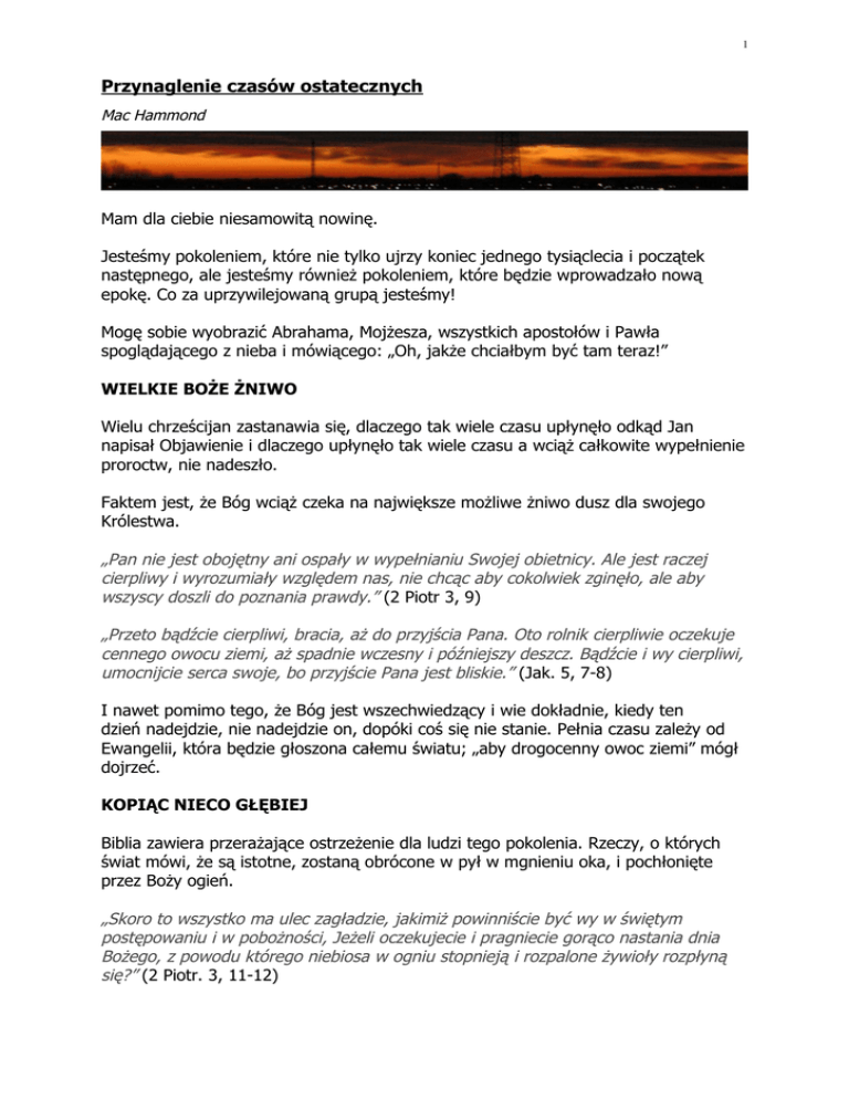 1 Przynaglenie czasów ostatecznych Mac Hammond Mam dla ciebie niesamowitą nowinę. Jesteśmy pokoleniem, które nie tylko ujrzy koniec jednego tysiąclecia i początek następnego, ale jesteśmy również pokoleniem, które będzie wprowadzało nową epokę. Co za uprzywilejowaną grupą jesteśmy! Mogę sobie wyobrazić Abrahama, Mojżesza, wszystkich apostołów i Pawła spoglądającego z nieba i mówiącego: „Oh, jakże chciałbym być tam teraz!” WIELKIE BOŻE ŻNIWO Wielu chrześcijan zastanawia się, dlaczego tak wiele czasu upłynęło odkąd Jan napisał Objawienie i dlaczego upłynęło tak wiele czasu a wciąż całkowite wypełnienie proroctw, nie nadeszło. Faktem jest, że Bóg wciąż czeka na największe możliwe żniwo dusz dla swojego Królestwa. „Pan nie jest obojętny ani ospały w wypełnianiu Swojej obietnicy. Ale jest raczej cierpliwy i wyrozumiały względem nas, nie chcąc aby cokolwiek zginęło, ale aby wszyscy doszli do poznania prawdy.” (2 Piotr 3, 9) „Przeto bądźcie cierpliwi, bracia, aż do przyjścia Pana. Oto rolnik cierpliwie oczekuje cennego owocu ziemi, aż spadnie wczesny i późniejszy deszcz. Bądźcie i wy cierpliwi, umocnijcie serca swoje, bo przyjście Pana jest bliskie.” (Jak. 5, 7-8) I nawet pomimo tego, że Bóg jest wszechwiedzący i wie dokładnie, kiedy ten dzień nadejdzie, nie nadejdzie on, dopóki coś się nie stanie. Pełnia czasu zależy od Ewangelii, która będzie głoszona całemu światu; „aby drogocenny owoc ziemi” mógł dojrzeć. KOPIĄC NIECO GŁĘBIEJ Biblia zawiera przerażające ostrzeżenie dla ludzi tego pokolenia. Rzeczy, o których świat mówi, że są istotne, zostaną obrócone w pył w mgnieniu oka, i pochłonięte przez Boży ogień. „Skoro to wszystko ma ulec zagładzie, jakimiż powinniście być wy w świętym postępowaniu i w pobożności, Jeżeli oczekujecie i pragniecie gorąco nastania dnia Bożego, z powodu którego niebiosa w ogniu stopnieją i rozpalone żywioły rozpłyną się?” (2 Piotr. 3, 11-12) 2 Czy zauważasz to, że powinniśmy żyć życiem całkowicie zaprzedanym i poświęconym Panu? Chodzić z Bogiem? Żyć z Bogiem? Nie jest to przypadkiem, że Duch Święty użył „dnia Pańskiego” w wersecie 10 i „dnia Bożego” w wersecie 12. Jezus jest Królem Królów i Panem Panów; Jego „Dzień” reprezentuje 1000 lat Jego panowania na ziemi. Bóg jest wieczny i w nim nie ma czegoś takiego, jak czas, dlatego „dzień Boży” mówi nam o wejściu do wieczności. Znajdujemy w tym fragmencie niesamowitą prawdę. Jesteśmy zachęceni, aby „wyczekiwać i wyglądać przyjścia dnia Bożego…”. Innymi słowy, nasza postawa i życie mają wpływ na Jego przyjście! Im bardziej głodny jesteś tego, aby obecna era się skończyła – a panowanie Jezusa zaczęła – tym szybciej te rzeczy zaczną się dziać. Myślę, że łatwo zobaczysz związek pomiędzy tymi dwoma rzeczami, w następnej części naszych przemyśleń. Widzisz, jest to jednym z elementów, które muszą wydarzyć się wraz z „pełnią czasu”, przed nastaniem czasów ostatecznych. Greckie słowo przetłumaczone, jako „szukać” w tym fragmencie dosłownie oznacza „gorące wyczekiwanie i oczekiwanie”. Bóg chce, abyś bardzo pragnął nastania wieczności – „dnia Bożego”. On chce, abyś miał to na uwadze oraz abyś był motywowany twoim zrozumieniem wiecznego przeznaczenia. Słowo mówi, że to życie tutaj jest jedynie mrugnięciem oka; niczym tylko powietrzem. Ale jest wieczność poza zasłoną śmierci, oczekującej, aby pochłonąć każdego z nas. Problem pojawia się wtedy, kiedy nie mamy właściwego zrozumienia naszego prawdziwego, wiecznego przeznaczenia, ponieważ nie jesteśmy w stanie gorąco i żarliwie oczekiwać i pragnąć nastania tego dnia. Prawdą jest, że będziemy panować z Jezusem we wieczności. I to nie tylko nad kilkami metrami kwadratowymi stałego lądu, ale niezmierzonym wszechświatem, który będziemy przez wieki poznawać. WZBUDZENI, ABY RZĄDZIĆ W Mateusza 25, Jezus opowiada przypowieść, w której z dalekiej podróży wraca zarządca. Powierzył podczas swojej nieobecności wszystkie dobra trzem swoim sługom; dwaj z nich pomnożyli jego wartość posiadania, więc powiedział do nich, „Rzekł mu pan jego: Dobrze, sługo dobry i wierny! Nad tym, co małe, byłeś wierny, wiele ci powierzę”. Cudowną rzeczywistością jest to, że ty również zostałeś powołany do tego, aby panować z Jezusem. Ale została ci również przekazana odpowiedzialność, a to jak ją wypełnisz, zależy od twojej umiejętności zarządzania zasobami, które Pan powierzył dla twojego życia. Nie ma znaczenia, jak wiele zostało ci dane, ale znaczenie ma to, co z tym zrobisz i jak będziesz tym zarządzał. 3 W przypowieści tej, jeden otrzymał pięć talentów, drugi dwa a trzeci jeden talent. Jednak do każdego z tych sług zostało dane takie samo polecenie. Zatem nie ma tu znaczenia ilość, ale to, co ty z tym zrobisz. Co robisz z rzeczami, zasobami i czasem, który posiadasz? Co robisz, aby je przyniosły one dochód dla Królestwa Bożego? To nie jest kwestia znajdowania najbardziej opłacalnych źródeł powiększania Twoich zasobów. Jedyną drogą do przynoszenia zysków dla Królestwa Bożego, jest zasada siania i zbierania. CEL OBJAWIENIA Celem Księgi Objawienia jest uczynić nas świadomymi naszych potrzeb, abyśmy pamiętali o oczekującej na nas wieczności i prowadzili nasze życie zgodnie z tymi pragnieniami. To życie wydaje się być tak bardzo absorbujące i pochłaniające naszą uwagę – mój przyjacielu, ono jest niczym. Musimy stać się ukierunkowani na wieczność. Musimy skupić się na wieczności i na sferze niewidzialnej, objawionej w Słowie, nie tymczasowej, która zanika i wciąż ulega przemianie. Powinniśmy raczej, zgodnie z Jego obietnicą, wyczekiwać nowego nieba i nowej ziemi, gdzie mieszka sprawiedliwość. „Prze