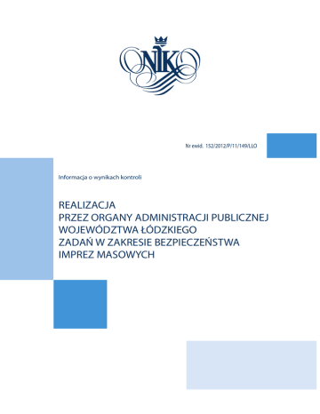 Nr ewid. 152/2012/P/11/149/LLO Informacja o wynikach kontroli REALIZACJA PRZEZ ORGANY ADMINISTRACJI PUBLICZNEJ WOJEWÓDZTWA ŁÓDZKIEGO ZADAŃ W ZAKRESIE BEZPIECZEŃSTWA IMPREZ MASOWYCH MARZEC 2 01 1 MISJĄ Najwyższej Izby Kontroli jest dbałość o gospodarność i skuteczność w służbie publicznej dla Rzeczypospolitej Polskiej WIZJĄ Najwyższej Izby Kontroli jest cieszący się powszechnym autorytetem najwyższy organ kontroli państwowej, którego raporty będą oczekiwanym i poszukiwanym źródłem informacji dla organów władzy i społeczeństwa Dyrektor Delegatury NIK w Łodzi Janusz Maj Akceptuję: Marian Cichosz Wiceprezes Najwyższej Izby Kontroli dnia Najwyższa Izba Kontroli ul. Filtrowa 57 02-056 Warszawa T/F +48 22 444 50 00 www.nik.gov.pl Spis treści 1. Wprowadzenie.................................................................................................................. 4 1.1. Założenia kontroli..................................................................................................................... 4 2. Podsumowanie wyników kontroli.................................................................... 6 2.1. Ogólna ocena kontrolowanej działalności . ................................................................... 6 2.2. Synteza wyników kontroli..................................................................................................... 7 2.3. Uwagi końcowe i wnioski...................................................................................................... 9 3. Informacje szczegółowe.......................................................................................12 3.1. Uwarunkowania ekonomiczno-organizacyjne............................................................12 3.2. Szczegółowe wyniki kontroli..............................................................................................13 3.2.1. Działania administracji samorządowej w zakresie bezpieczeństwa imprez masowych.......................................................................................................13 3.2.2. Realizacja przez Policję zadań związanych z bezpieczeństwem imprez masowych.......................................................................................................15 3.2.3. Realizacja zadań przez komendy powiatowe Państwowej Straży Pożarnej...................................................................................21 3.2.4. Forma prawna opinii o niezbędnej wielkości sił i środków potrzebnych do zabezpieczenia imprezy masowej, zastrzeżeniach do stanu technicznego obiektu (terenu) oraz o przewidywanych zagrożeniach – wydawanych przez jednostki Policji i Państwowej Straży Pożarnej.....................................24 3.2.5. Działania Wojewody Łódzkiego w zakresie bezpieczeństwa imprez masowych.......................................................................................................26 4. Informacje dodatkowe...........................................................................................29 4.1. Organizacja kontroli...............................................................................................................29 4.2. Przebieg kontroli.....................................................................................................................29 5. Załączniki..........................................................................................................................31 1 W PR OWADZEN I E 1.1 Założenia kontroli Numer i temat kontroli P/11/149 - Realizacja przez organy administracji publicznej województwa łódzkiego zadań w zakresie bezpieczeństwa imprez masowych. Cel kontroli Celem kontroli było dokonanie oceny realizacji przez organy administracji publicznej województwa łódzkiego zadań związanych z zapewnieniem bezpieczeństwa imprez masowych. W szczególności dokonano oceny: −− działań organów administracji państwowej i samorządowej w zakresie bezpieczeństwa imprez masowych, −− czynności podejmowanych przez Policję oraz Państwową Straż Pożarną w związku z zabezpieczaniem imprez masowych, −− zasad i trybu gromadzenia i przetwarzania przez jednostki Policji informacji dotyczących bezpieczeństwa imprez masowych. Uzasadnienie podjęcia kontroli Najwyższa Izba Kontroli przeprowadziła w II półroczu 2000 r. kontrolę przestrzegania przepisów o bezpieczeństwie imprez masowych. Kontrolą objęto wówczas 56 jednostek w tym m.in. 16 urzędów miast (gmin), 8 komend wojewódzkich Policji i 13 komend Państwowej Straży Pożarnej. Kontrolę koordynowała Delegatura NIK w Łodzi. Wyniki tej kontroli pozwoliły na pozytywną ocenę (mimo stwierdzonych uchybień) działań jednostek Policji i jednostek Państwowej Straży Pożarnej. W szczególności, prawidłowo sporządzano plany zabezpieczenia imprez masowych, przeprowadzano lustrację stadionów przed wydaniem opinii związanych z organizowaniem meczów piłki nożnej. Ponadto pozytywnie oceniono koordynację działań poszczególnych służb przy zabezpieczaniu imprez masowych. Krytycznie natomiast należało ocenić organizację i efektywność działań organów administracji samorządowej (miast i gmin) w zakresie rozpatrywania wniosków w sprawie udzielania zezwoleń na przeprowadzenie imprez masowych. W szczególności stwierdzono niewłaściwe oddziaływanie administracji samorządowej na zwiększenie skuteczności działań służb porządkowych organizatorów imprez. Organy wydające zezwolenia nie dysponowały dostateczną wiedzą na temat spełniania przez obiekty, w których były organizowane imprezy masowe (przede wszystkim stadiony), wymogów prawa budowlanego. Stwierdzono także przypadki organizowania imprez masowych bez stosownego zezwolenia. Również materiały Policji wskazywały na istotne nieprawidłowości w funkcjonowaniu służb porządkowych organizatorów imprez masowych. W większości przypadków osoby w ni