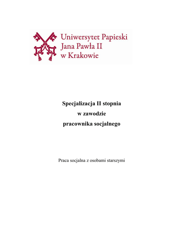 Specjalizacja II stopnia w zawodzie pracownika socjalnego Praca socjalna z osobami starszymi Nazwa podmiotu: Uniwersytet Papieski Jana Pawła II w Krakowie Wydział Nauk Społecznych Instytut Pracy Socjalnej Dane teleadresowe: Rektorat – ul. Kanonicza 25, 31-002 Kraków e-mail: [email protected] phone: 12-421-84-16 Instytut Pracy Socjalnej ul. Kanonicza 18, 31-002 Kraków e-mail: [email protected] phone: 12-422-21-21 Osoba odpowiedzialna: dr hab. Małgorzata Duda e-mail: [email protected] Program szkolenia w zakresie przygotowania podstawowego MODUŁ 1 A Projekt socjalny – 40 godzin I. ZAŁOŻENIA DO REALIZACJI MODUŁU Uczestnicy szkolenia zapoznają się z metodologią tworzenia projektu socjalnego oraz nabędą umiejętności jego opracowania i realizacji, jako narzędzia stosowanego w pracy socjalnej. Ważnym elementem skutecznej pracy socjalnej jest umiejętność formułowania adekwatnych celów w oparciu o diagnozę problemów społecznych oraz koordynacja i realizacja zaplanowanych działań wraz z ewaluacją i oceną uzyskania założonych efektów. II. EFEKTY KSZTAŁCENIA WIEDZA W_01 Zna podstawowe pojęcia z zakresu metodologii badań społecznych. W_02 Posiada wiedzę o funkcjonowaniu mikro, mezzo i makrostruktur społecznych. W_03 Posiada wiedzę o roli różnych instytucji i organizacji w realizacji zadań pomocy społecznej oraz możliwości współdziałania z nimi. W_04 Zna czynniki wspomagające i ograniczające jakość społecznego funkcjonowania jednostek, grup, środowisk. W_05 Posiada wiedzę o znaczeniu zasobów tkwiących w jednostkach, grupach i społecznościach oraz uwzględnia je w podejmowanych działaniach socjalnych. W_06 Zna metodologię i zasady tworzenia projektu socjalnego. W_07 Zna zasady opracowania dokumentacji realizowanego projektu socjalnego. UMIEJĘTNOŚCI U_01 Wykorzystuje wiedzę teoretyczną do szukania rozwiązań i dokonuje wyborów optymalnych dla rozwiązania problemów społecznych określonych w projekcie socjalnym. U_02 Posiada umiejętność sformułowania diagnozy społecznej i wykorzystania jej w przekształcaniu rzeczywistości społecznej. U_03 Posiada umiejętność uruchamiania możliwości jednostek, grup i środowisk oraz pozyskiwania ich do współpracy. U_04 Posiada umiejętność działania planowego i systematycznego w oparciu o opracowane programy pomocy społecznej. U_05 Posiada umiejętność projektowania działań nastawionych na zmianę. U_06 Posiada umiejętność realizacji projektu. U_07 Umie dostrzec i zastosować optymalne rozwiązania w projekcie socjalnym. U_08 Posiada umiejętność wyboru optymalnych rozwiązań problemów społecznych określonych w projekcie socjalnym. U_09 Umie dokonać monitorowania i ewaluacji zrealizowanych przedsięwzięć. U_10 Posiada umiejętność opracowania dokumentacji realizacji projektu socjalnego formułując wnioski uniwersalne i postulatywne. U_11 Wykorzystuje w praktyce zawodowej różne metody pracy socjalnej oraz zasady monitorowania i ewaluacji. U_12 Posiada umiejętności organizacyjne i koordynacyjne KOMPETENCJE SPOŁECZNE K_01 Potrafi nawiązać kontakt z różnymi grupami klientów, instytucjami i społecznościami. K_02 Jest przygotowany do interpretowania mechanizmów funkcjonowania człowieka w różnych sytuacjach społecznych. K_03 Potrafi stworzyć sieć usług socjalnych współpracując z różnymi instytucjami, organizacjami i specjalistami funkcjonującymi w społeczności lokalnej. K_04 Ma poczucie odpowiedzialności za pracę własną i zespołu. K_05 Potrafi zastosować posiadaną wiedzę w działaniu. III. METODY DYDAKTYCZNE 1. Wykład, ćwiczenia IV. PODSTAWOWE ŚRODKI DYDAKTYCZNE 1. Komputer, projektor, prezentacje multimedialne. 2. Materiały szkoleniowe. V. TREŚCI KSZTAŁCENIA ZE WSKAZANIEM FORMY REALIZACJIProjekt Projekt socjalny Lp. Tematyka zajęć 1. Tok postępowania projektującego 2. Poszukiwanie mocnych stron klienta i zasobów środowiska jako główne podejście do tworzenia projektu 3. Metody, techniki i narzędzia stosowane podczas realizacji projektu socjalnego 4. Znaczenie i konstrukcja budżetu związanego z projektem socjalnym 5. Rola i znaczenie działalności wolontariuszy biorących udział w realizacji projektu 6. Monitorowanie i ocena projektu 7. Zarządzanie projektem socjalnym socjalny VI. PROPONOWANA KADRA DYDAKTYCZNA mgr Joanna Dyrcz mgr Józefa Kucharska MODUŁ: 1 B Mediacje i negocjacje – 20 godzin I. ZAŁOŻENIA DO REALIZACJI MODUŁU Celem szkolenia jest zapoznanie uczestników z psychologią powstawania sytuacji konfliktowych, zasadami, organizacją oraz przebiegiem procesu mediacji i negocjacji, stosowanych strategii oraz technik oraz doskonalenie i praktyczne ćwiczenie umiejętności mediacyjnych i negocjacyjnych. II. EFEKTY KSZTAŁCENIA WIEDZA W_01 Posiada wiedzę o konfliktach, ich źródłach i możliwych sposobach ich rozwiązywania w drodze negocjacji i mediacji. W_02 Posiada wiedzę o istocie, typach i fazach negocjacji. W_03 Posiada wiedzę o warunkach skutecznego rozwiązywania sporów. W_04 Posiada wiedzę na temat stylów negocjacyjnych oraz zna narzędzia skutecznych negocjacji. W_05 Zna techniki wywierania wpływu na ludzi. W_06 Posiada wiedzę na temat różnic pomiędzy wpływem, władzą a manipulacją. W_07 Posiada wiedzę na temat mediacji i jej praktycznego zastosowania. W_08 Zna uregulowania prawne dotyczące mediacji. W_09 Posiada wiedzę na temat zasad prowadzenia postępowania mediacyjnego. W_10 Posiada wiedzę na temat mediacji rodzinnych, w tym specyfiki sporów rodzinnych. W_11 Posiada wiedzę o zasadach sporządzania kontraktów. W_12 Zna zasady oceny realizacji kontraktu i renegocjacji kontraktu socjalnego. W_13 Posiada wiedzę o znaczeniu etyki w negocjacjach i mediacjach. UMIEJĘTNOŚCI U_01 Posiada umiejętność oceny sytuacji konfliktowej i znajdowania adekwatnych rozwiązań. U_02 Potrafi negocjować i pełnić rolę mediatora. U_03 Potrafi zastosować w praktyce zawodowej stra