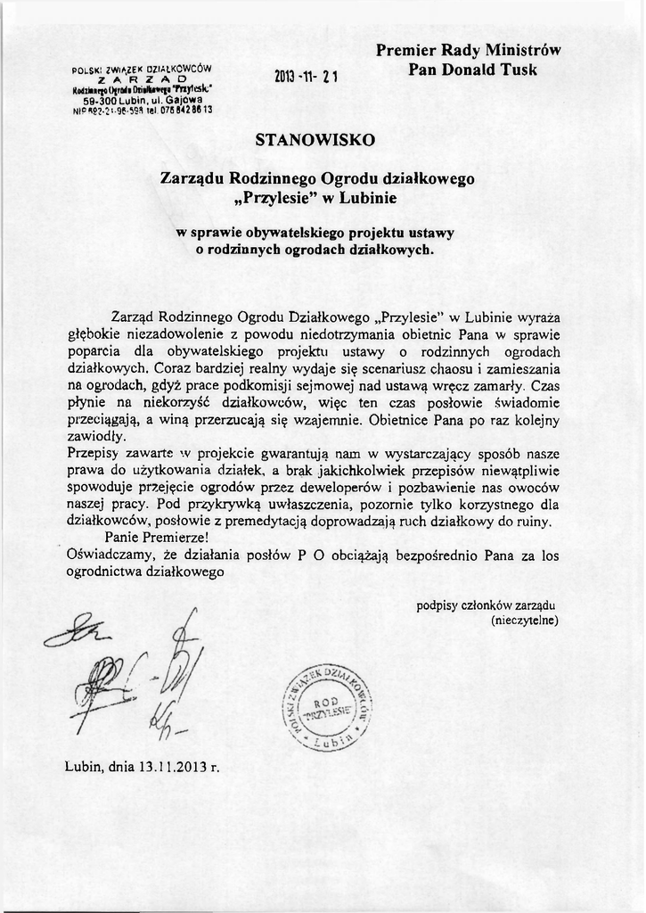 POLSK! ZWÓZEK DZIAŁKOWCÓW Z A R Z D Kodzifinrgo ItyaJi Dtiilk*wc|< Tnyleslt* 59-300 L u b i n , u l . Gajowa NlP«S?-2i-9e-5SS tel 075 84 2 8613 2013 -11- 2 1 Premier Rady Ministrów Pan Donald Tusk STANOWISKO Zarządu Rodzinnego Ogrodu działkowego „Przylesie" w Lubinie w sprawie obywatelskiego projektu ustawy o rodzinnych ogrodach działkowych. Zarząd Rodzinnego Ogrodu Działkowego „Przylesie" w Lubinie wyraża głębokie niezadowolenie z powodu niedotrzymania obietnic Pana w sprawie poparcia dla obywatelskiego projektu ustawy o rodzinnych ogrodach działkowych. Coraz bardziej realny wydaje się scenariusz chaosu i zamieszania na ogrodach, gdyż prace podkomisji sejmowej nad ustawą wręcz zamarły. Czas płynie na niekorzyść działkowców, więc ten czas posłowie świadomie przeciągają, a winą przerzucają się wzajemnie. Obietnice Pana po raz kolejny zawiodły. Przepisy zawarte w projekcie gwarantują nam w wystarczający sposób nasze prawa do użytkowania działek, a brak jakichkolwiek przepisów niewątpliwie spowoduje przejęcie ogrodów przez deweloperów i pozbawienie nas owoców naszej pracy. Pod przykrywką uwłaszczenia, pozornie tylko korzystnego dla działkowców, posłowie z premedytacją doprowadzają ruch działkowy do ruiny. Panie Premierze! Oświadczamy, że działania posłów P O obciążają bezpośrednio Pana za los ogrodnictwa działkowego podpisy członków zarządu (nieczytelne) Lubin, dnia 13.11.2013 r.