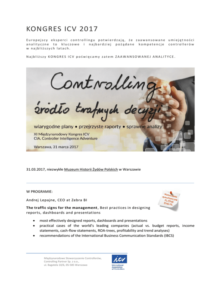 KONGRES ICV 2017 Europejscy eksperci controllingu potwierdzają, że zaawansowane umiejęt ności analityczne to kluczowe i najbardziej pożądane kompetencje controllerów w najbliższych latach. Najbliższy KONGRES ICV poświęcamy zatem ZAAWANSOWANEJ ANALITYCE . 31.03.2017, niezwykłe Muzeum Historii Żydów Polskich w Warszawie W PROGRAMIE: Andrej Lepajne, CEO at Zebra BI The traffic signs for the management , Best practices in designing reports, dashboards and presentations most effectively designed reports, dashboards and presentations practical cases of the world’s leading companies (actual vs. budget reports, income statements, cash-flow statements, ROA-trees, profitability and trend analyses) recommendations of the International Business Communication Standards (IBCS) Międzynarodowe Stowarzyszenie Controllerów, Controlling Partner Sp. z o.o., ul. Bagatela 10/6, 05-585 Warszawa Valentin Usenkov, member of ICV Int. WG The longest 40 centimeters… Who is the final beneficiary of controlling? Decision making: Knowledge vs. Intuition How many meanings could one number have? What virus does controlling need to bring into business? Siegfried Gänßlen, Chairman of the Board of the ICV Why Controller Becomes More and More Important to Management Board? Circumstances to become Important Controller for Management Board Value of business analytics for the Management Board decisions: How to rely on controller competences? How to become reliable in Management Board eyes? Enthusiasm and ability to inspire others as the most important features for good relations between Controller and Management Board. Eryk Wtorkowski, Dyrektor ds. Rozwoju, LUG Light Factory, Dr. Herwig Friedag, założyciel i szef ICV International WG, ICV helps in Controlling of LUG Light Factory dr Walter Schmidt, founder of ICV Expert WG Start-ups and Controlling Controlling for start-ups – conclusions from the workshop*: How to come from an idea to a business Leading with goals You need two rules: Be simple and consequent Success has two letters: DO *W dniu poprzedzającym Kongres, 30.03.2017, odbywają się zamknięte warsztaty z controllingu dla startupów prowadzone przez dr Waltera Schmidta. Podsumowanie i wnioski będą zaprezentowane podczas Kongresu. Panel dyskusyjny ekspertów: Controllera bieg przez skróty wyjaśnienie używanych skrótów oraz definicje najczęściej stosowanych narzędzi IT w przedsiębiorstwie które narzędzia są kluczowe dla Controllingu na co zwracać uwagę przy wyborze Międzynarodowe Stowarzyszenie Controllerów, Controlling Partner Sp. z o.o., ul. Bagatela 10/6, 05-585 Warszawa czego nie widzi użytkownik a co jest istotne dla działania systemów co czeka Controllerów w najbliższej przyszłości Prowadzący: Piotr Biliński, członek ICV, Sygnity Business Solutions, Paweł Musiał, członek zarządu ICV Warszawa, Controlling Systems Prezentacje finalistów Controller Award ICV Poland: Marcin Maderak, Senior Controlling Manager, Capgemini Business Services Capgemini Polska sp. z o.o., Cash Cube application Mateusz Różański, Kierownik Działu Controllingu, Grupa Nomax, Automatyzacja controllingu i wsparcie budowania organizacji wiedzy dzięki BI Tableau Wioletta Nowak, Kierownik Działu Finansów / Finance Manager, HORTIMEX PLUS Sp. z o.o. Sp. K., Zmiana kalkulacji cenowej w firmie HORTIMEX OGÓLNA AGENDA KONGRESU: 10:00-17:30 Kongres ICV (tłumaczenie symultaniczne PL/ANG, ANG/PL) 17:30-19:00 Zwiedzanie niezwykłego muzeum w podziemiach (nagroda: European Museum of the Year Award 2016) 19:00-21:00 Bankiet ICV PRELEGENCI ZAGRANICZNI: Siegfried Gänßlen Chairman of the Board of the ICV. Jego kariera zawodowa od controllera do CEO w firmie Hansgrohe SE to doskonała znajomość problemów i oczekiwań obu stron. Zatem będzie okazja do dyskusji, jak zmienia się rola controllera i jak kształtować wartość controllingu w oczach zarządu; Międzynarodowe Stowarzyszenie Controllerów, Controlling Partner Sp. z o.o., ul. Bagatela 10/6, 05-585 Warszawa dr Herwig Friedag, Niemcy; Lider międzynarodowych projektów doradczych ICV Int. WG, doświadczony strateg i konsultant, prowadził wiele organizacji drogą ich sukcesu z wykorzystaniem koncepcji BSC; dr Walter Schmidt, Niemcy; Doradca Zarządu ICV w Monachium, współzałożyciel grupy tematycznej ICV „Start-ups and Controlling”, niezwykle doświadczony mentor i trener; Andrej Lepajne, Słowenia; Z sukcesem wdraża profesjonalne raportowanie oparte na standardach IBCS-A w organizacjach międzynarodowych takich jak np.: Coca Cola, Carslberg, Roche i wielu innych; prowadzi szkolenia z wizualizacji raportów wg IBCS w Europie i Stanach Zjednoczonych (m.in. dla McKinsey w NYC i dla the AFP Conference w Denver); Valentin Usenkov, Rosja; Członek międzynarodowej grupy projektowej ICV Int. WG, absolutnie twórczy i kreatywny ekspert controllingu, inspiruje właścicieli i zarządy wielu rosyjskich firm w Moskwie; Trwają ustalenia dotyczące pozostałych gości z kraju i z zagranicy. ZŁOTY PARTNER KONGRESU PARTNERZY Międzynarodowe Stowarzyszenie Controllerów, Controlling Partner Sp. z o.o., ul. Bagatela 10/6, 05-585 Warszawa KOSZT UCZESTNICTWA 950 zł netto dla członków ICV 1.900 netto dla pozostałych osób KONTAKT tel. +48 508 310 321 email [email protected] CZYTAJ WIĘCEJ ZAREJESTRUJ SIĘ Międzynarodowe Stowarzyszenie Controllerów, Controlling Partner Sp. z o.o., ul. Bagatela 10/6, 05-585 Warszawa