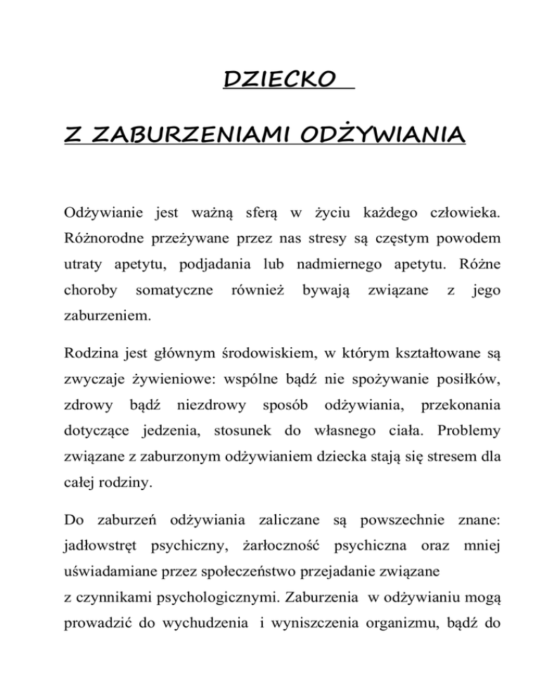 DZIECKO Z ZABURZENIAMI ODŻYWIANIA Odżywianie jest ważną sferą w życiu każdego człowieka. Różnorodne przeżywane przez nas stresy są częstym powodem utraty apetytu, podjadania lub nadmiernego apetytu. Różne choroby somatyczne również bywają związane z jego zaburzeniem. Rodzina jest głównym środowiskiem, w którym kształtowane są zwyczaje żywieniowe: wspólne bądź nie spożywanie posiłków, zdrowy bądź niezdrowy sposób odżywiania, przekonania dotyczące jedzenia, stosunek do własnego ciała. Problemy związane z zaburzonym odżywianiem dziecka stają się stresem dla całej rodziny. Do zaburzeń odżywiania zaliczane są powszechnie znane: jadłowstręt psychiczny, żarłoczność psychiczna oraz mniej uświadamiane przez społeczeństwo przejadanie związane z czynnikami psychologicznymi. Zaburzenia w odżywianiu mogą prowadzić do wychudzenia i wyniszczenia organizmu, bądź do nadwagi i otyłości. Mogą być również przyczyną groźnych dla życia zaburzeń w funkcjonowaniu organizmu (zmiany w narządach, zaburzenia elektrolitowe, zaburzenia nawodnienia organizmu). Obecnie opiekunowie dzieci z zaburzeniami odżywiania, a w szczególności chorych na jadłowstręt psychiczny, dość wcześnie zgłaszają się po pomoc do profesjonalistów. Związane jest to w dużej mierze z popularyzacją wiedzy na ten temat. W rozwoju otyłości szczególną rolę przypisuje się okresowi przedszkolnemu i okresowi dojrzewania, które są określane jako okresy ryzyka rozwoju utrzymywania się otyłości do wieku dorosłego. W przypadku małych dzieci niepokojące są następujące problemy związane z odżywianiem: spożywanie zbyt małych – w stosunku do wieku – ilości pożywienia; odmowa jedzenia zainteresowania – w jedzeniem, porze obrona posiłków przed płac, brak karmieniem, wypluwanie jedzenia, wyjmowanie jedzenia z buzi; odruchy wymiotne, wymioty; lęk w porze posiłków, lęk przed połykaniem pokarmów stałych. Spadek apetytu, kłopoty w odżywianiu i spadek masy ciała u małych dzieci ( do 6 roku życia) mogą mieć podłoże czyli nieorganiczne, związane są z czynnikami psychologicznymi. Rozpoznaje się je wówczas, gdy u dziecka występują utrwalone (trwające powyżej 1 miesiąca) problemy w przyjmowaniu jedzenia lub uporczywe wymioty. Należy tutaj uwzględnić możliwość występowania przemijających trudności w jedzeniu, które mogą się pojawić w początkowym okresie po pójściu do przedszkola jako przejaw trudności adaptacyjnych i które zazwyczaj nie wymagają interwencji (mijają samoistnie). Jeżeli u dziecka obserwowany jest spadek masy ciała, brak przyrostu masy ciała i wzrostu, bądź w wyniku zaburzeń w odżywianiu pojawiają się jakieś problemy zdrowotne, konieczne jest przeprowadzenie badań diagnostycznych w celu określenia ich przyczyn. W przypadku wykluczenia przyczyny medycznej dziecko będzie wymagało konsultacji psychologicznej. Niepokojące jest również utrwalone (trwające powyżej 1 miesiąca) lub powtarzające się zjadanie substancji niejadalnych (np. farby, tynk, papier, kawałki ubrania) w takiej sytuacji zjadanie rzeczy niejadalnych może być związane z niedoborową dietą (np. z niedoborem wapnia bądź żelaza). Jeżeli odmowa spożywania posiłków w przedszkolu wiązane jest z silnie wyrażonymi i przedłużającymi się problemami adaptacyjnymi (trudność dziecka w rozstawaniu się z rodzicami), należy rozważyć czy powinno się nalegać na jego dalsze uczęszczanie do przedszkola. Dziecko, które nie jest jeszcze gotowe na proces oddzielenia od rodziców na czas pobytu w przedszkolu, może omawiać spożywania posiłków, oczekując na ich powrót. W sytuacji, gdy obserwuje się bardzo nasilone reakcje rozpaczy lub/ i gdy ten stan się przedłuża, należy rozważyć krótszy pobyt dziecka w przedszkolu w celu stopniowej adaptacji. Jeżeli dziecko przejawia wyraźny problem w sposobie odżywiania się, wskazana jest diagnostyka pediatryczna ich przyczyn, a przy braku przyczyn medycznych konsultacja psychologiczna/ terapeutyczna. Gdy dziecko nie zje posiłku w określonym czasie, należy zabrać talerz bez zbędnych komentarzy i emocji. Nie należy okazywać dziecku zbyt dużo uwagi, kiedy odmawia jedzenia, natomiast pochwalić jeżeli zjadło posiłek. W przypadku gdy dziecko odżywia się selektywnie, nie należy go zmuszać do zjadania nieakceptowanych potraw. Wskazanie jest zachęcanie dziecka do spróbowania chociaż niewielkiej ilości nowej dla niego potrawy. Należy je pochwalić za podjęcie próby (Nawe jeżeli dotknie tylko potrawy językiem). Można je zachęcić do jedzenia, mówiąc i pokazując, że potrawa jest smaczna i zdrowa. Obecność innych dzieci, które jedzą daną potrawę z apetytem, może motywować dziecko do przełamania oporów.