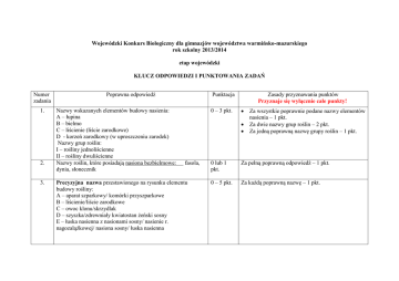 Wojewódzki Konkurs Biologiczny dla gimnazjów województwa warmińsko-mazurskiego rok szkolny 2013/2014 etap wojewódzki KLUCZ ODPOWIEDZI I PUNKTOWANIA ZADAŃ Numer zadania 1. 2. 3. Poprawna odpowiedź Nazwy wskazanych elementów budowy nasienia: A – łupina B – bielmo C – liścienie (liście zarodkowe) D - korzeń zarodkowy (w uproszczeniu zarodek) Nazwy grup roślin: I – rośliny jednoliścienne II – rośliny dwuliścienne Nazwy roślin, które posiadają nasiona bezbielmowe: dynia, słonecznik Zasady przyznawania punktów Przyznaje się wyłącznie całe punkty! Punktacja 0 – 3 pkt. fasola, Precyzyjna nazwa przestawionego na rysunku elementu budowy rośliny: A – aparat szparkowy/ komórki przyszparkowe B – liścienie/liście zarodkowe C – owoc klonu/skrzydlak D – szyszka/zdrewniały kwiatostan żeński sosny E – łuska nasienna z nasionami sosny/ nasienie r. nagozalążkowej/ nasiona sosny/ łuska nasienna Za wszystkie poprawnie podane nazwy elementów nasienia – 1 pkt. Za dwie nazwy grup roślin – 2 pkt. Za jedną poprawną nazwę grupy roślin – 1 pkt. 0 lub 1 pkt. Za pełną poprawną odpowiedź – 1 pkt. 0 – 5 pkt. Za każdą poprawną nazwę – 1 pkt. 4. Ozna czeni e litero we Czynność/zjawisko dotyczące wody A Osmotyczne pobieranie wody/osmoza Transport wody w łodydze B C D Miejsce zachodzenia 0 - 4 pkt. (nazwa organu, strefa organu, rodzaj tkanki, nazwa struktury) Transport wody w liściu lub transpiracja kutykularna (przetchlinki) oraz szparkowa Transpiracja szparkowa/otwieranie i zamykanie aparatów szparkowych/regulacja turgoru Aparat szparkowy 0 – 4 pkt. A jęczmień kłos B owies wiecha Za każdy prawidłowo wypełniony wiersz tabeli (A,B,C,D) – 1 pkt. Wszelkie dodatkowe błędne zapisy i wyjaśnienia powodują utratę punktu. Strefa włośnikowa korzenia Wiązka naczyniowa – drewno/ tkanka przewodząca- drewno Wiązki przewodzące w liściu aparaty szparkowe 5. Nazwa rodzajowa Typ kwiatostanu C pszenica kłos D żyto kłos Za cztery poprawne nazwy rodzajowe zbóż – 2 pkt. Za trzy poprawne nazwy rodzajowe zbóż – 1 pkt. Za cztery poprawnie nazwane kwiatostany – 2 pkt. Za trzy poprawnie nazwane kwiatostany – 1 pkt. 6. Cecha Pinus sylvestris L. Populus tremula Przynależność systematyczna nagonasienne (ze względu na okrycie nasion) 0 – 3 pkt. okrytonasienne Pienność (jednopienna/dwupie nna) jednopienna dwupienna jednopłciowe jednopłciowe Za trzy poprawnie wypełnione wiersze tabeli – 3 pkt. Za dwa poprawnie wypełnione wiersze tabeli – 2 pkt. Za jeden poprawnie wypełniony wiersz tabeli – 1 pkt. Kwiaty (jednopłciowe/obupłc iowe) a) I – C II – B III – A b) Formy buka rosnącego w różnych miejscach są wynikiem zmienności środowiskowej, która nie jest dziedziczna. 0 – 3 pkt. 8. b 9. d 10. c 11. d 12. c 0 lub 1 pkt. 0 lub 1 pkt. 0 lub 1 pkt. 0 lub 1 pkt. 0 lub 1 pkt. 13. A – Prawda B – Prawda C – Prawda D – Prawda 7. 0 – 2 pkt. Za przyporządkowanie miejsc występowania do rysunku drzewa – 1 pkt. Za w pełni poprawne uzupełnienie zdania – 2 pkt. Za poprawne wpisanie jednego brakującego pojęcia – 1 pkt. Za cztery poprawne odpowiedzi – 2 pkt Za dwie - trzy poprawne odpowiedzi – 1 pkt 14. 15. 16. b a 0 lub 1 0 lub 1 HORMON WZROSTU (somatotropina) GLUKAGON PARATHORMON TYMOZYNA Gruczoł (cyfra) Funkcja (litera) Gruczoł (cyfra) Funkcja (litera) Gruczoł (cyfra) Funkcja (litera) Gruczoł (cyfra) Funkcja (litera) 3 A 5 D 4 B 1 C 17. Odpowiedź.: Kolejność opisanych faz w cyklu miesięcznym: 1 - A, 2 - C, 3 - B, 4 - D (liczy się kolejność) Nazwa fazy opisanej w punkcie A – miesiączka/menstruacja Nazwa fazy opisanej w punkcie B – jajeczkowanie/owulacja 18. a) Ocena prawdziwości stwierdzenia: Stwierdzenie jest nieprawdziwe. Przykładowe argumenty: b) Argument pierwszy: Cewka moczowa u mężczyzn jest dłuższa niż u kobiet. c) Argument drugi: Cewka moczowa pełni odmienne funkcje u różnych płci: U kobiet służy wyłącznie do wydalania moczu /jest wyłącznie odcinkiem układu wydalniczego (moczowego). U mężczyzn cewka moczowa jest częścią układu moczowo-płciowego/ Służy do wydalania moczu oraz nasienia (ejakulatu). 0-4 p. Za każde poprawne dobranie gruczołu i funkcji do każdego z czterech hormonów (kolumny) – 1 pkt. 0-3 p. Za poprawnie ustaloną kolejność faz – 1 pkt. Za poprawnie wpisaną nazwę fazy A – 1 pkt. Za poprawnie wpisaną nazwę fazy B – 1 pkt. 0-3 p. Za poprawna ocenę prawdziwości stwierdzenia – 1 pkt. Za jeden poprawny argument– 1 pkt. Za dwa poprawne argumenty – 2 pkt. 19 c 0 lub 1 pkt. p. Składniki krwi: hematokryt – 55,9% liczba leukocytów – 12,5 tys. / µl glukoza – 150 mg/dl Ciśnienie krwi – 160/92 mm Hg Analiza moczu: pH 8,2 obecność białka 20. I. b) c) d) II. V. b) c) 21. b 0 lub 1 pkt. 22. Grupy krwi osób oznaczonych cyframi: 1 – grupa A lub grupa B 2 – grupa B lub grupa A 3 – Grupa AB 0-3 pkt. 23. Przykładowe uzasadnienie: Kod genetyczny jest uniwersalnym sposobem zapisu (szyfrem) informacji genetycznej i pozostaje niezmienny. Natomiast informacja genetyczna, zapisana za pomocą kodu genetycznego, może ulec zmianie. 0-3 p. Za sześć poprawnie wskazanych punktów – 3 pkt. Za pięć poprawnie wskazanych punktów – 2 pkt. Za cztery poprawnie wskazane punkty – 1 pkt. Za poprawne podanie wszystkich grup krwi (1,2,3) – 3 pkt. Za dwie poprawne odpowiedzi – 2 pkt. Za jedną poprawną odpowiedź – 1 pkt. 0-2 pkt. Za dwa poprawne argumenty - 2 pkt. Za jeden argument – 1 pkt. 24. Znaczenie symboli: A - adenina T - tymina C - cytozyna G - guanina D – cukier deoksyryboza P – reszta kwasu fosforowego (fosforanowa) 25. 26 27 27. a b a Przykładowe argumenty za tym, że koszenie łąk zapobiega degradacji tych ekosystemów: Argument I: Koszenie łąk eliminuje lub powstrzymuje niekorzystną sukcesję naturalną (zarastanie). Argument II: Koszenie łąk umożliwia roślinności łąkowej l