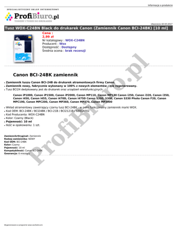 Informacje o produkcie Utworzono 02-03-2017 Tusz WOX-C24BN Black do drukarek Canon (Zamiennik Canon BCI-24BK) [10 ml] Cena : 2,99 zł Canon BCI-24BK zamiennik ● ● Zamiennik tuszu Canon BCI-24B do drukarek atramentowych firmy Canon. Zamiennik nowy, fabrycznie wykonany w 100% z nowych elementów - nie regenerowany. Tusz BCI24 dedykowany jest do drukarek oraz urządzeń wielofunkcyjnych: iu r ● o. pl Nr katalogowy : WOX-C24BN Producent : Wox Dostępność : Dostępny Średnia ocena : brak recenzji Canon iP1000, Canon iP1500, Canon iP2000, Canon MP110, Canon MP130 Canon i250, Canon i320, Canon i350, Canon i450, Canon i455, Canon i470D, Canon i475D Canon S200, S300, Canon S330 Photo Canon F20, Canon MPC190, Canon MPC200, Canon MP360, Canon MP370, Canon MP3900 ● ● ● ● of ● Wkład atramentowy zaweirający czarny tusz BCI-24BK - w pełni funkcjonalny zamiennik marki WOX. Kod OEM: BCI-24BK / BCI24BK / BCI-21B / BCI2121B / 6881A002 Kod Producenta: WOX-C24BN Kolor: Czarny (Black) Pojemność: 10 ml Ilość w opakowaniu: 1 szt. iB ● Pr Zamiennik/Oryginał: Zamiennik Rodzaj zamiennika: NOWY Kod OEM: BCI-24BK Kolor: Czarny Pojemność: 10 ml Kompatybilność: Canon BCI-24BK Gwarancja: 6 miesięcy Wygenerowano w programie www.oscGold.com