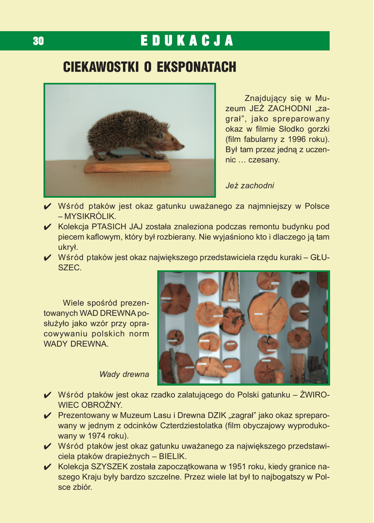30 EDUKACJA CIEKAWOSTKI O EKSPONATACH Znajduj¹cy siê w Muzeum JE¯ ZACHODNI „zagra³”, jako spreparowany okaz w filmie S³odko gorzki (film fabularny z 1996 roku). By³ tam przez jedn¹ z uczennic … czesany. Je¿ zachodni 4 Wœród ptaków jest okaz gatunku uwa¿anego za najmniejszy w Polsce – MYSIKRÓLIK. 4 Kolekcja PTASICH JAJ zosta³a znaleziona podczas remontu budynku pod piecem kaflowym, który by³ rozbierany. Nie wyjaœniono kto i dlaczego j¹ tam ukry³. 4 Wœród ptaków jest okaz najwiêkszego przedstawiciela rzêdu kuraki – G£USZEC. Wiele spoœród prezentowanych WAD DREWNA pos³u¿y³o jako wzór przy opracowywaniu polskich norm WADY DREWNA. Wady drewna 4 Wœród ptaków jest okaz rzadko zalatuj¹cego do Polski gatunku – ¯WIROWIEC OBRO¯NY. 4 Prezentowany w Muzeum Lasu i Drewna DZIK „zagra³” jako okaz spreparowany w jednym z odcinków Czterdziestolatka (film obyczajowy wyprodukowany w 1974 roku). 4 Wœród ptaków jest okaz gatunku uwa¿anego za najwiêkszego przedstawiciela ptaków drapie¿nych – BIELIK. 4 Kolekcja SZYSZEK zosta³a zapocz¹tkowana w 1951 roku, kiedy granice naszego Kraju by³y bardzo szczelne. Przez wiele lat by³ to najbogatszy w Polsce zbiór.